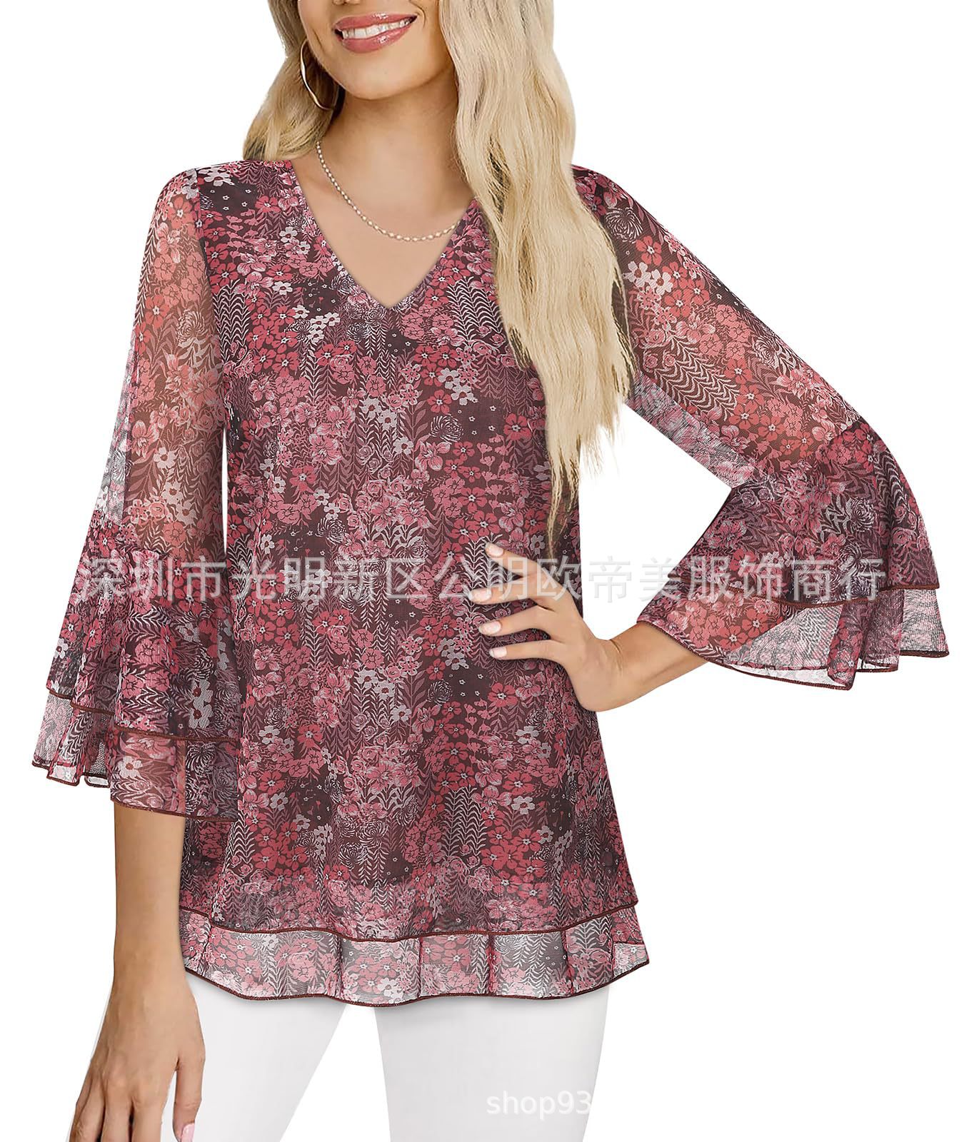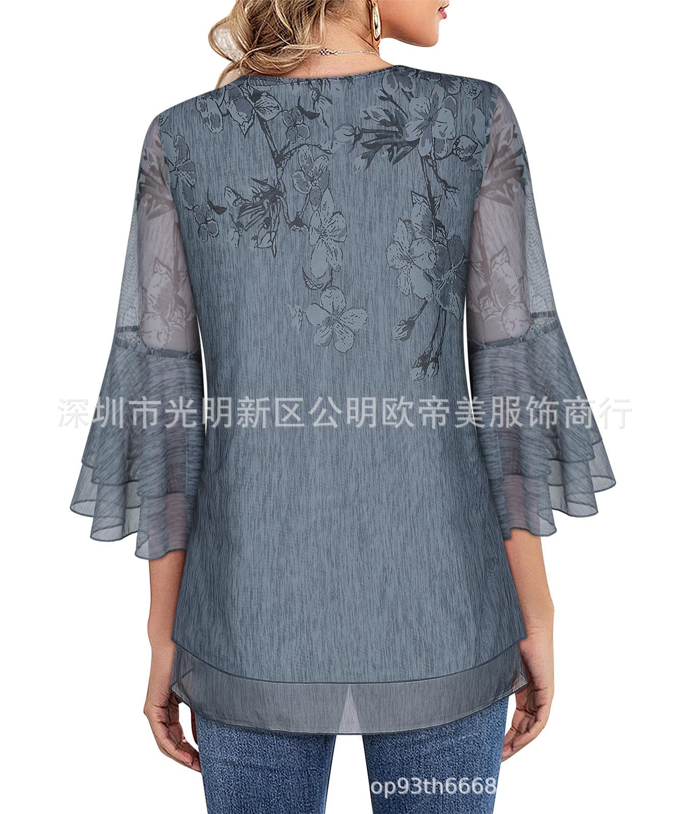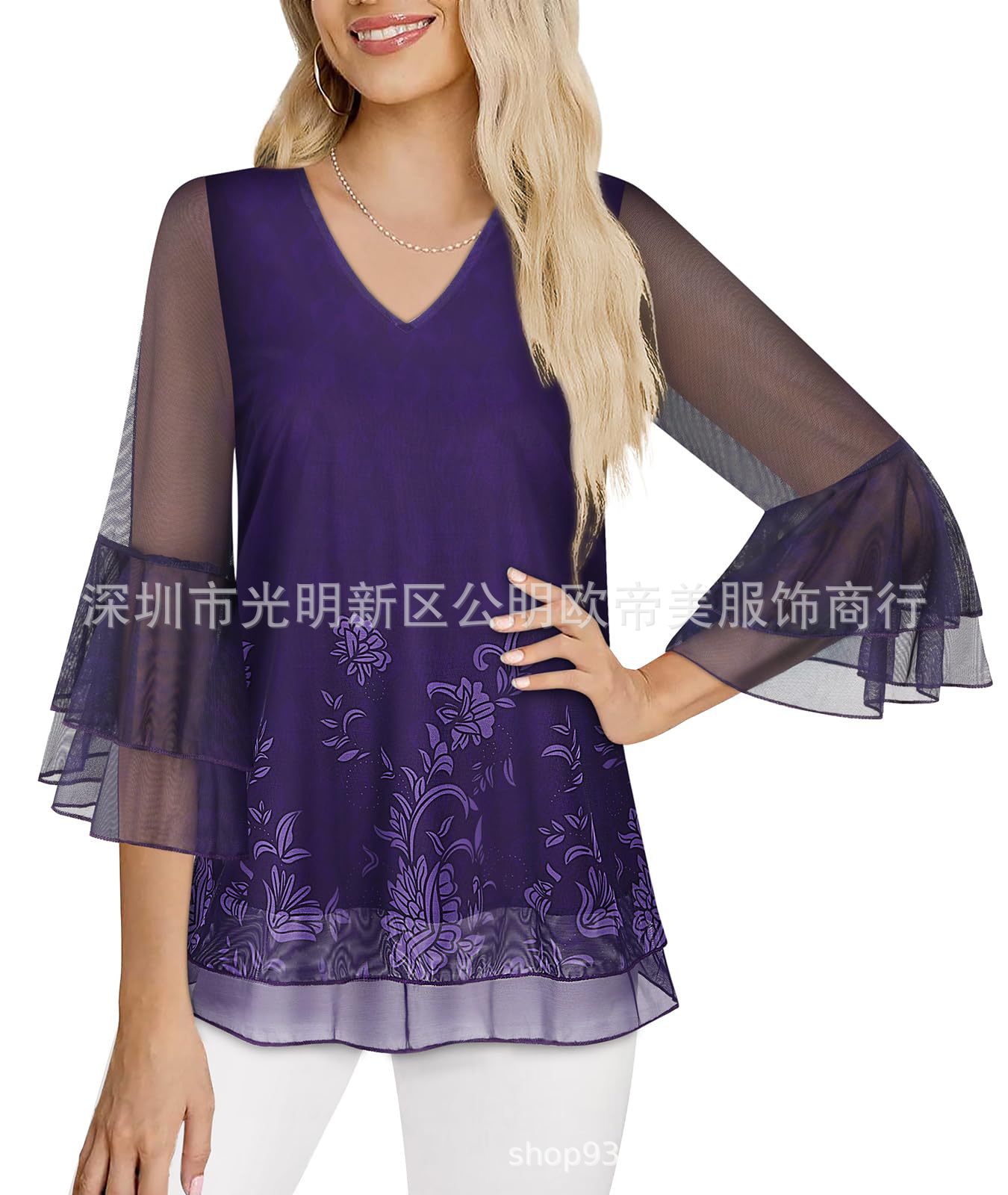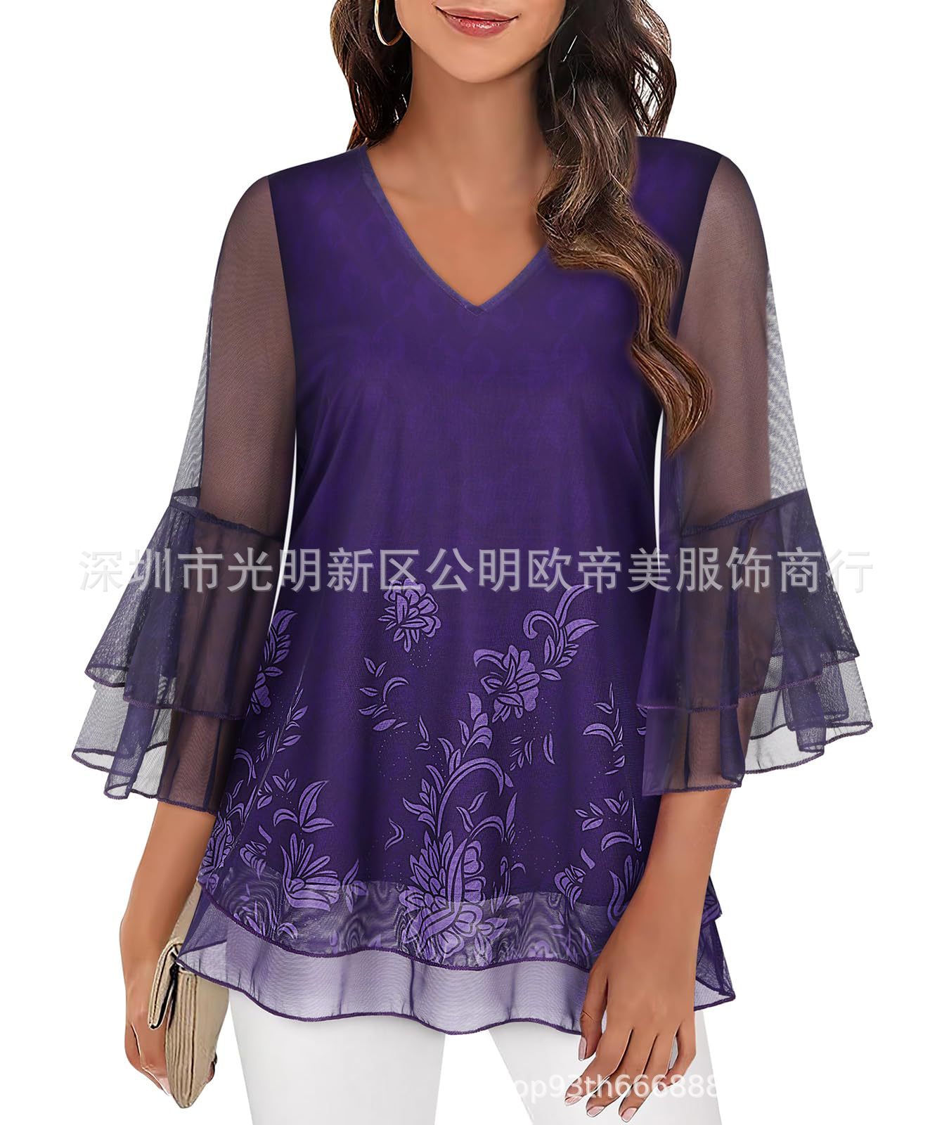 2025 크로스보더 여성 셔츠 3/4 슬리브 탑 우아한 캐주얼 더블 레이어 V 넥 메쉬 쉬폰 튜닉 셔츠