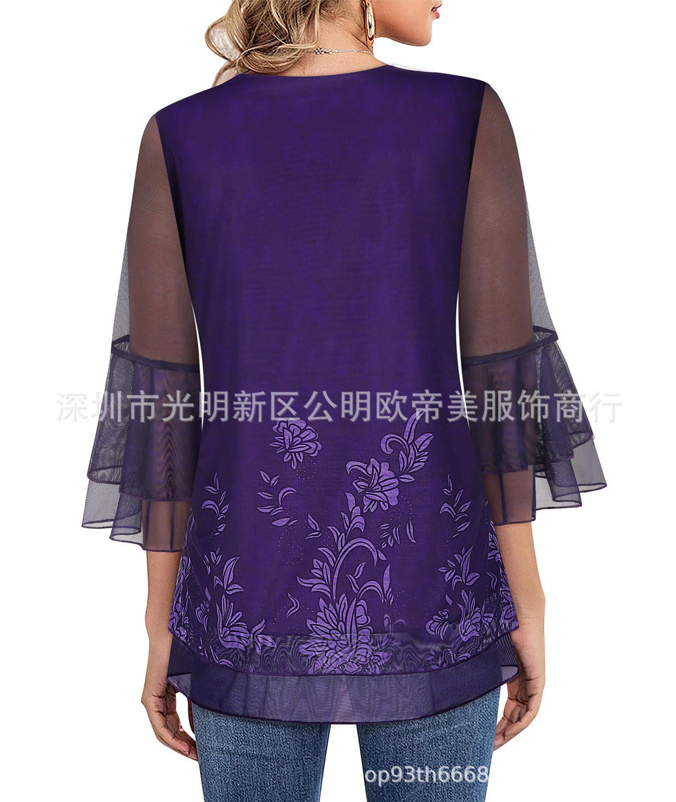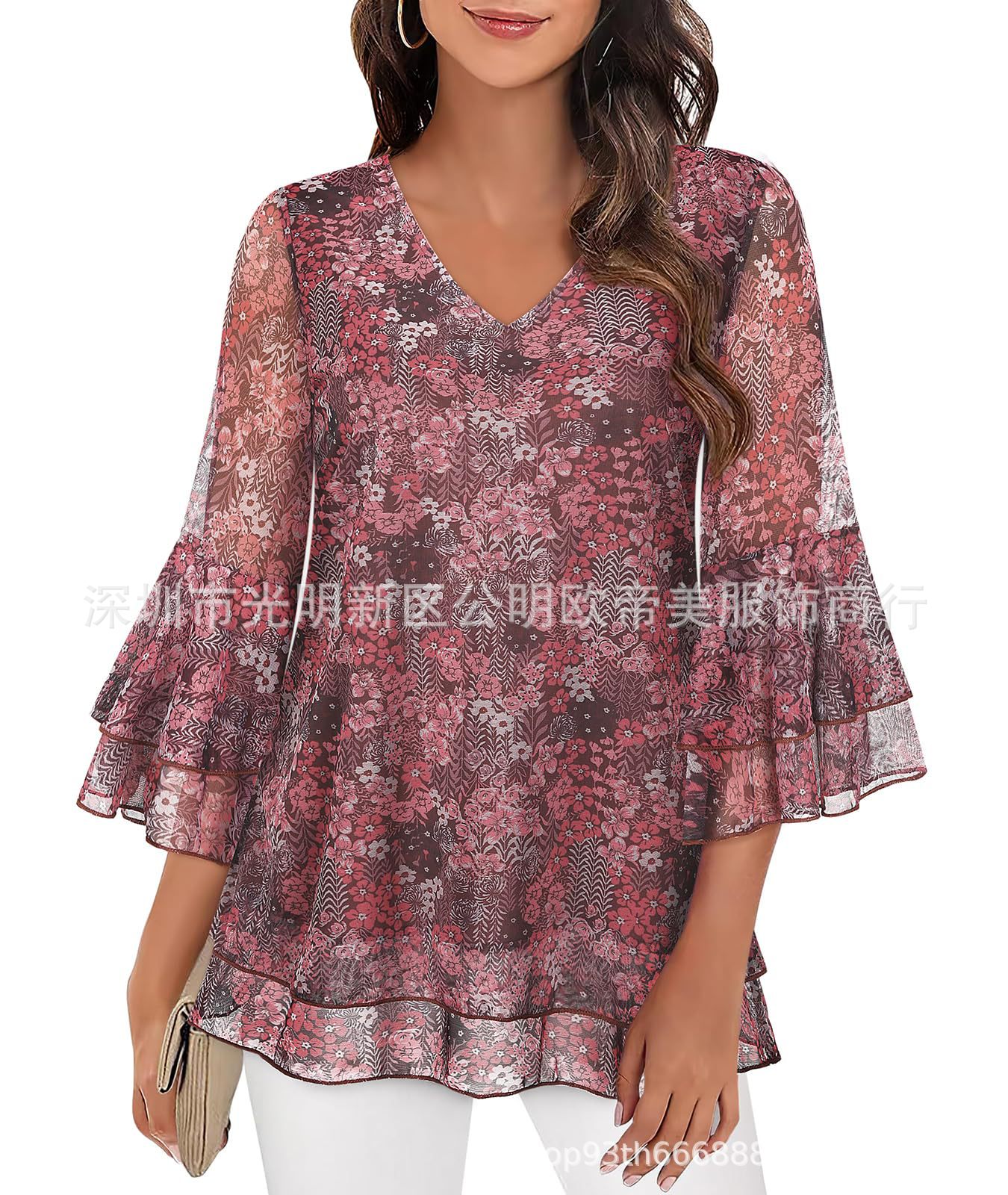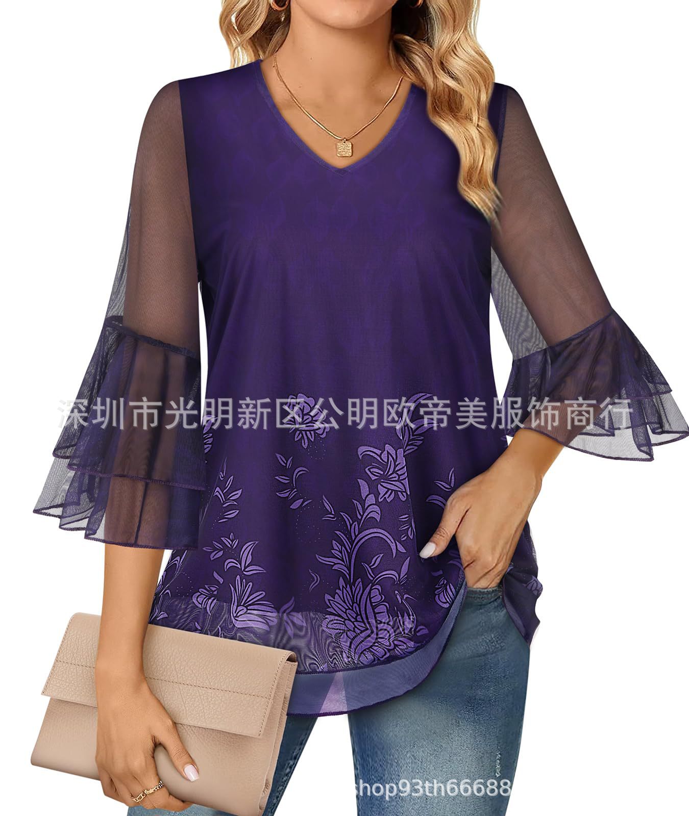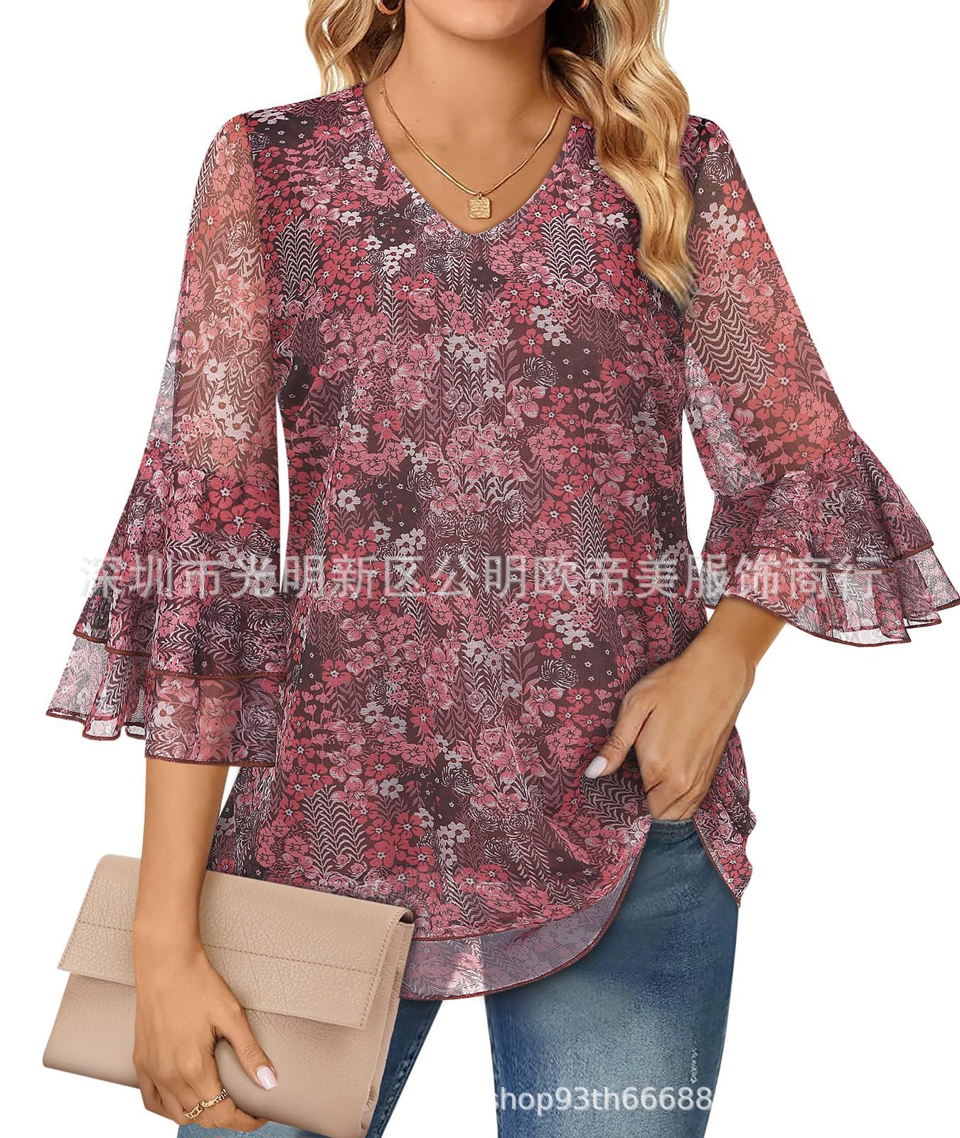 2025 크로스보더 여성 셔츠 3/4 슬리브 탑 우아한 캐주얼 더블 레이어 V 넥 메쉬 쉬폰 튜닉 셔츠