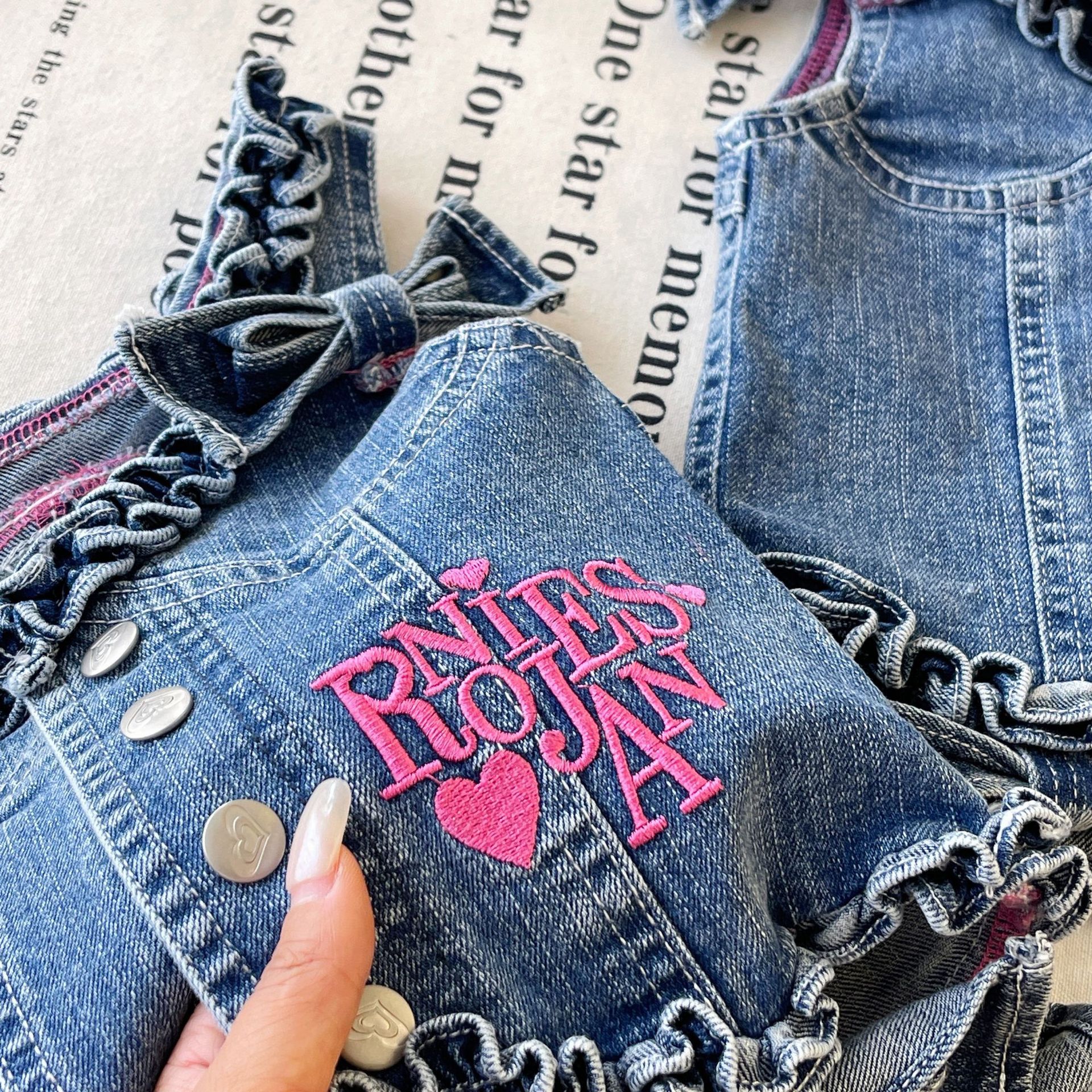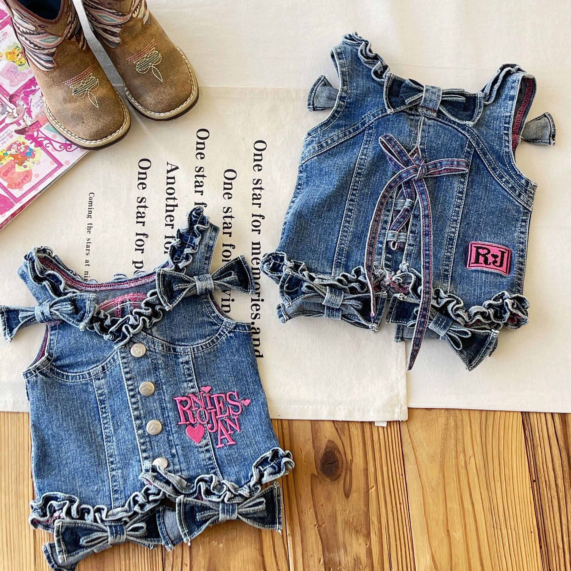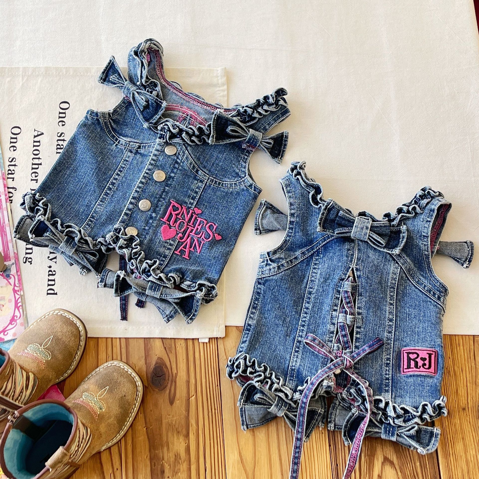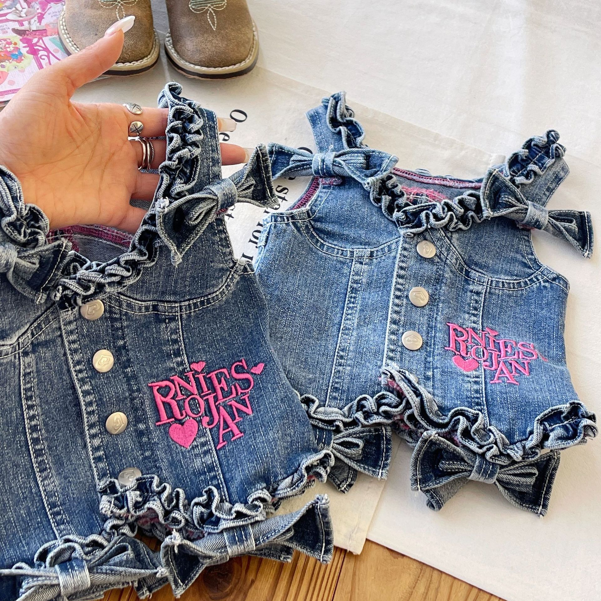 [재고 있음] 일본 아동복 중고 로니 여아 자수 데님 조끼 서스펜더 탑