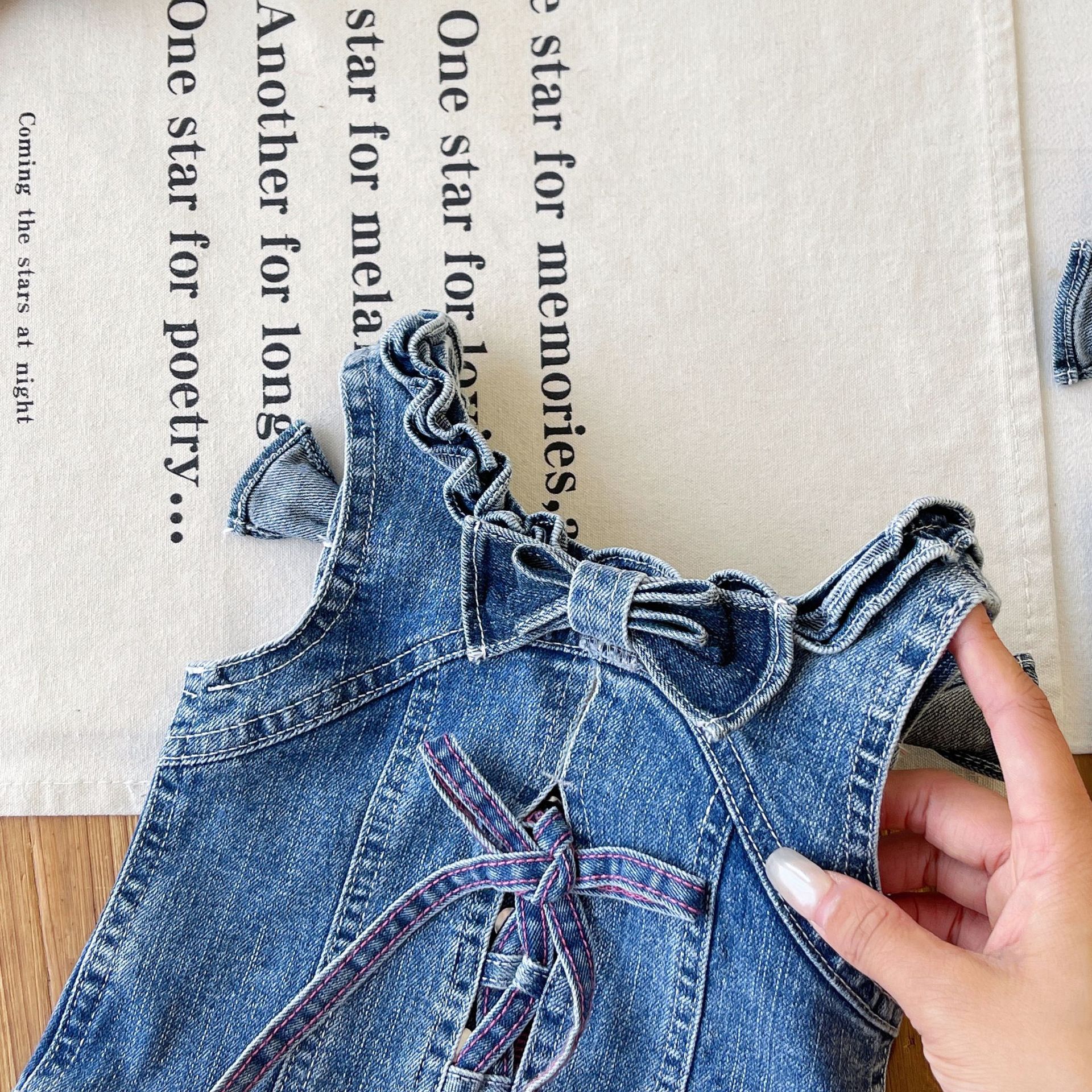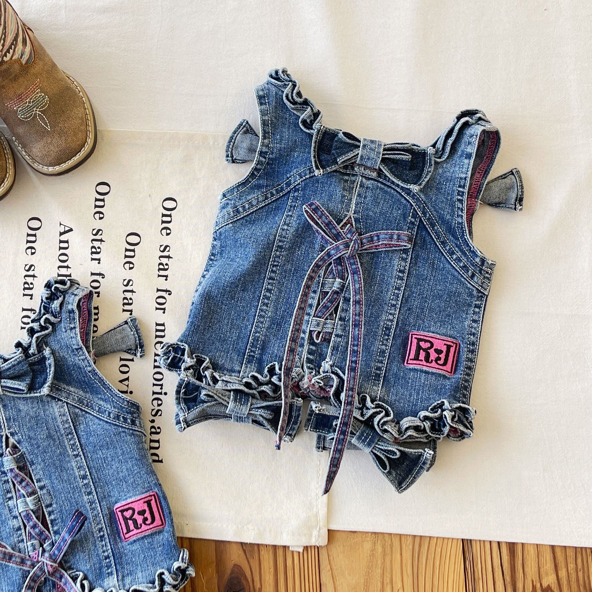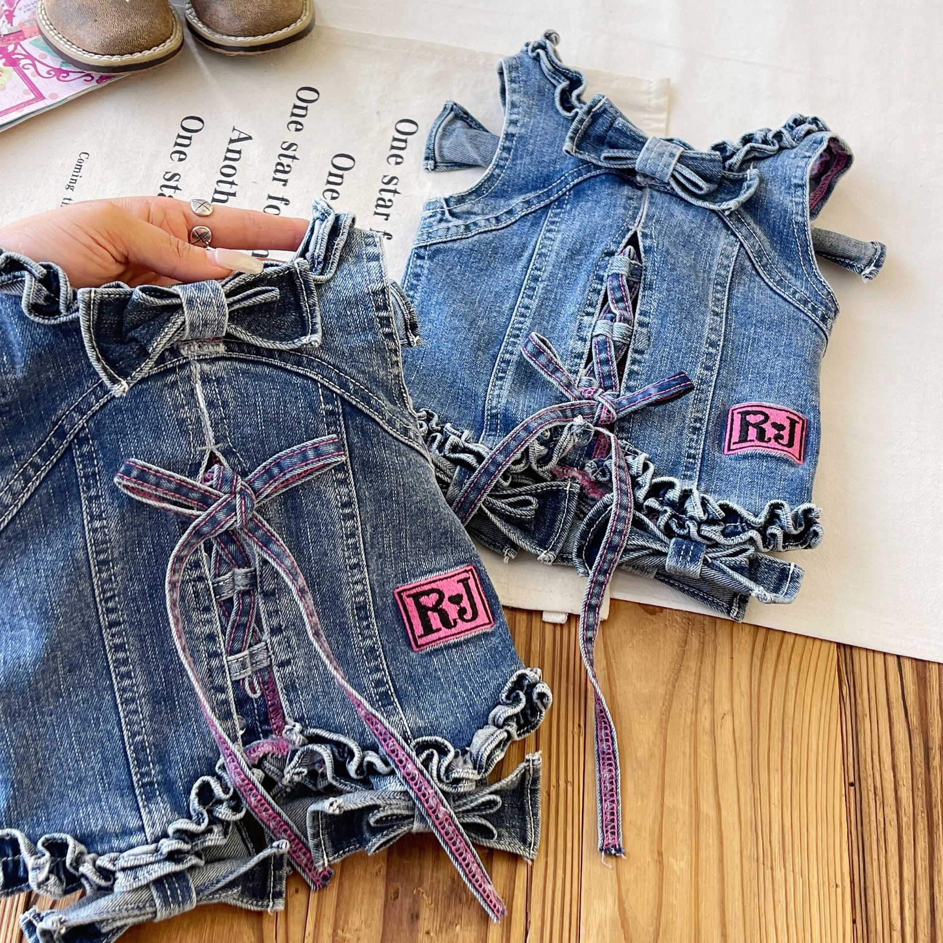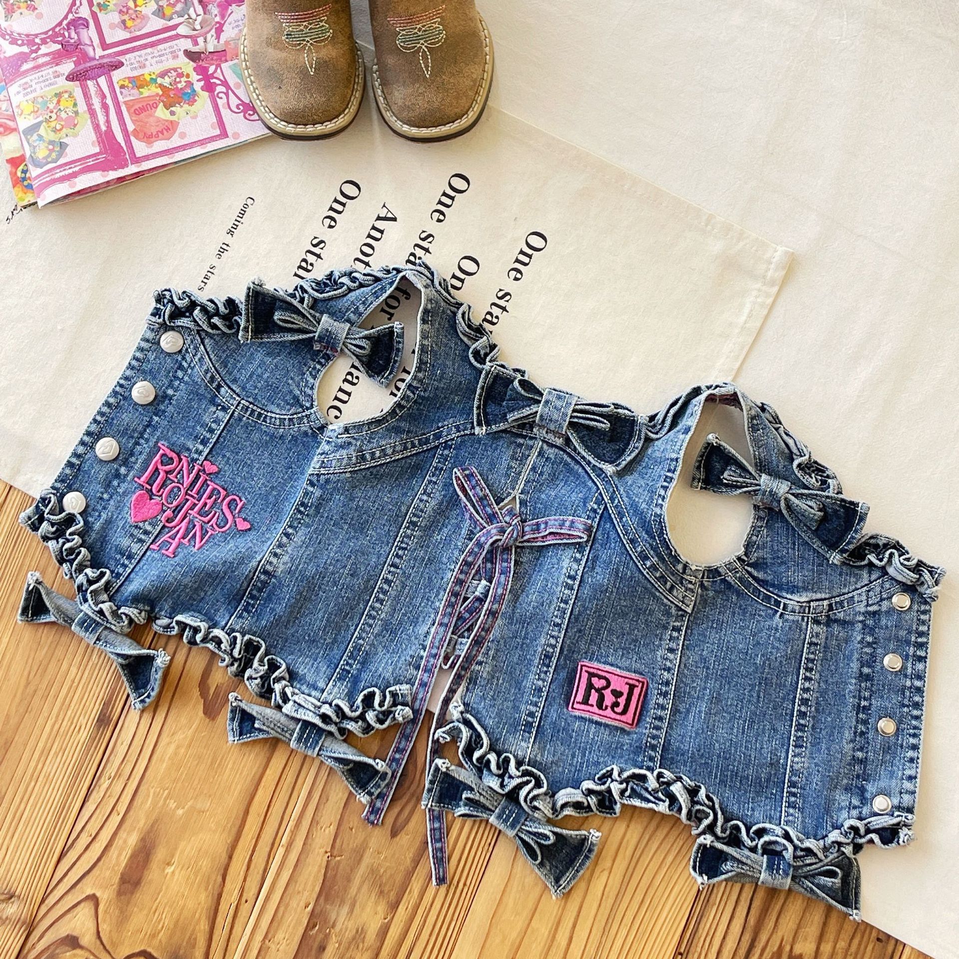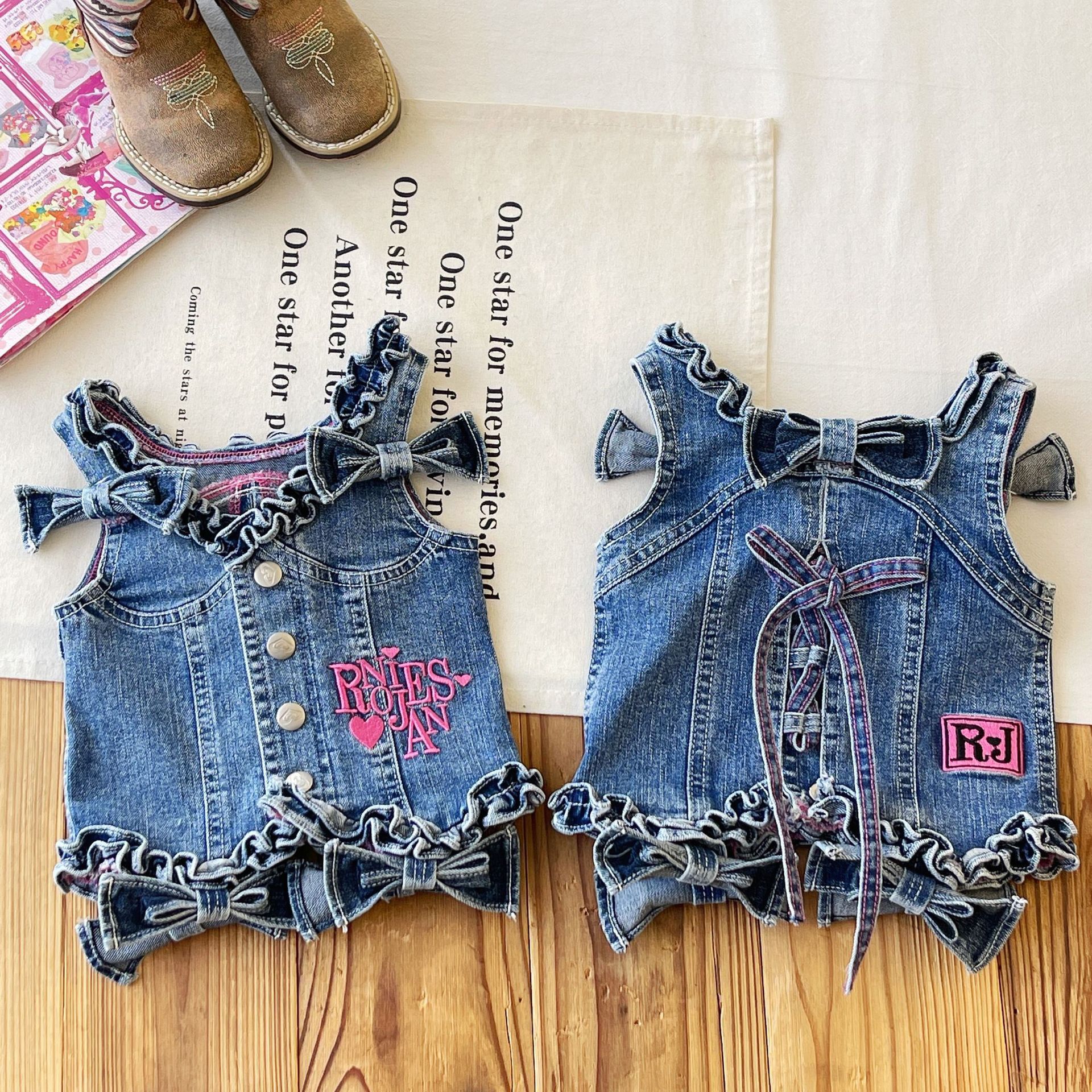 [재고 있음] 일본 아동복 중고 로니 여아 자수 데님 조끼 서스펜더 탑
