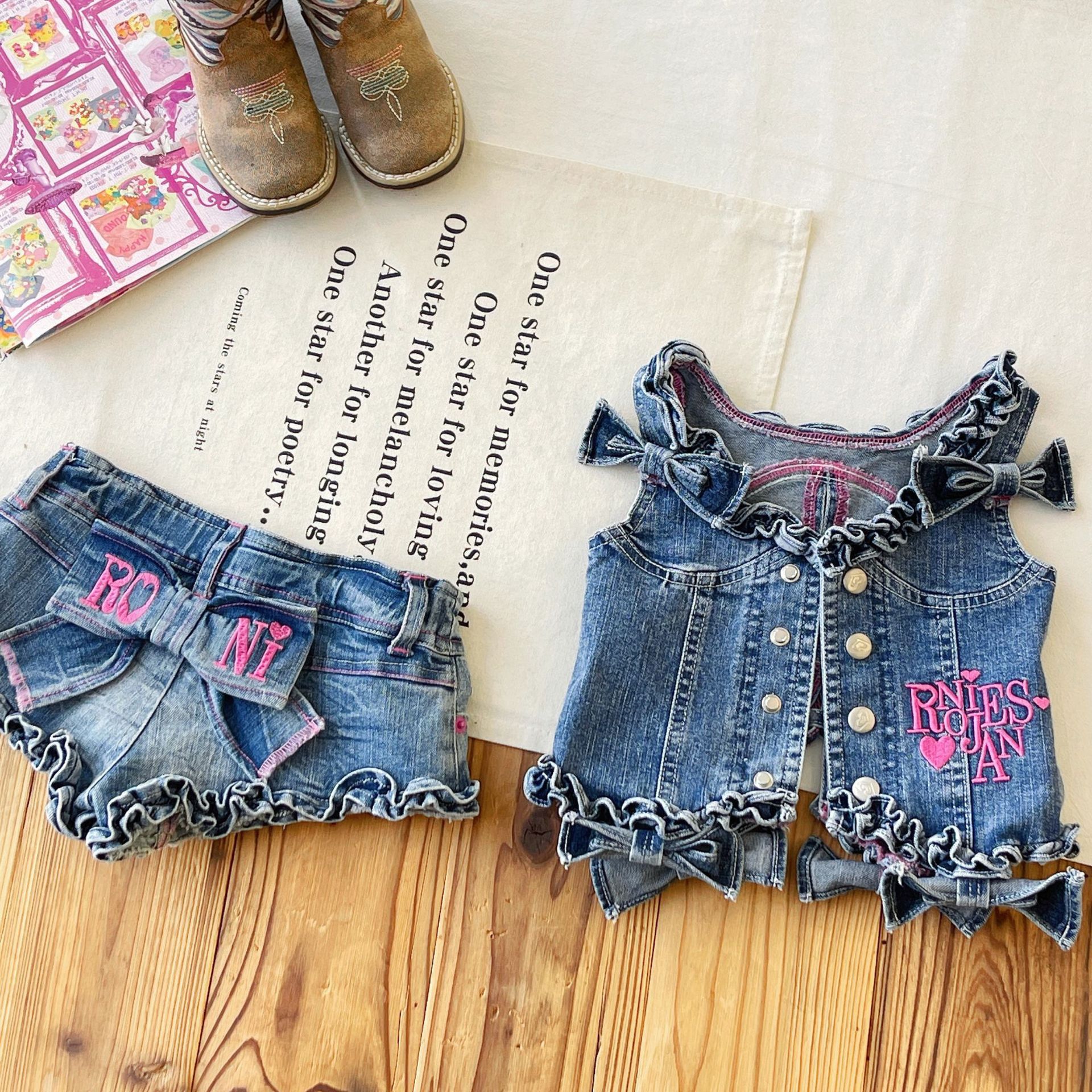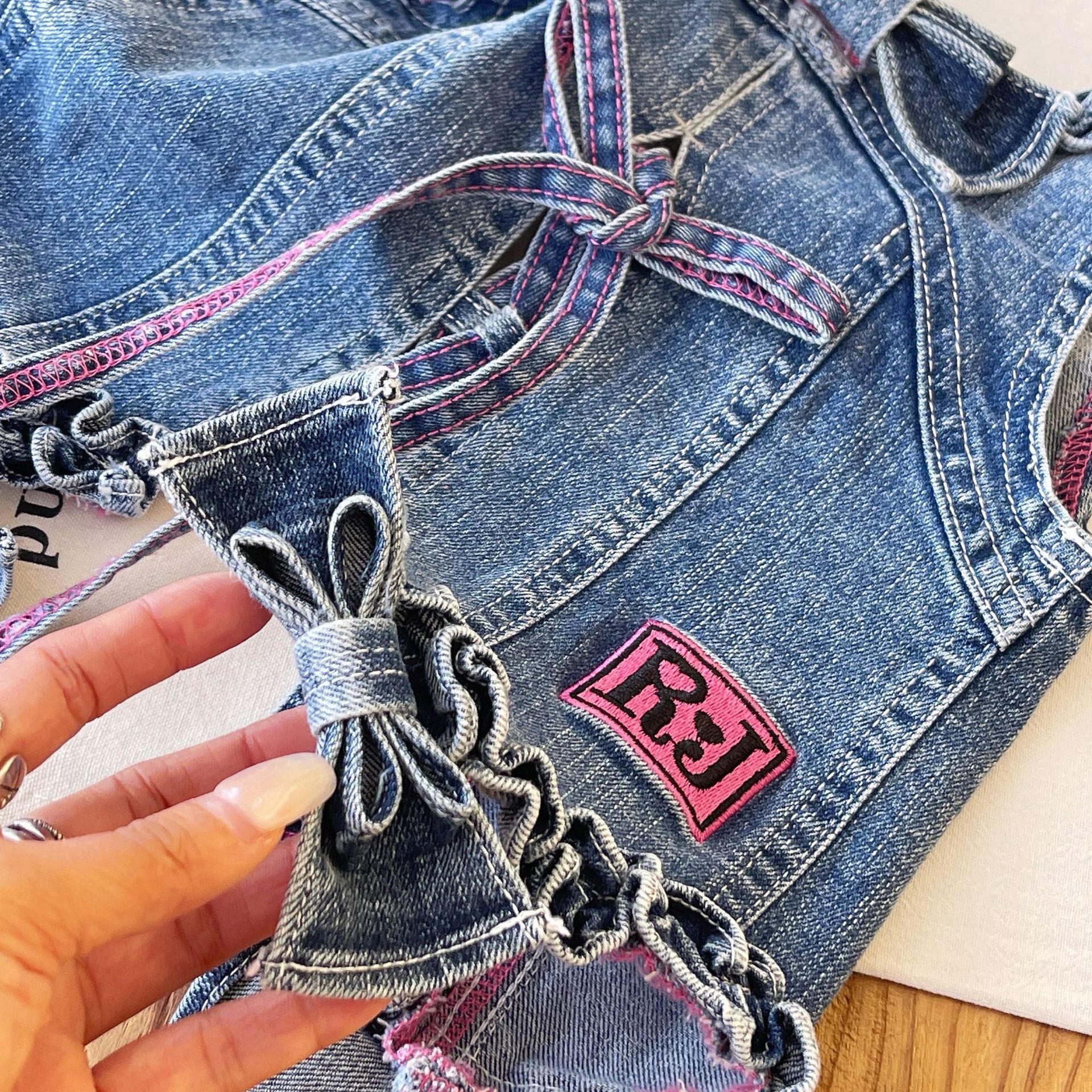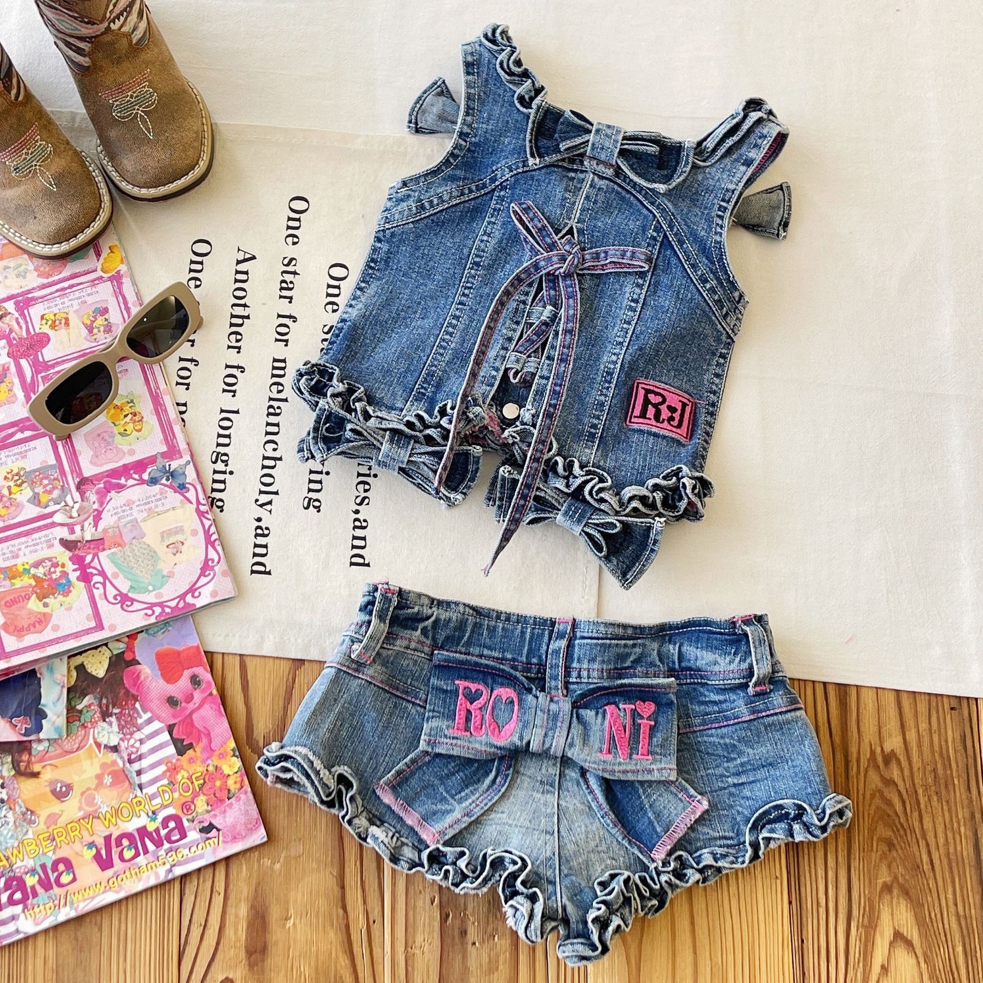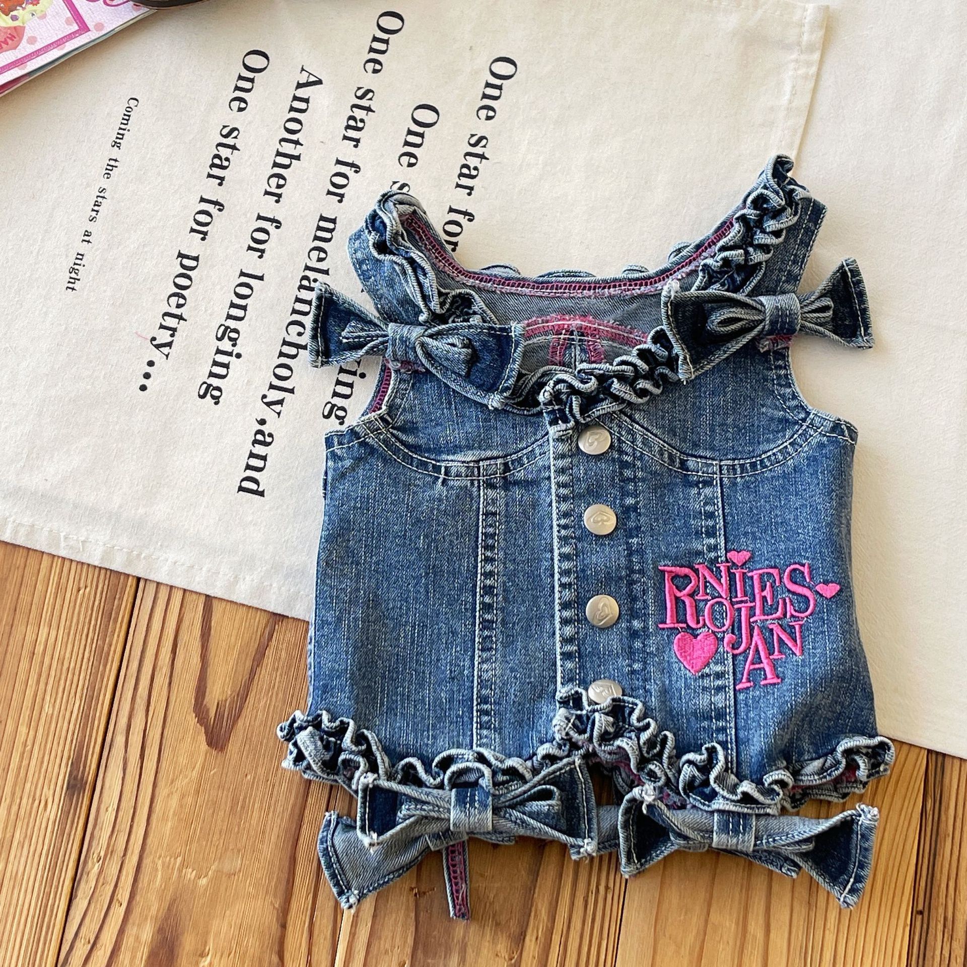 [재고 있음] 일본 아동복 중고 로니 여아 자수 데님 조끼 서스펜더 탑