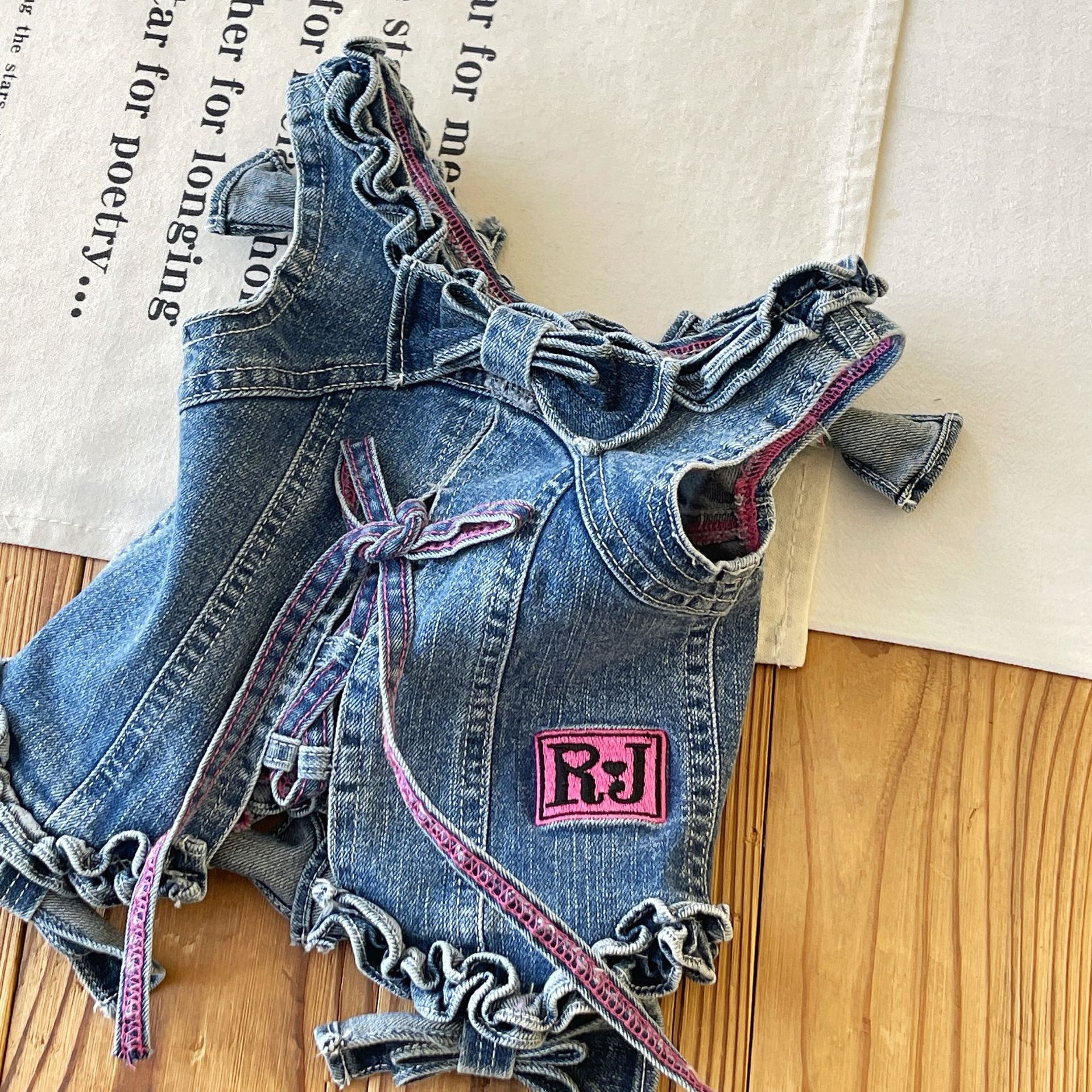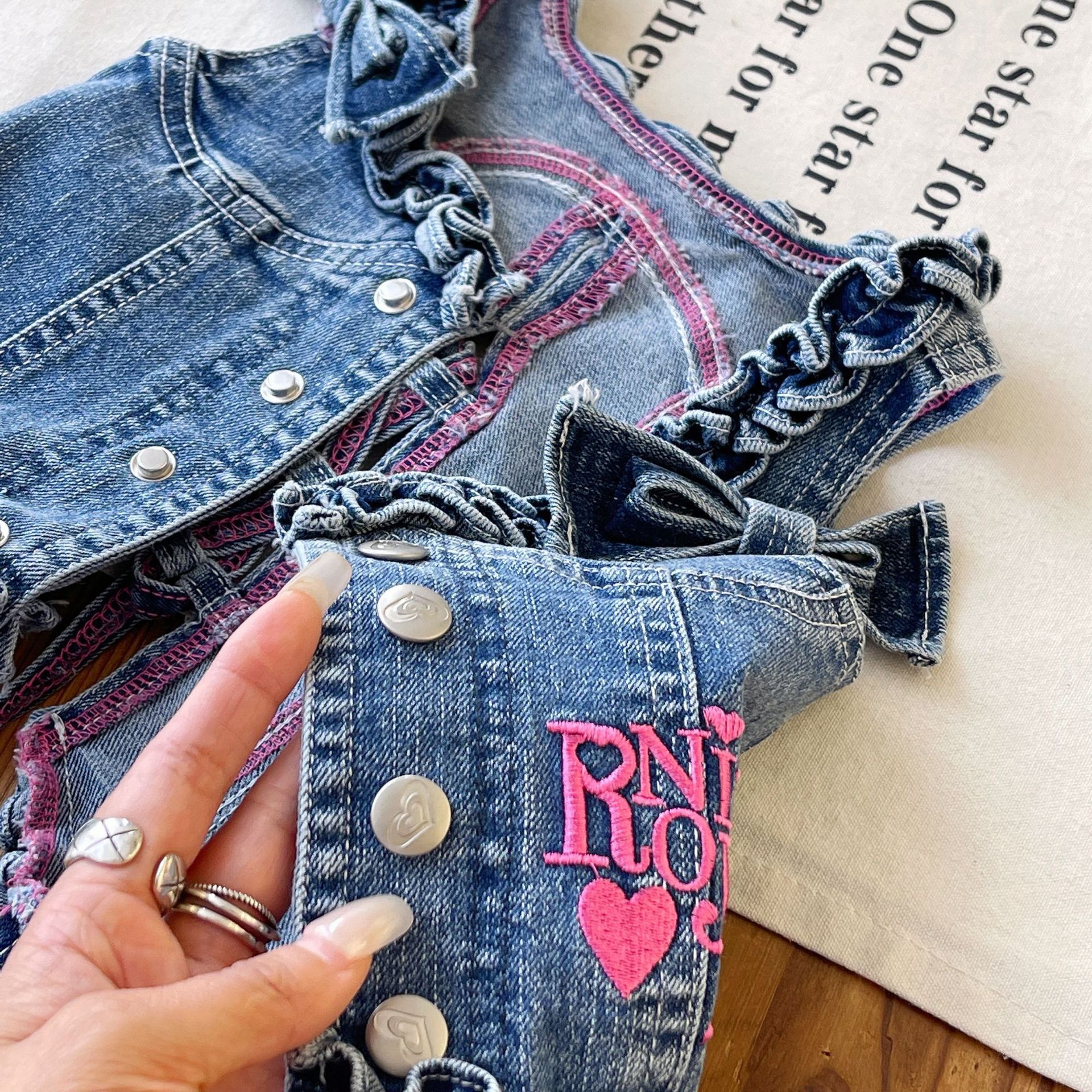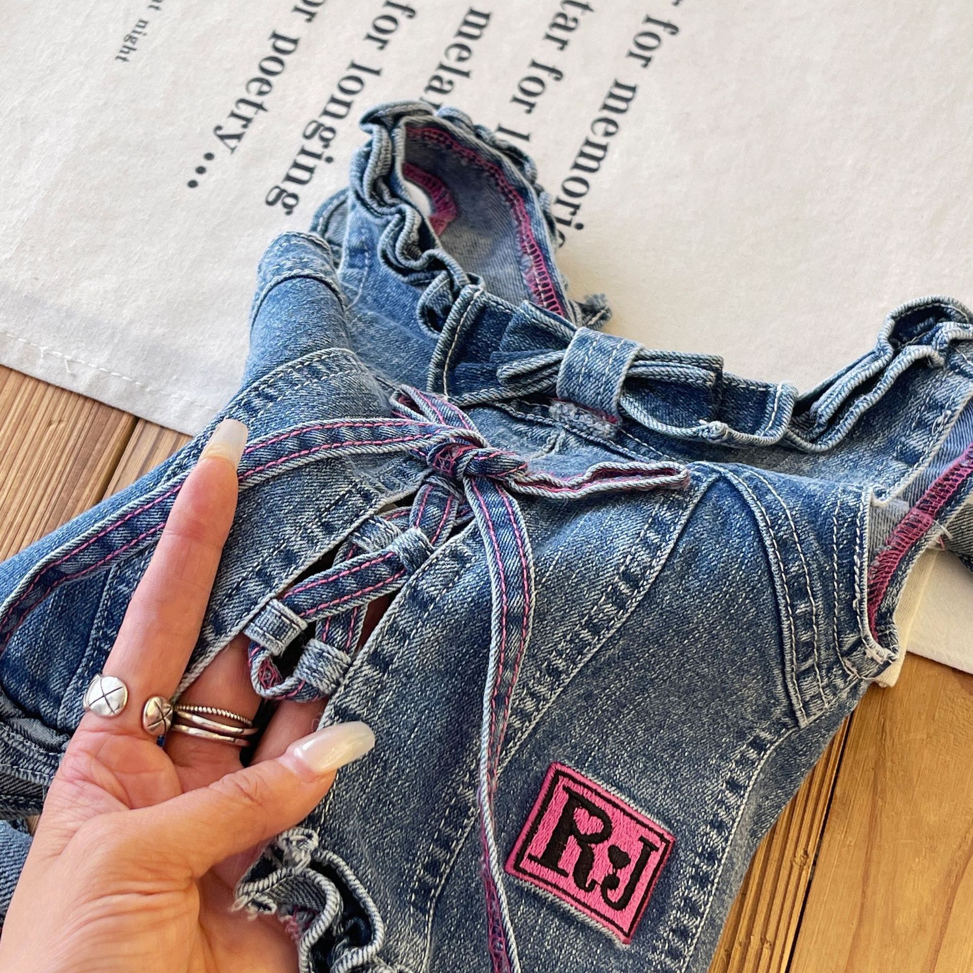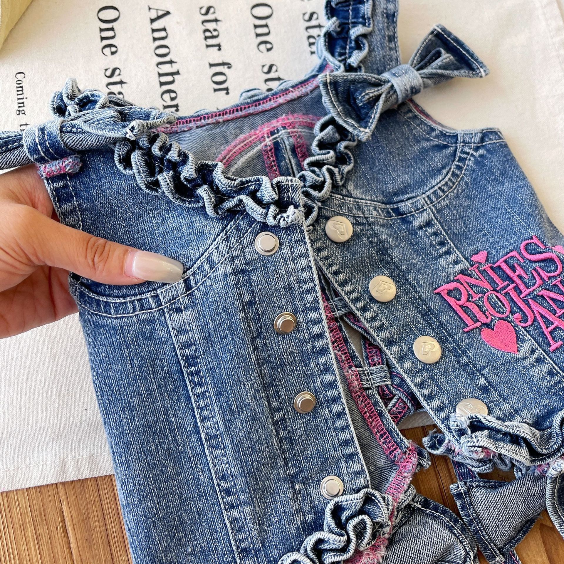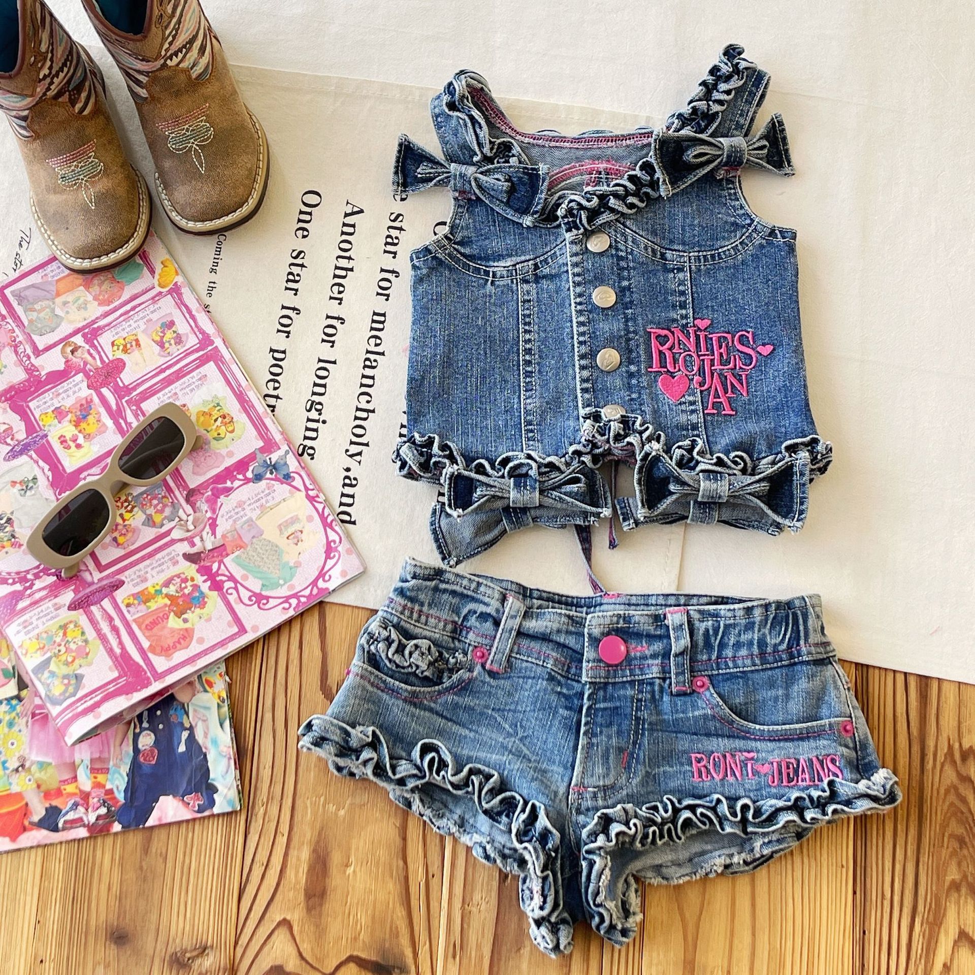 [재고 있음] 일본 아동복 중고 로니 여아 자수 데님 조끼 서스펜더 탑