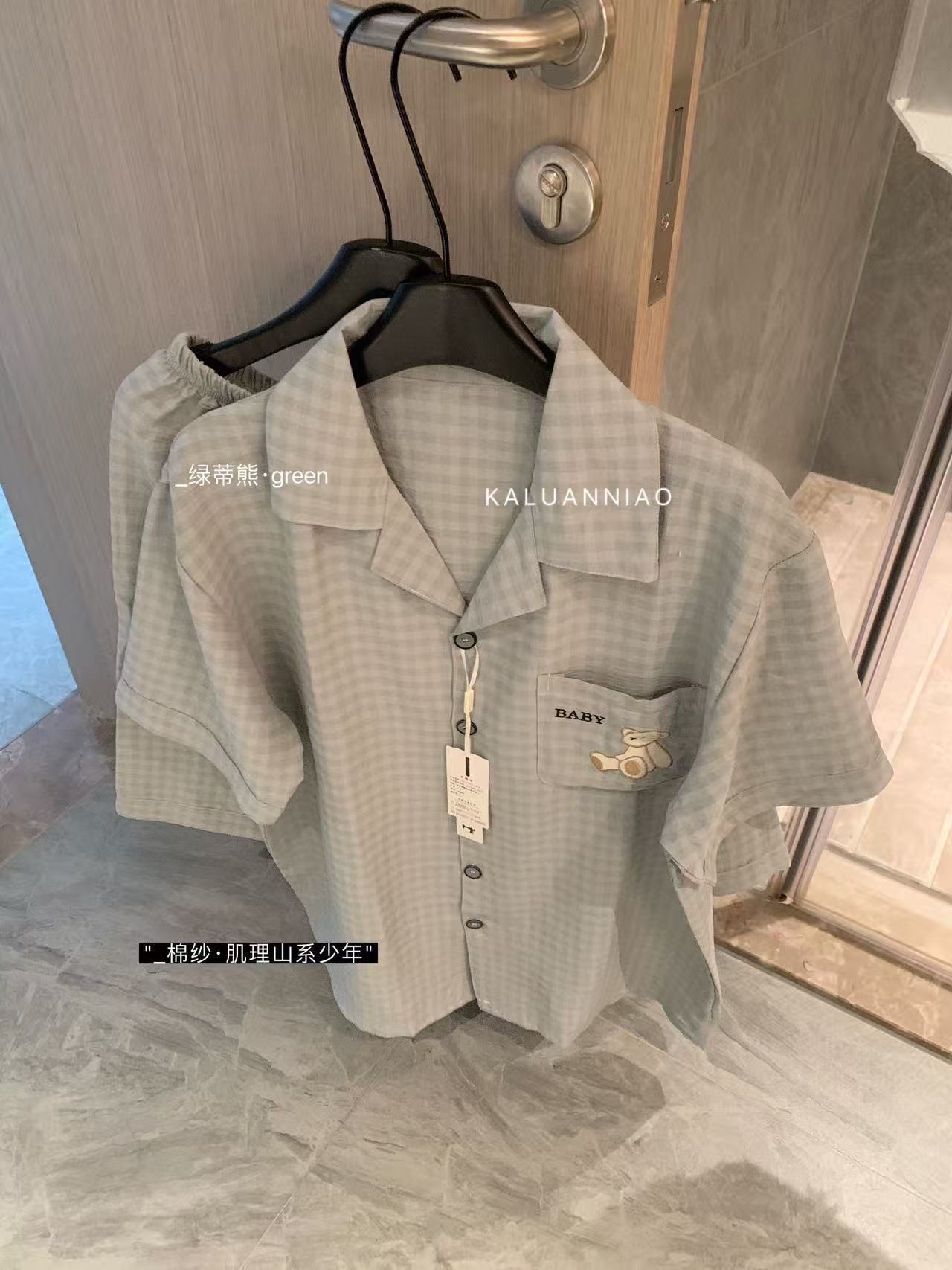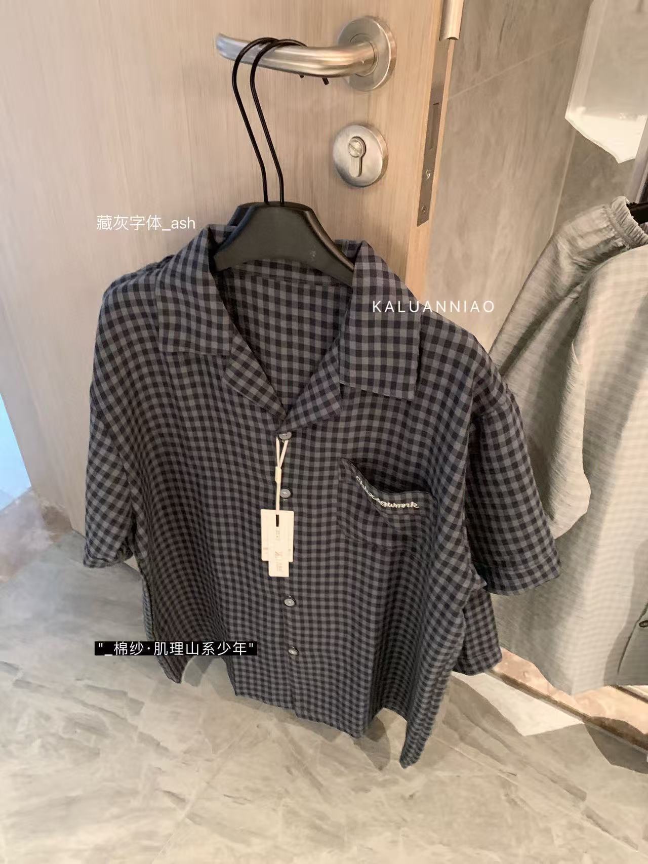 KALUANNIAO 면 거즈 질감 마운틴 스타일 청소년 홈웨어 남성용 여름 루즈 라펠 반팔 체크 무늬 잠옷
