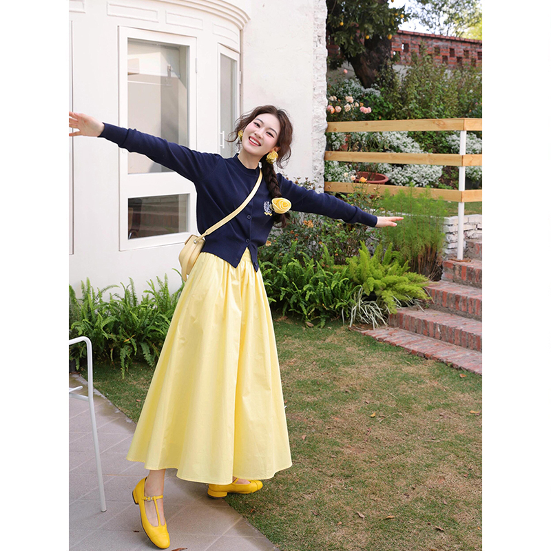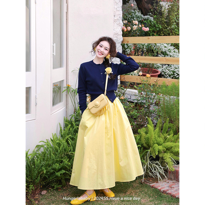 Cross-border Hungerlababy/25SS 봄 신작 레트로 구스 옐로우 A 라인 스커트 다용도 신축성 있는 허리 하프 길이