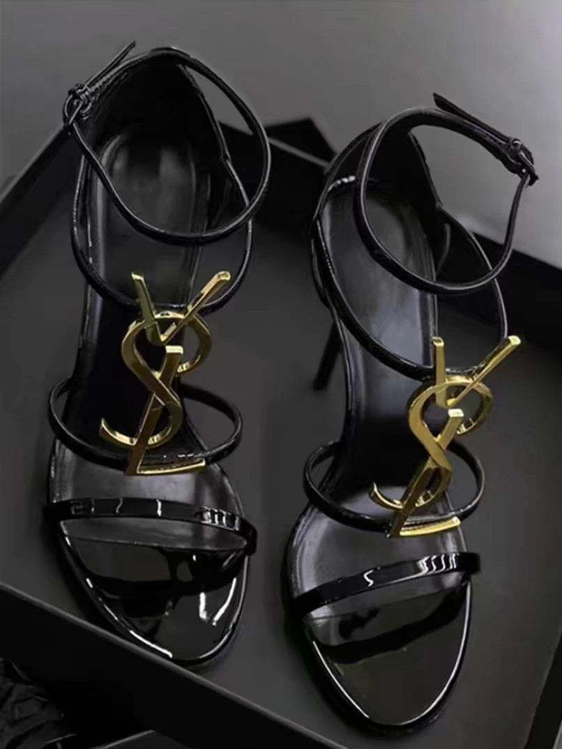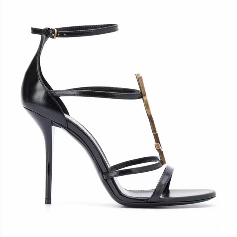 여성을위한 문자가있는 오픈 토우 하이힐 샌들 2025 새로운 광택 특허 가죽 섹시한 기질 블랙 스틸레토 여성 신발스토어 가기