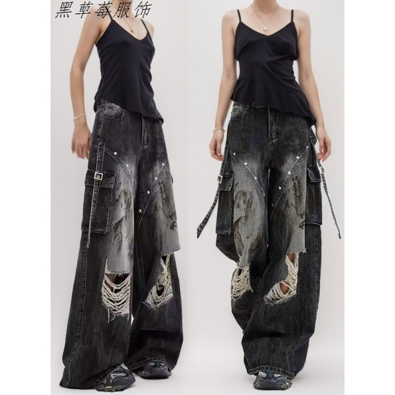 아메리칸 스타일 작업복 찢어진 청바지 여성 가을 겨울 디자인 센스 하위 문화 Y2K 슬림 모양 넓은 다리 바지 플러스 사이즈 통통녀스토어 가기