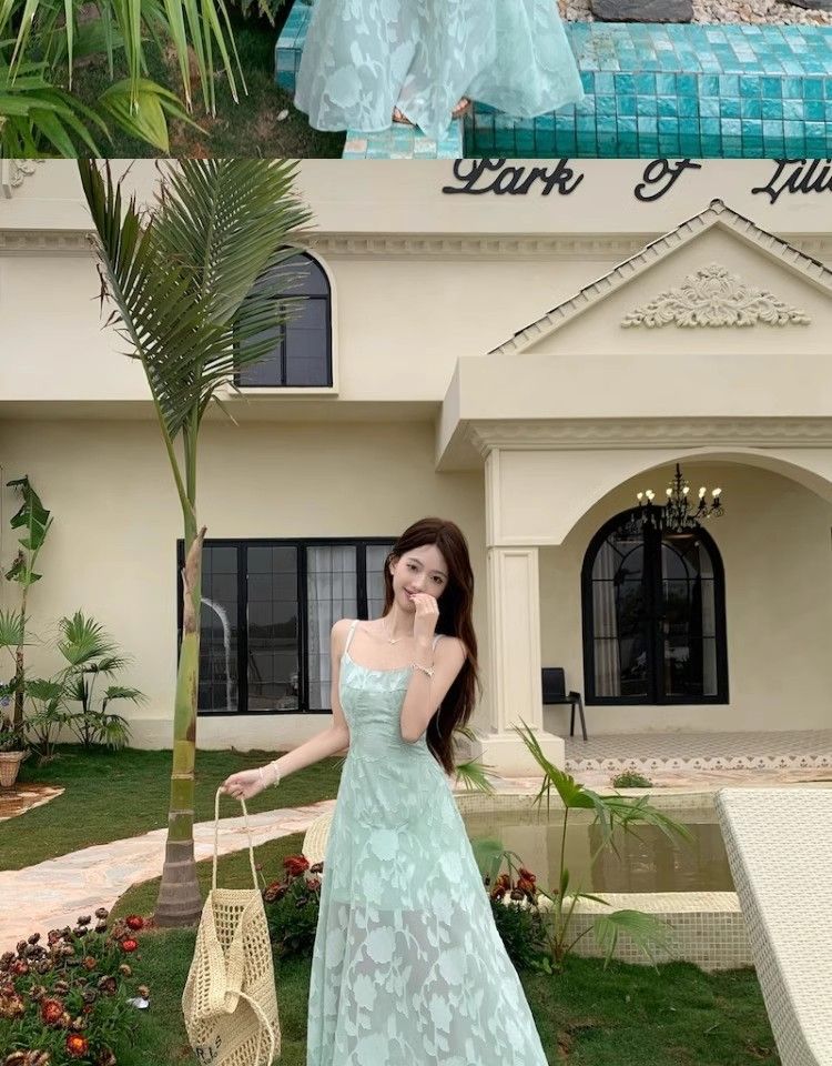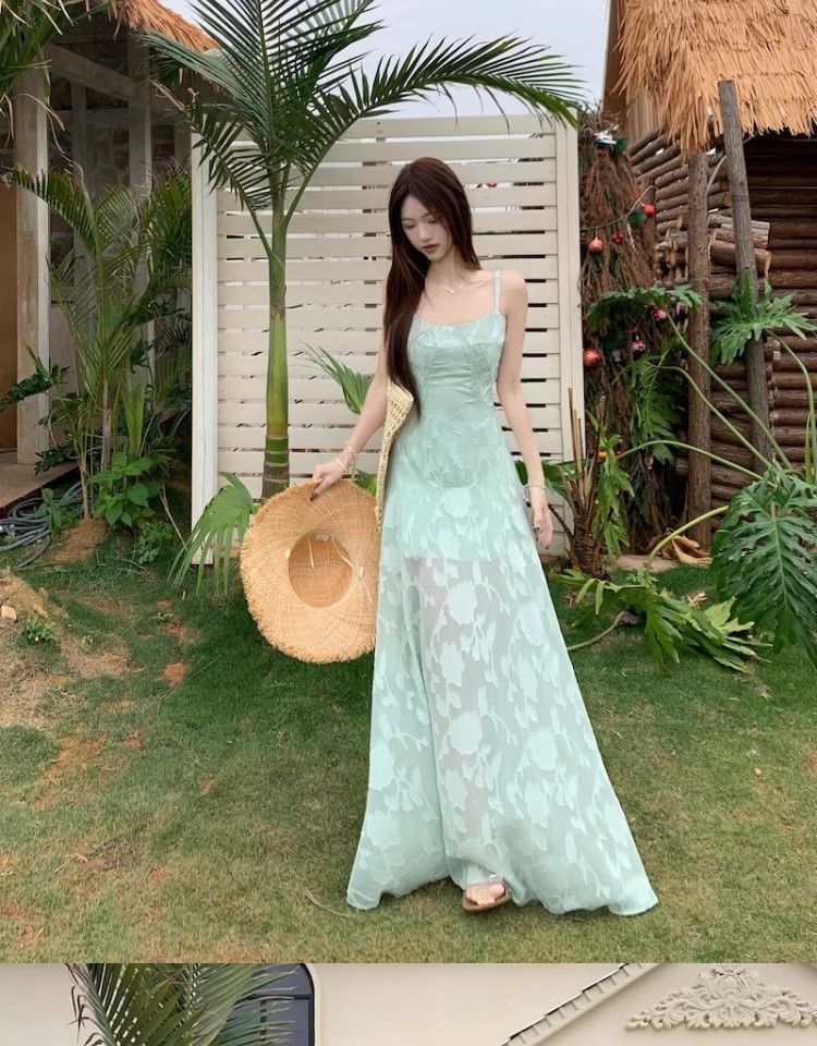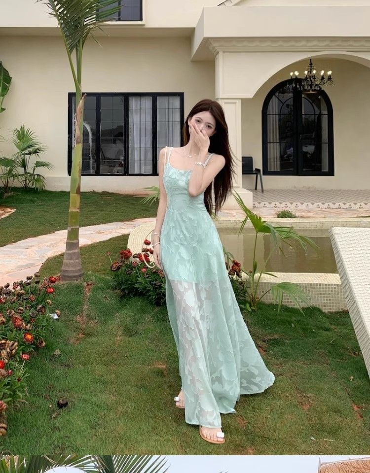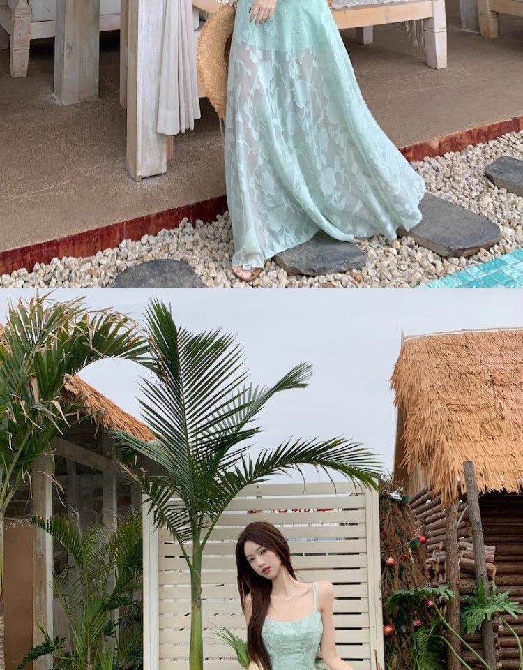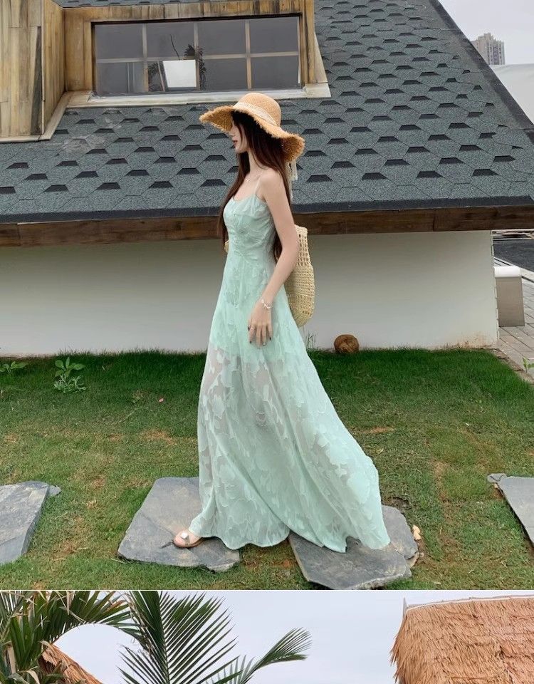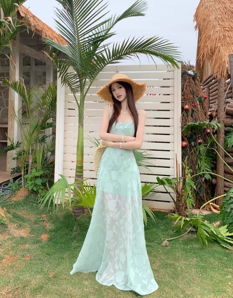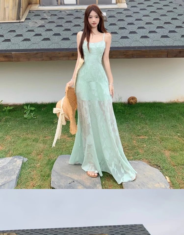 여름 여성용 해변 리조트 스타일 그린 서스펜더 드레스, 메쉬 스플라이싱 허리 슬리밍 스커트, 롱 스커트스토어 가기