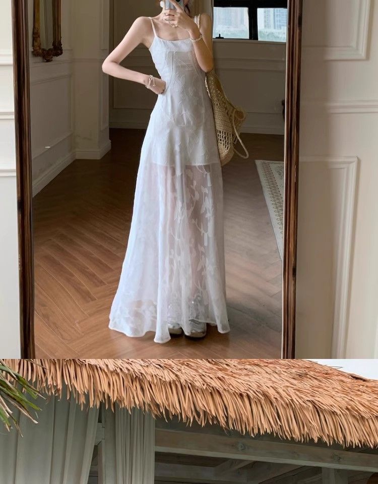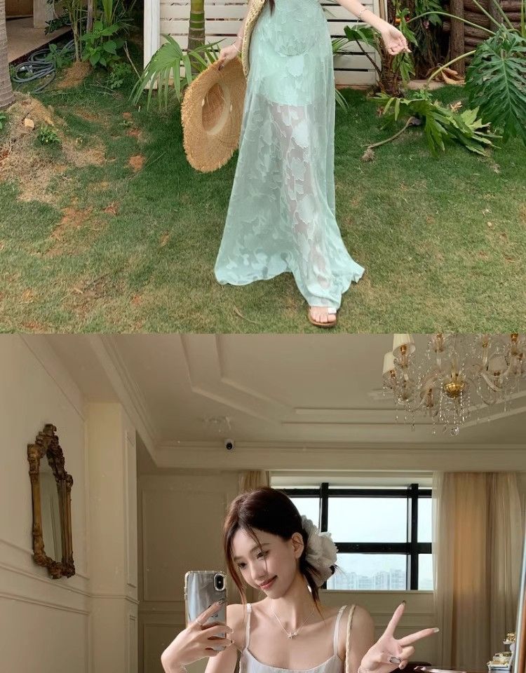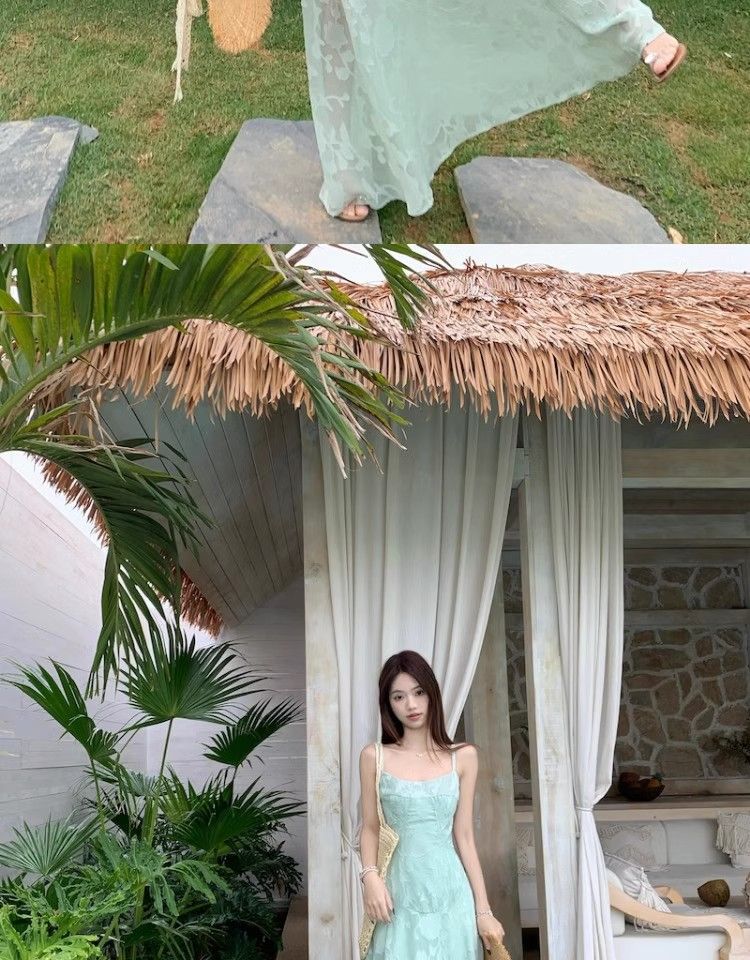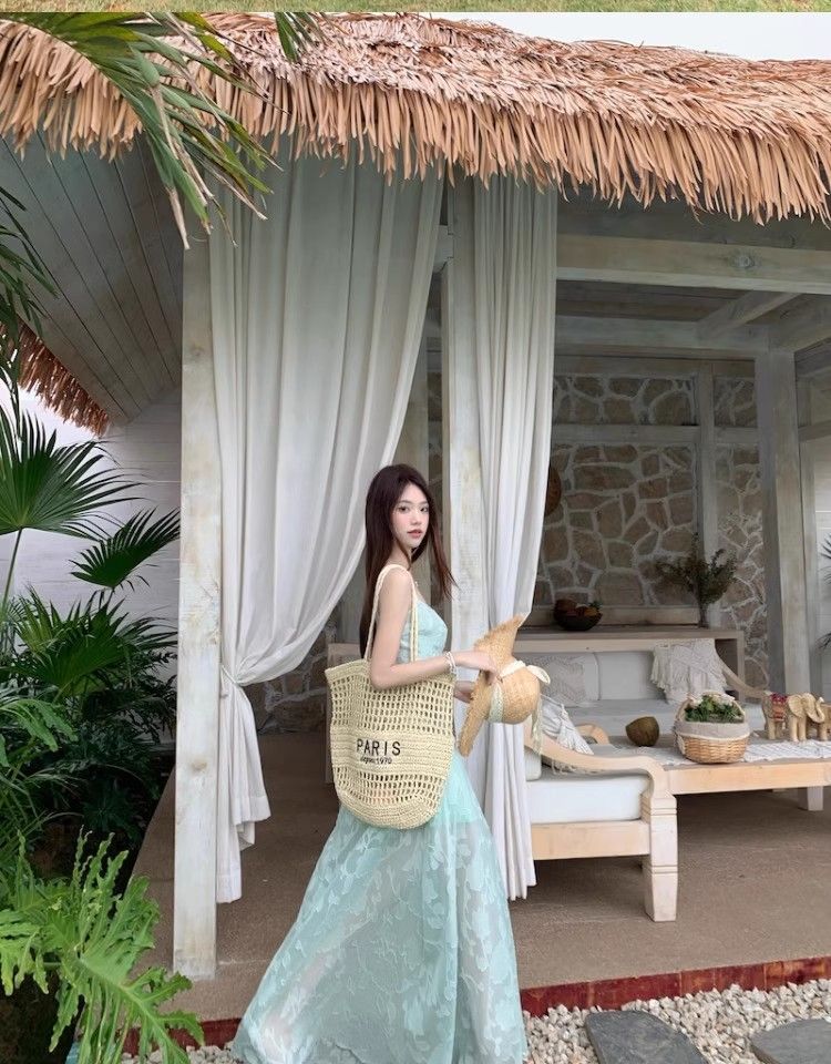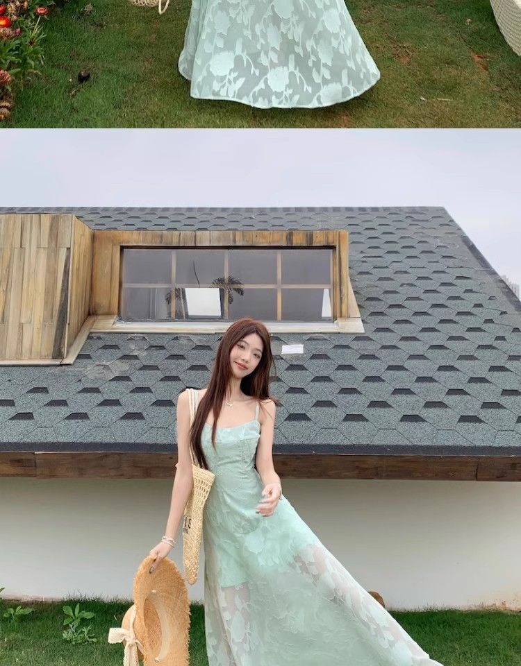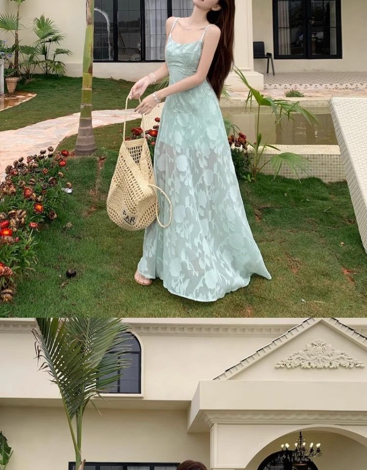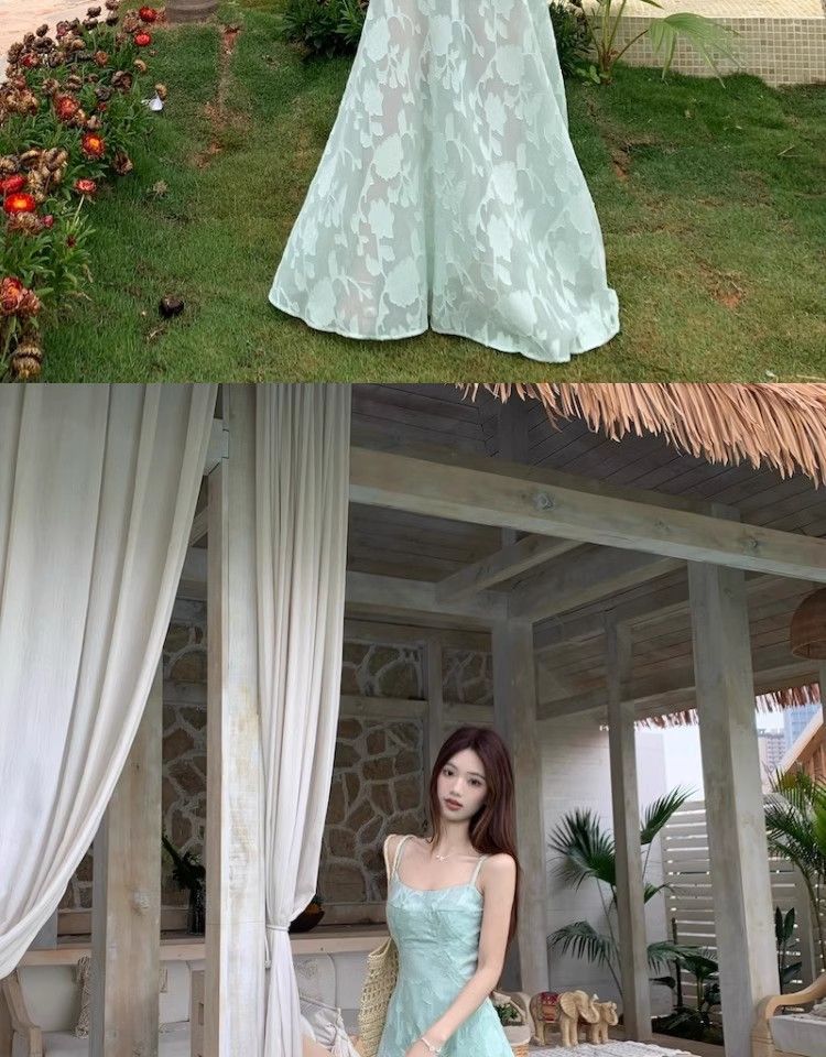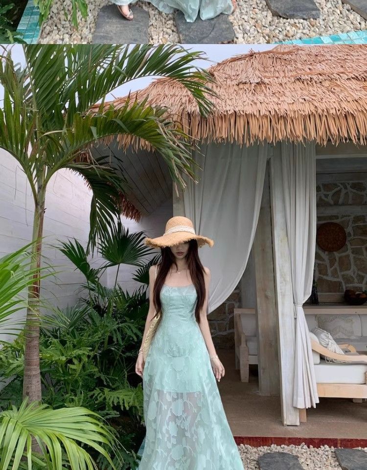 여름 여성용 해변 리조트 스타일 그린 서스펜더 드레스, 메쉬 스플라이싱 허리 슬리밍 스커트, 롱 스커트스토어 가기