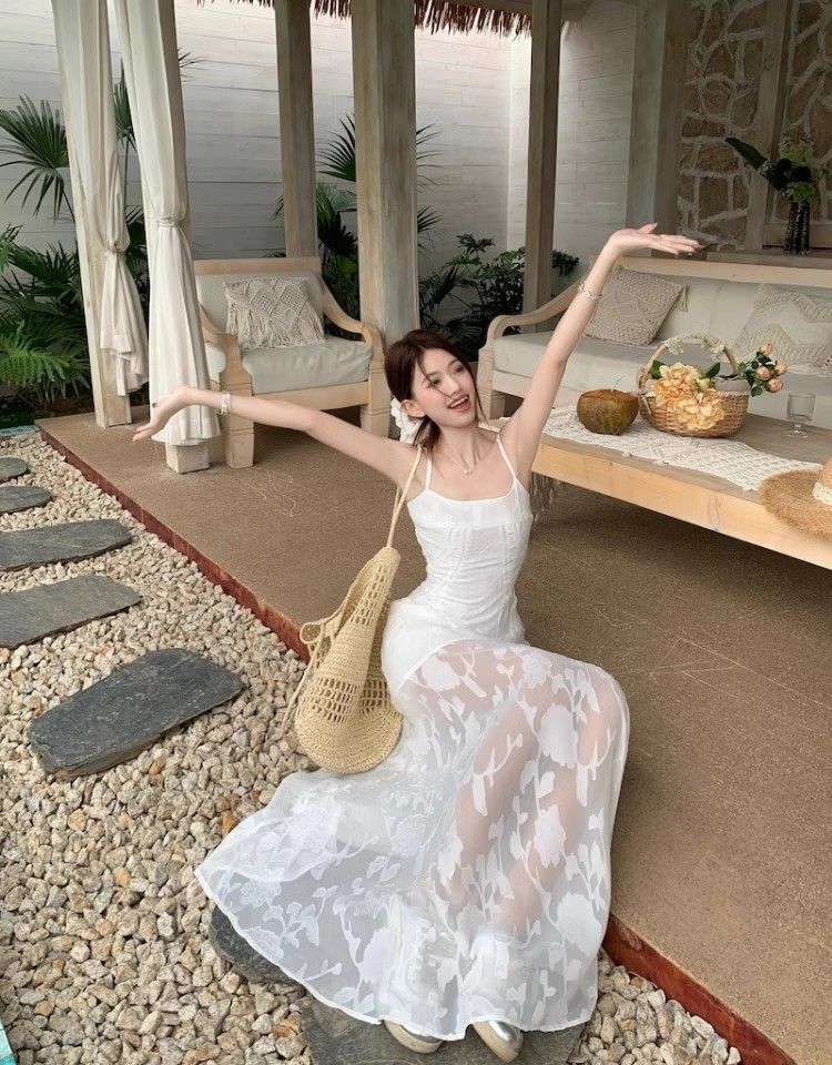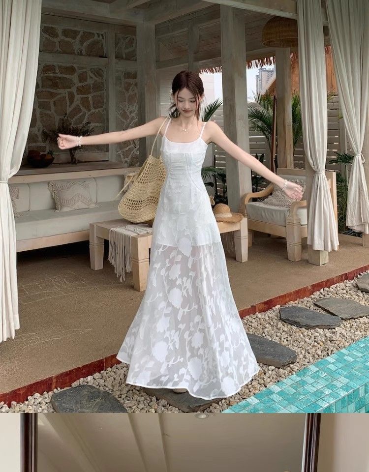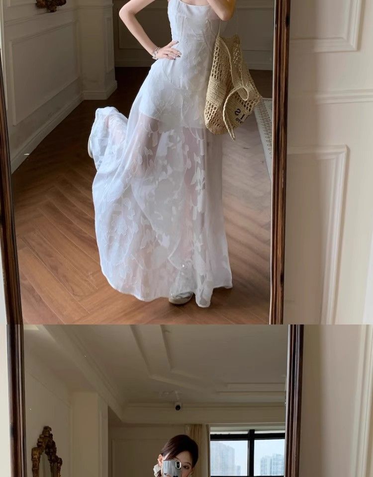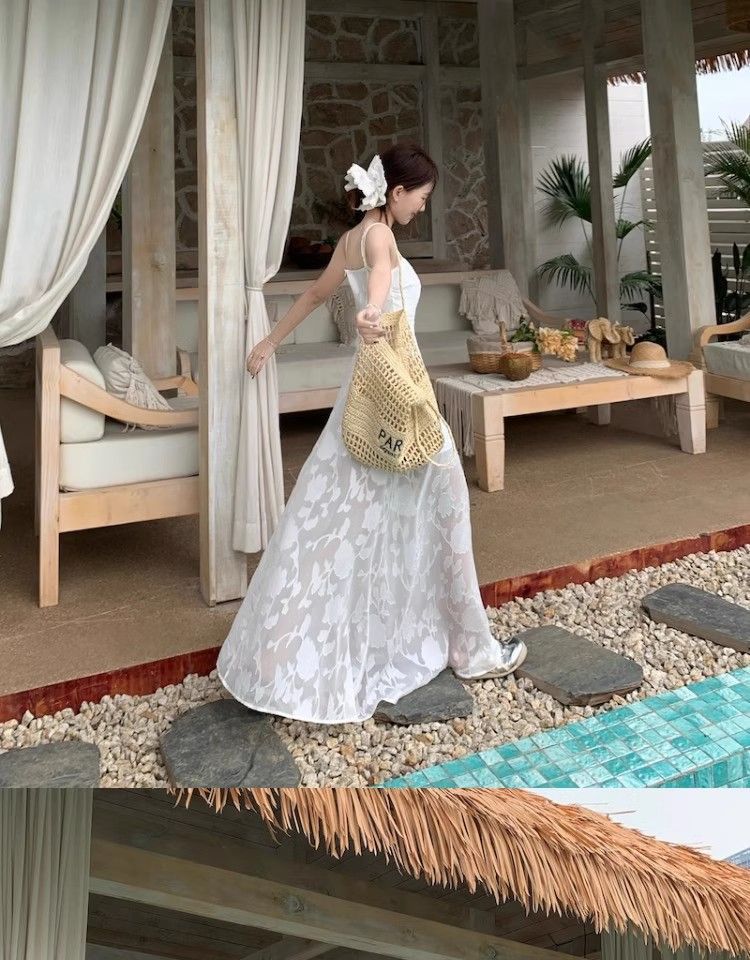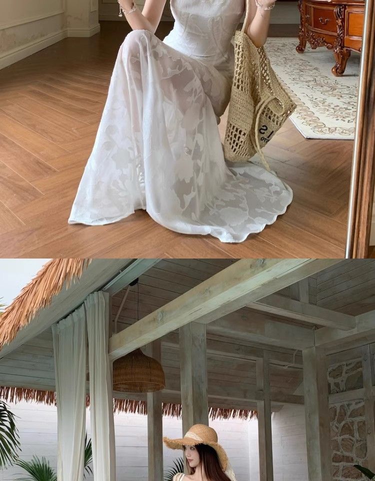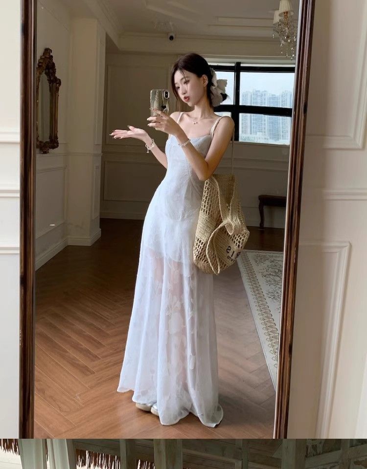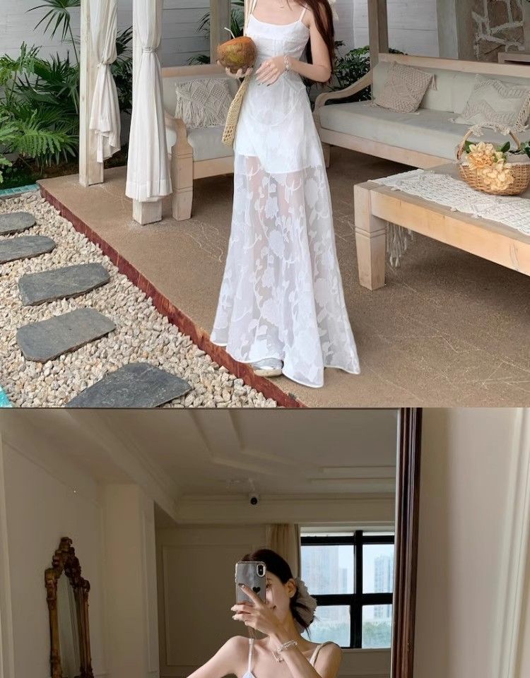 여름 여성용 해변 리조트 스타일 그린 서스펜더 드레스, 메쉬 스플라이싱 허리 슬리밍 스커트, 롱 스커트스토어 가기