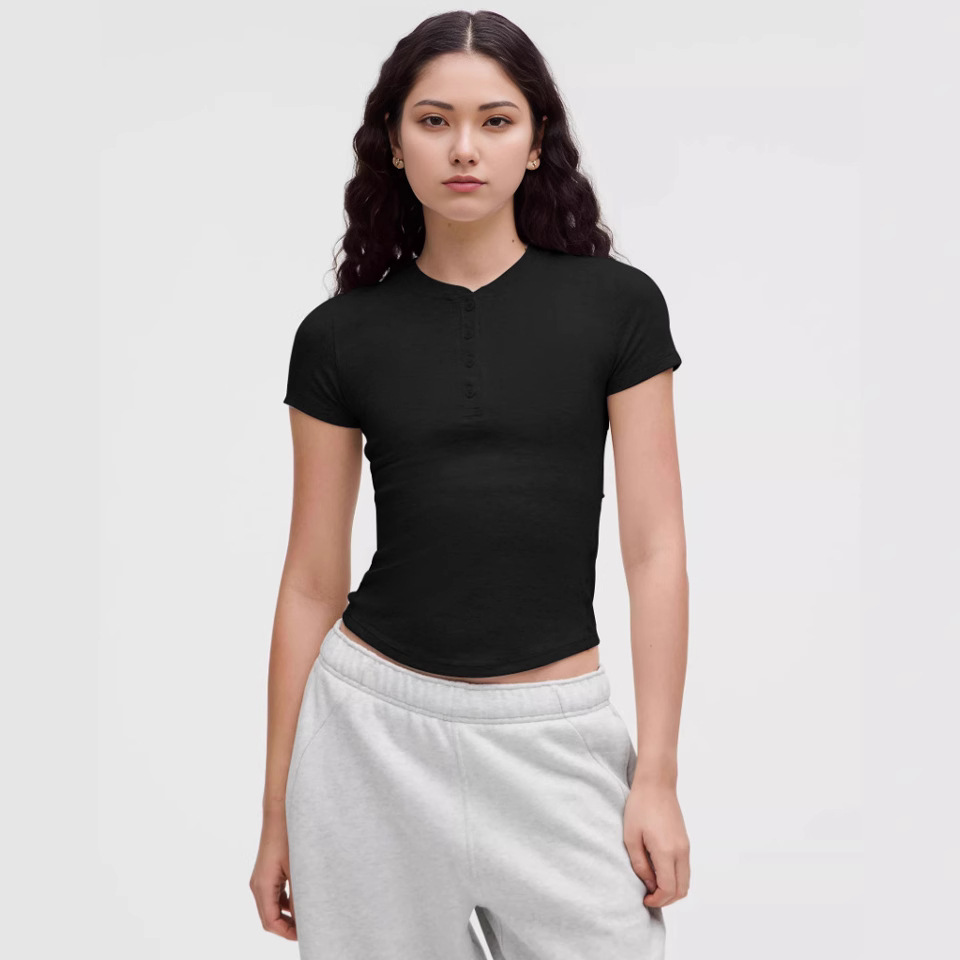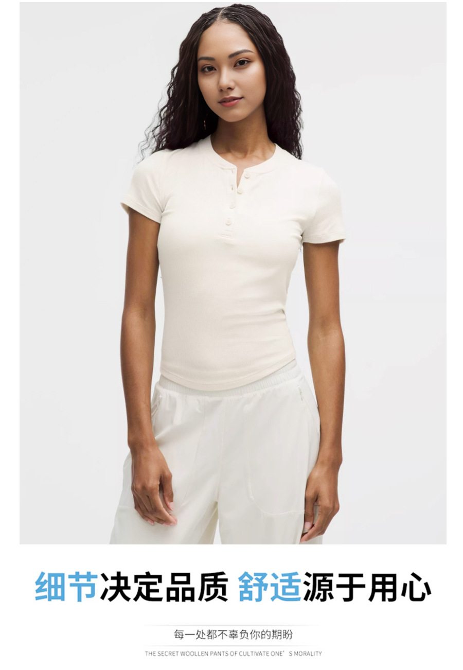 룰루 펜드 헨리 반팔 셔츠 여성용 골지 니트 티셔츠 슬림핏 요가복 버튼 스포츠 여름 베이스 셔츠스토어 가기