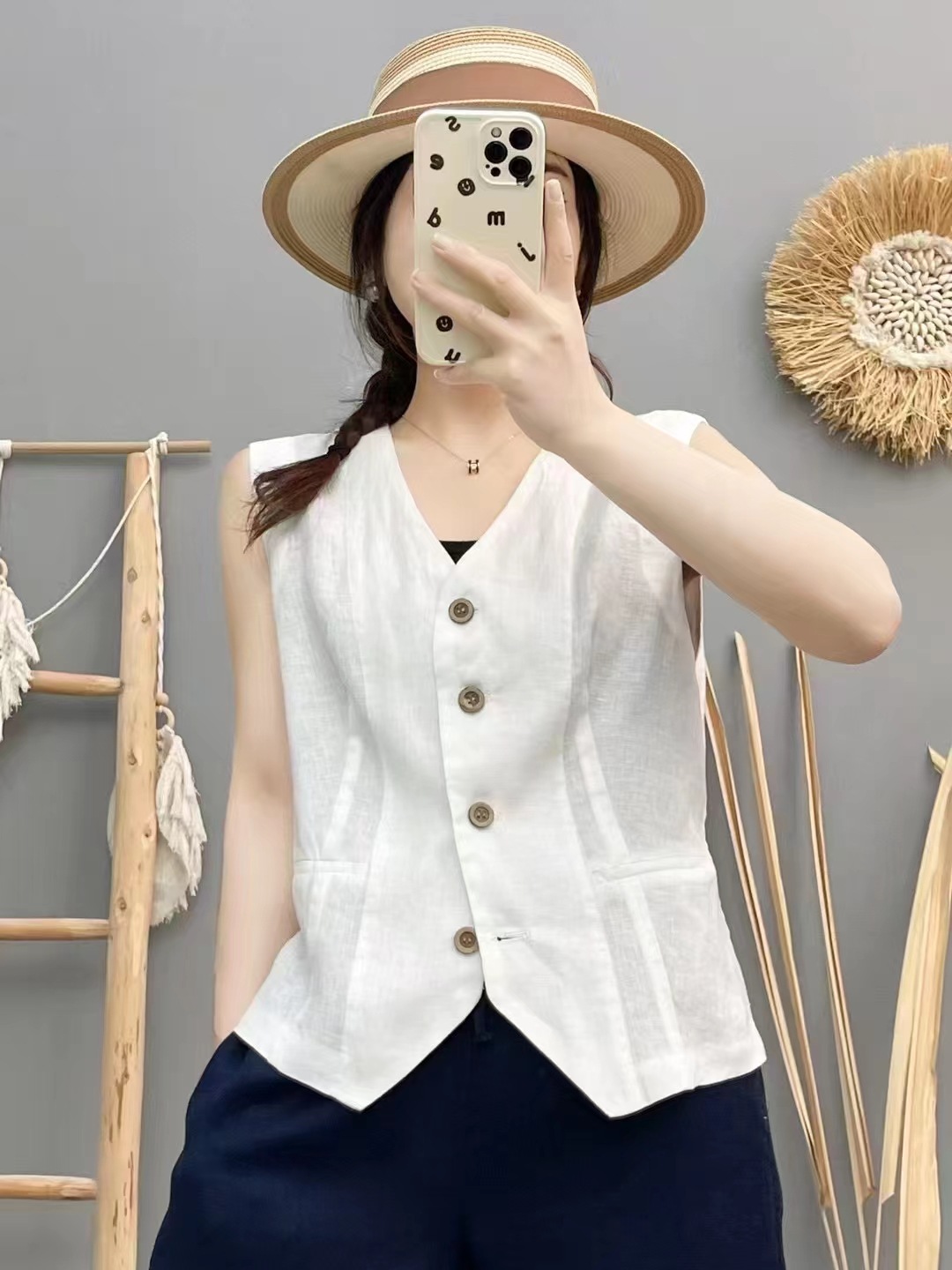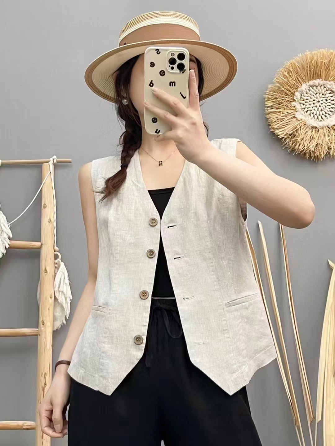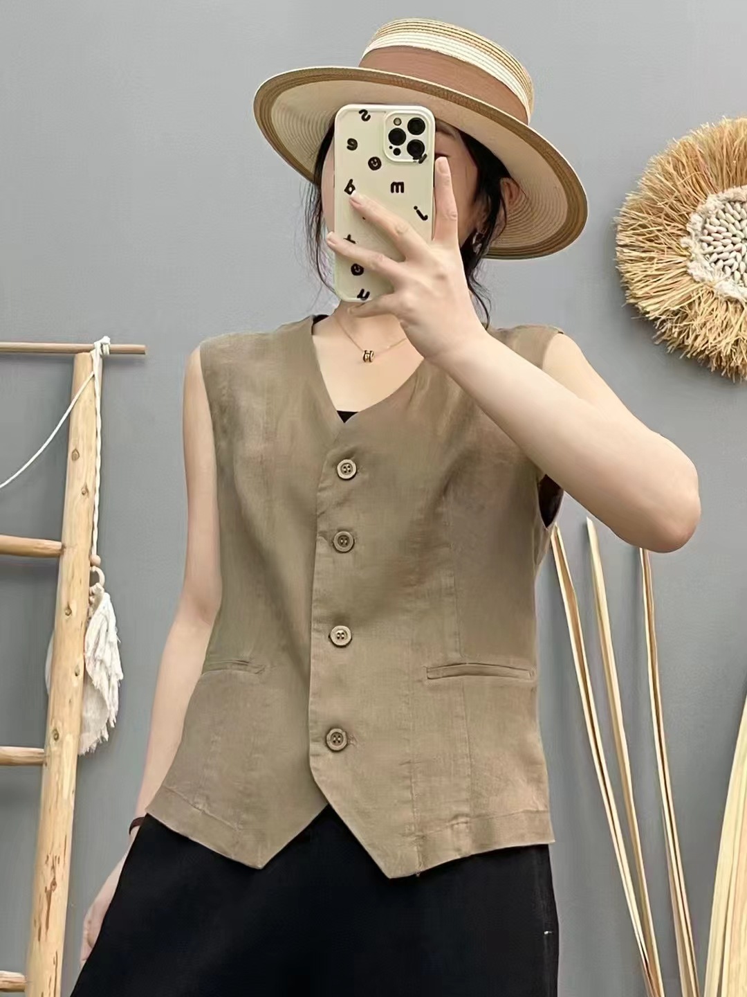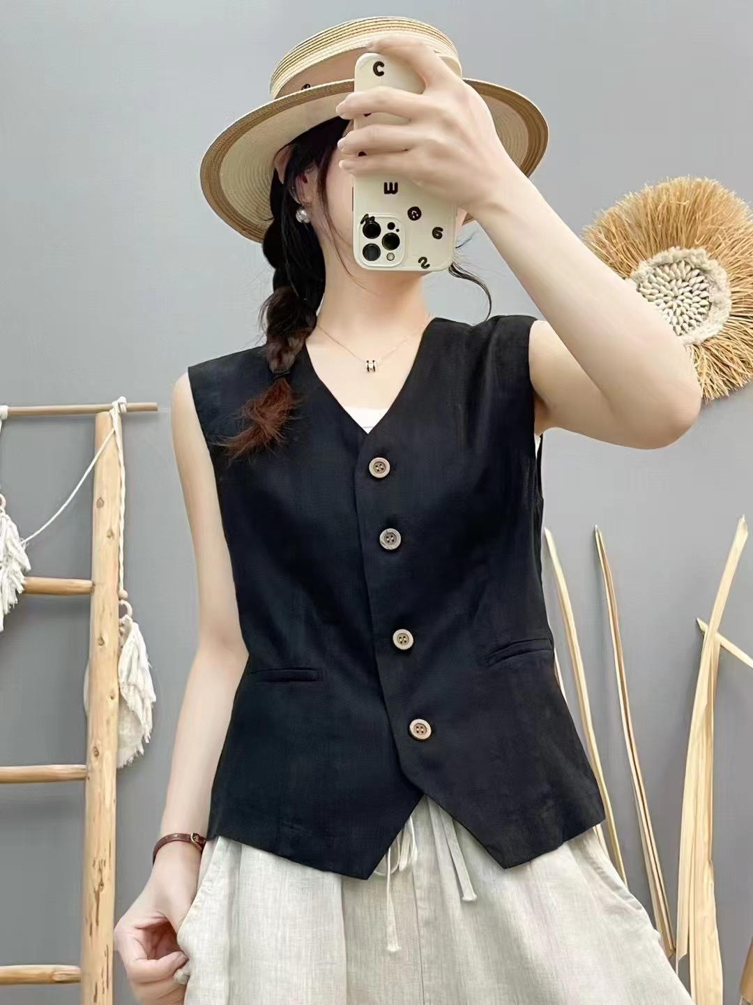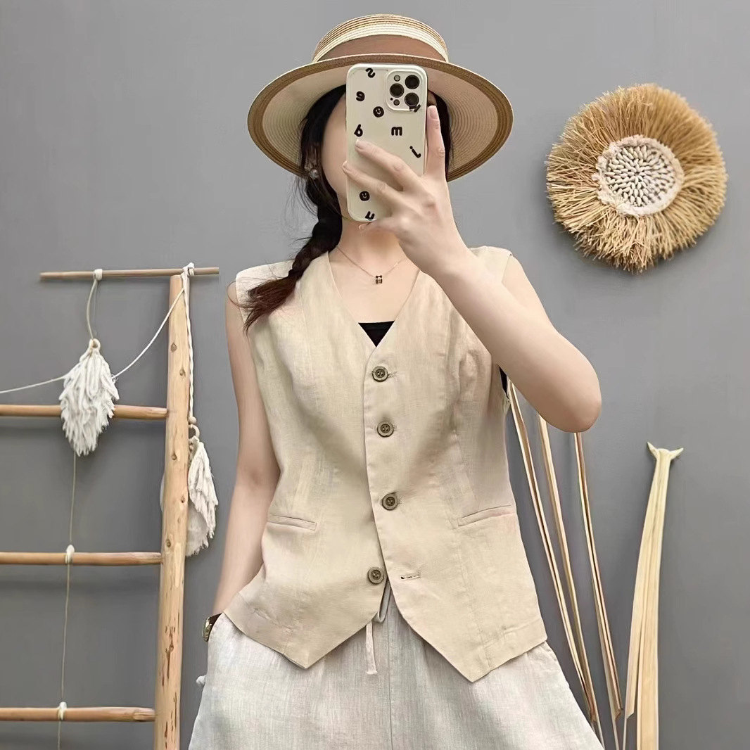 신제품 샌드 워시 100 린넨 솔리드 컬러 조끼 여성스러운 브이넥 민소매 아우터 탑 솔리드 컬러 가디건스토어 가기