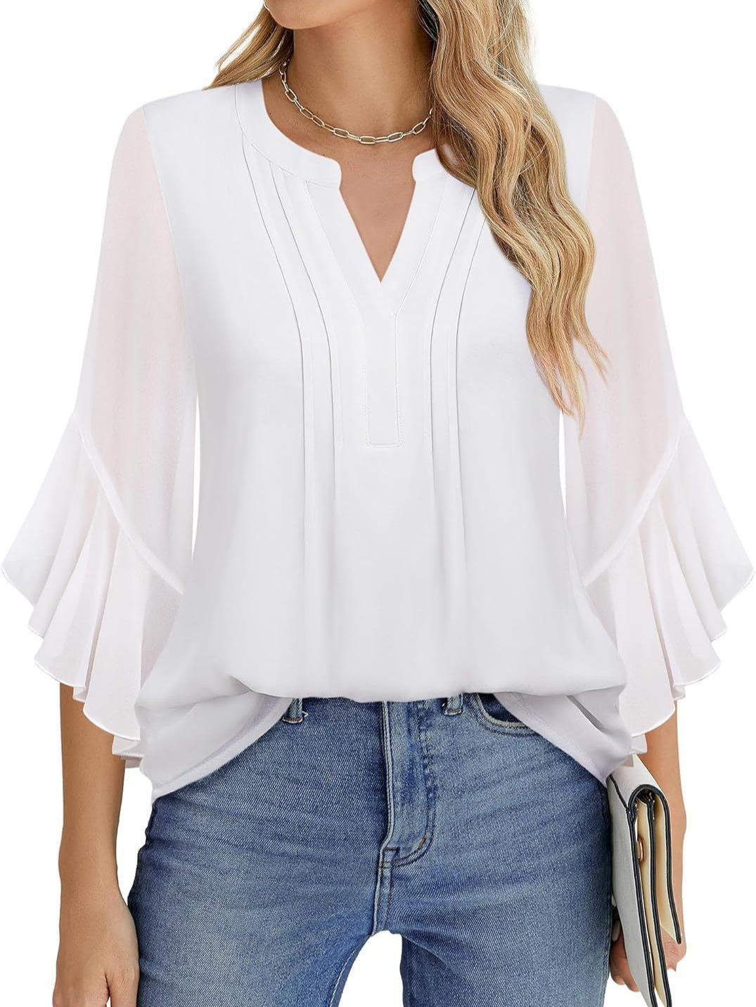 아마존 유럽과 미국의 연잎 7부 소매 탑 솔리드 컬러 패션 캐주얼 루즈 v 넥 비즈니스 셔츠 쉬폰 여성 의류스토어 가기