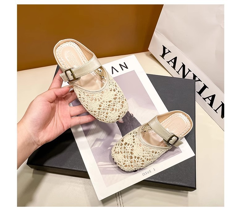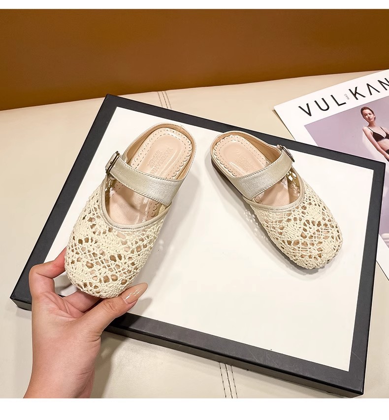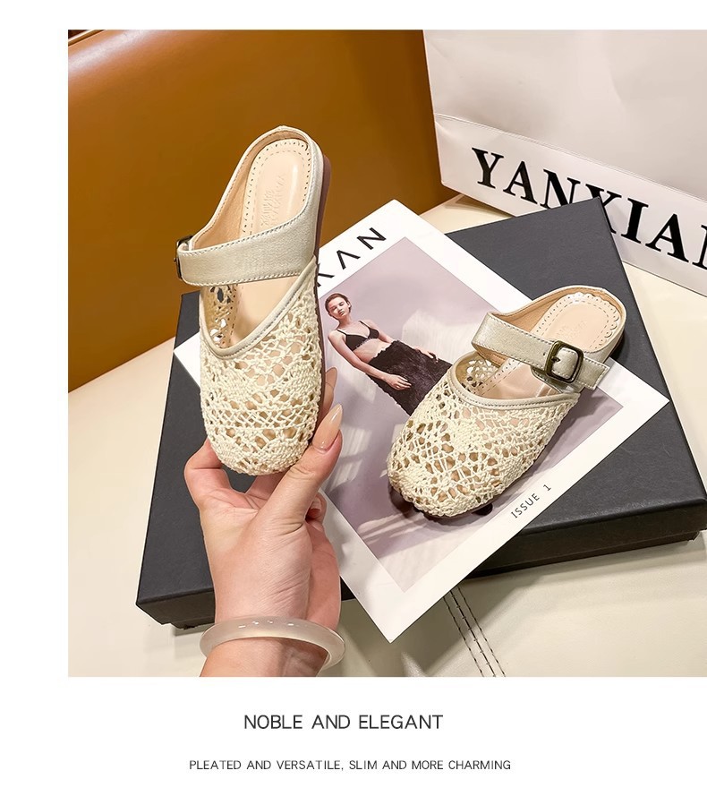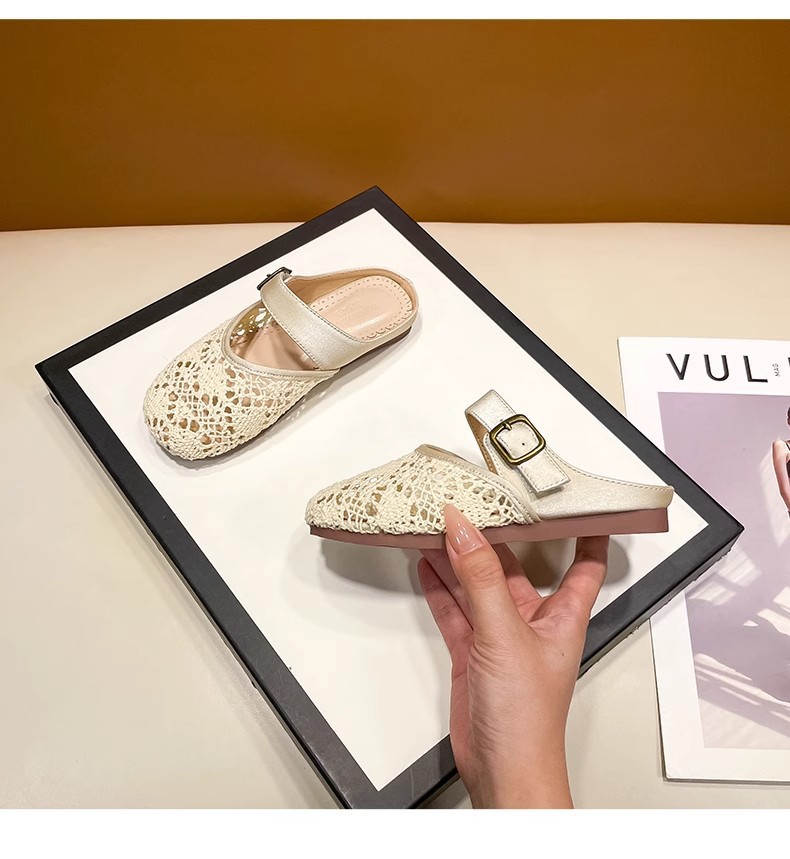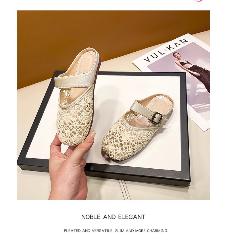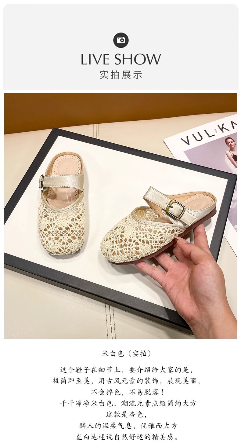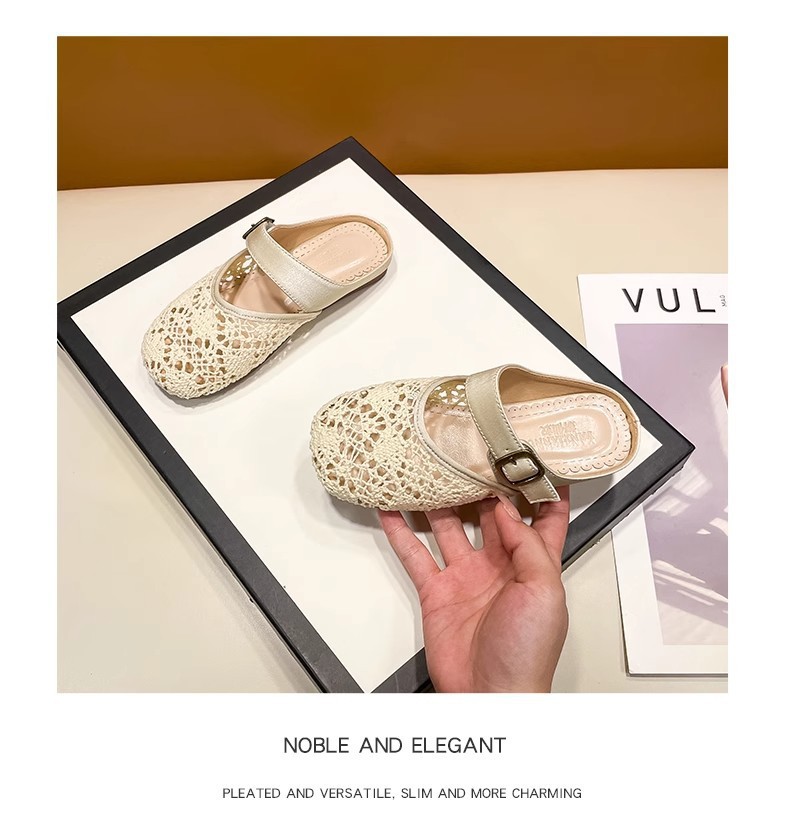 높은 가치의 짠 바오터우 반 슬리퍼 걸스 여름 복고풍 유행 외형 간단한 할로우 라운드 발가락 플랫 샌들스토어 가기