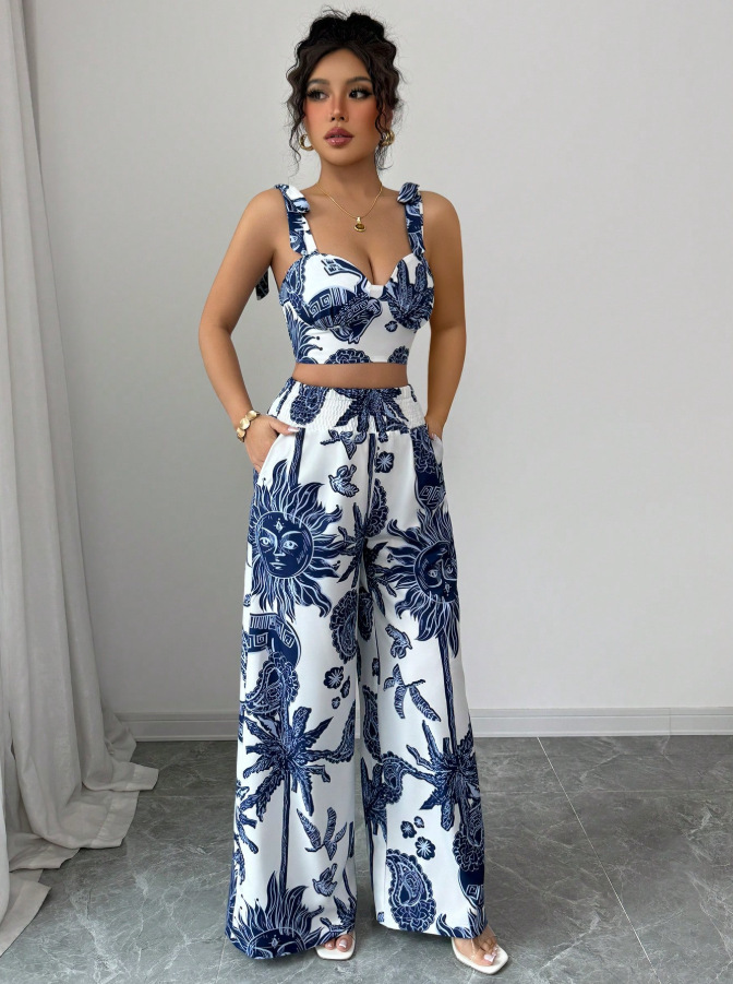 2025 국경을 넘는 유럽과 미국 여성의 여름 새로운 섹시한 V-넥 카미 솔 탑 풀리는 허리 넓은 다리 바지
