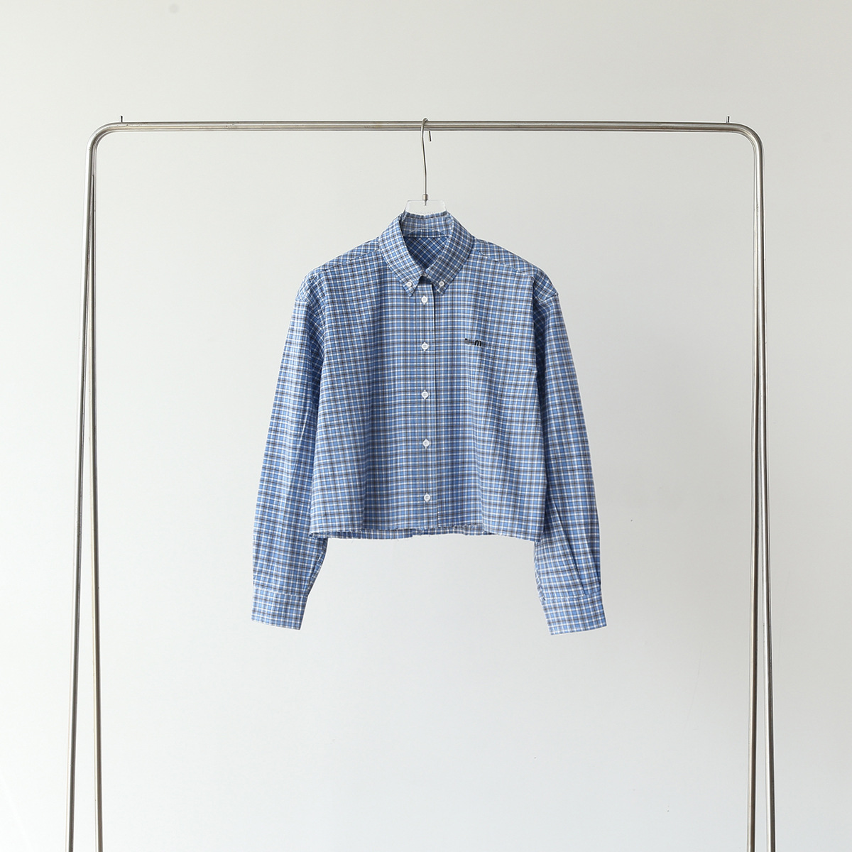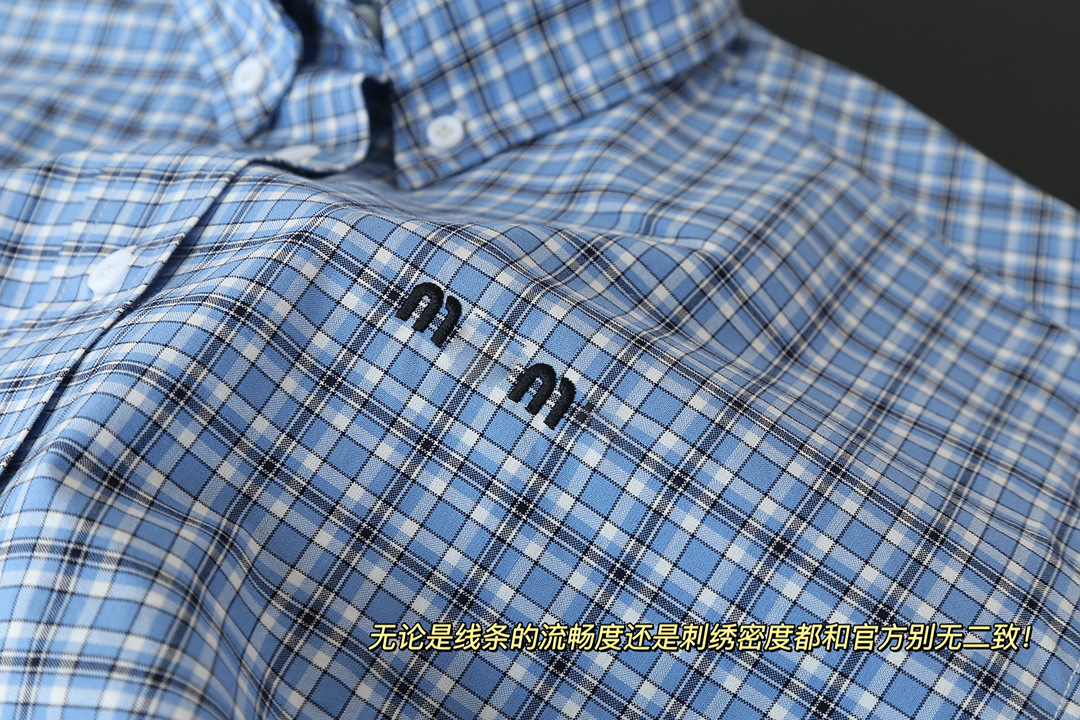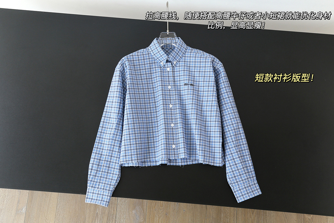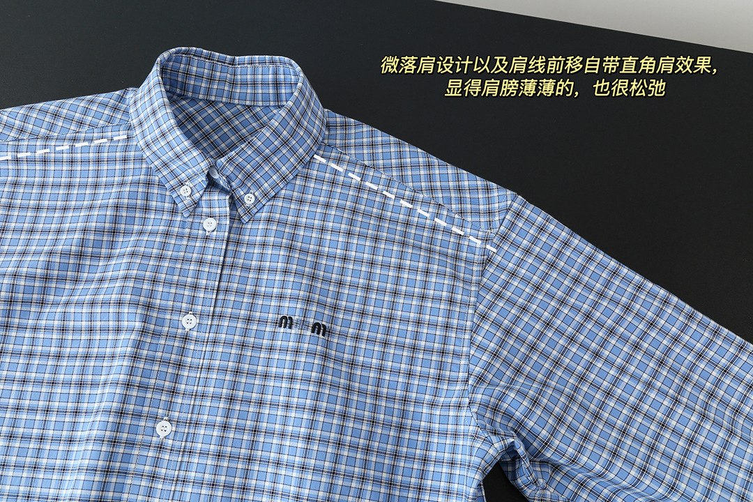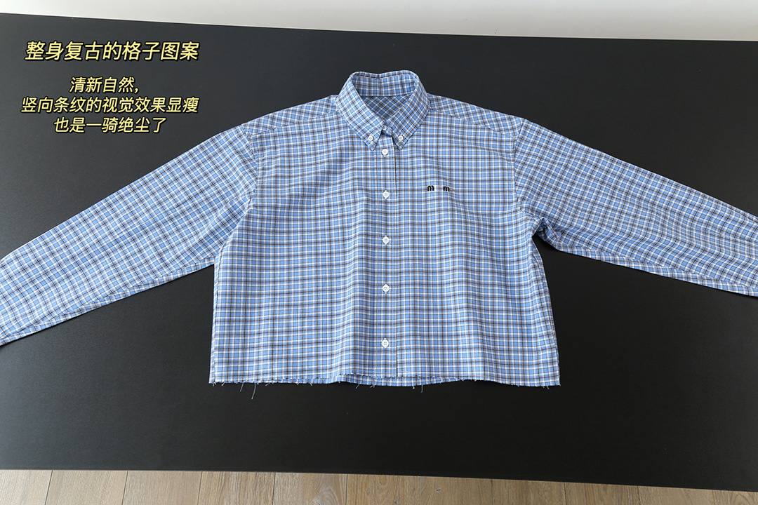 MM 라이트 블루 체크 무늬 짧은 라펠 여성 셔츠 자수 문자 로고 2025 심플 트렌디 브랜드 카디건 재킷스토어 가기