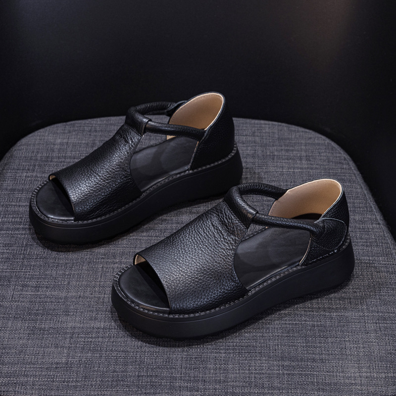 여성을위한 탑 레이어 Cowhide 가죽 샌들 2025 여름 새로운 복고풍 스타일 플랫폼 경량 생선 입 가죽 높이 증가 샌들
