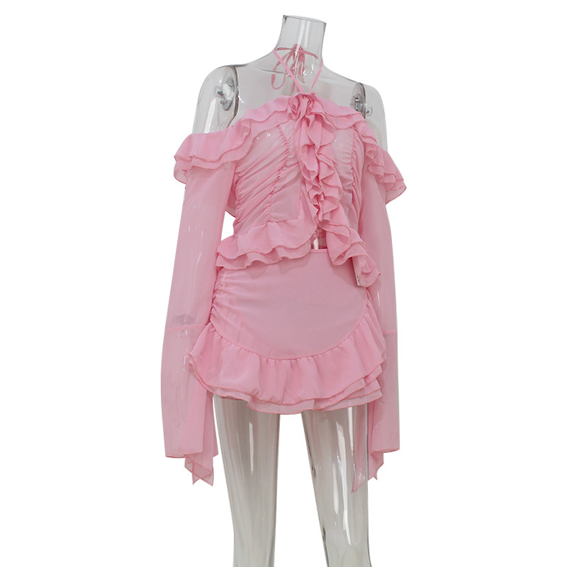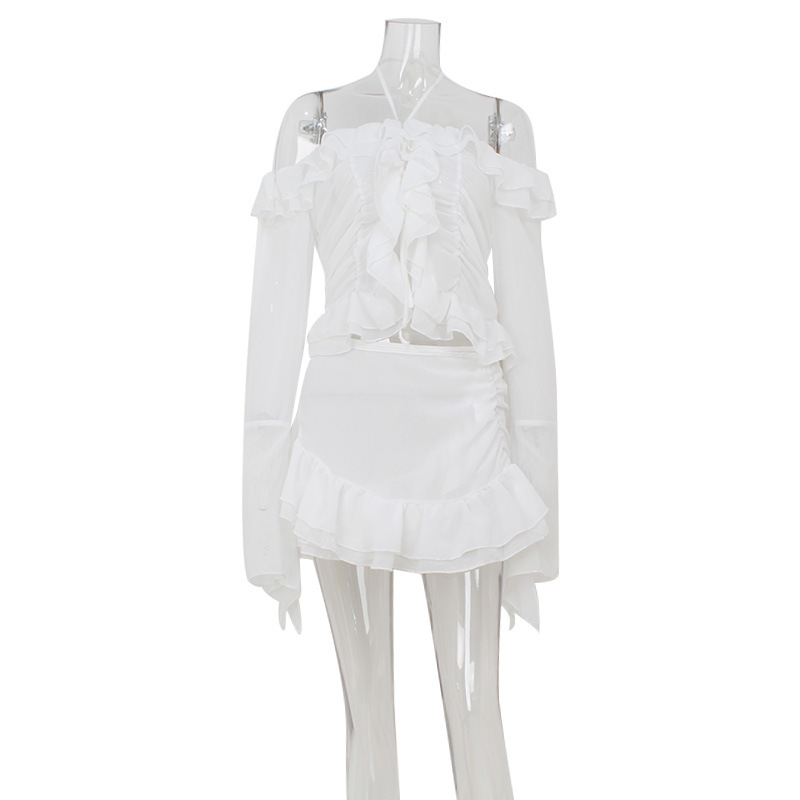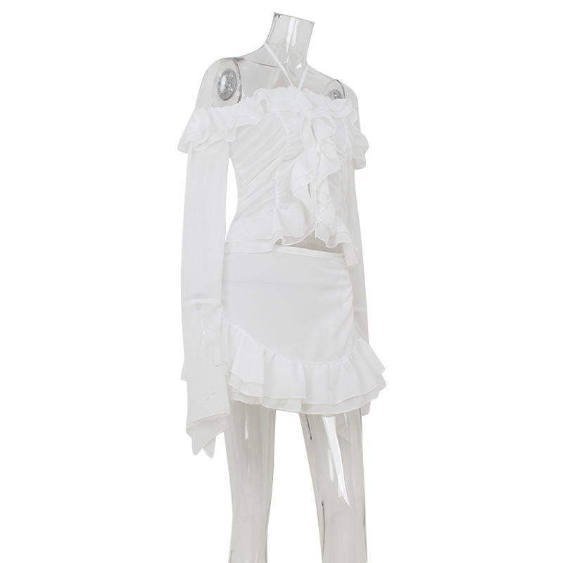 유럽과 미국의 국경 여성 의류 여름 새로운 패션 우아한 트럼펫 소매 귀 테두리 최고 틈새 디자인 짧은 치마 세트