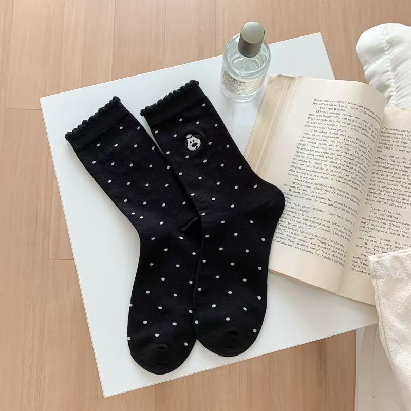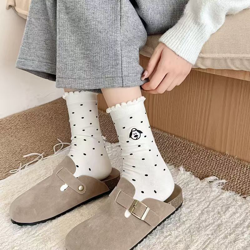 여성용 종아리 중간 양말, 트렌디한 폴카 도트 만화 양말, 여성용 일본식 귀여운 인 트렌디 강아지 레이스 버블 양말스토어 가기