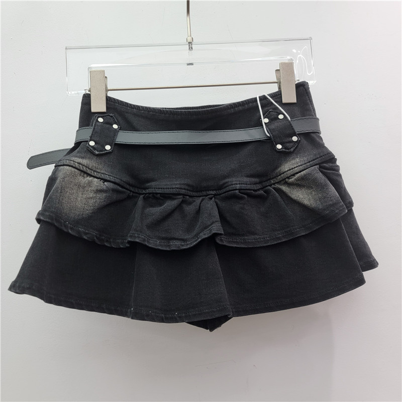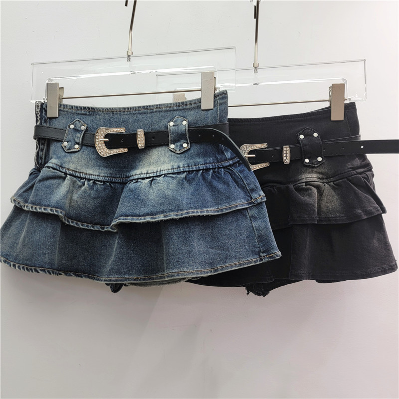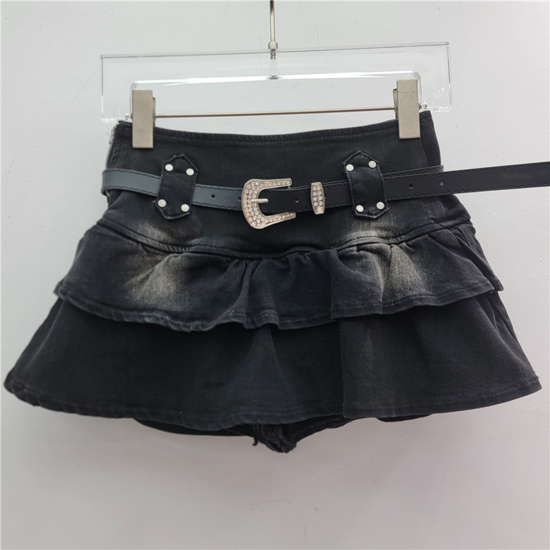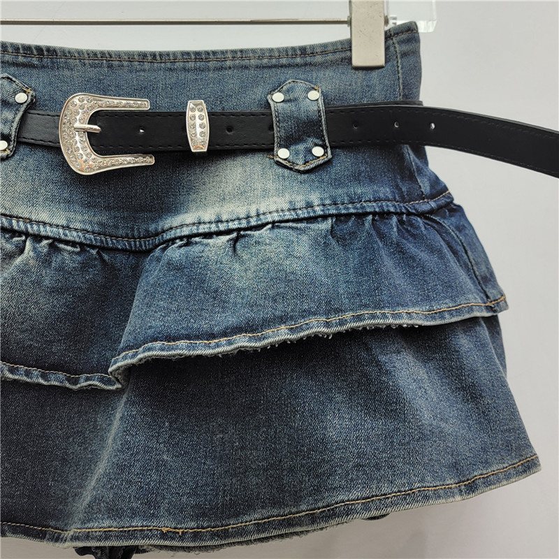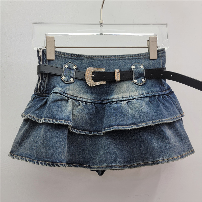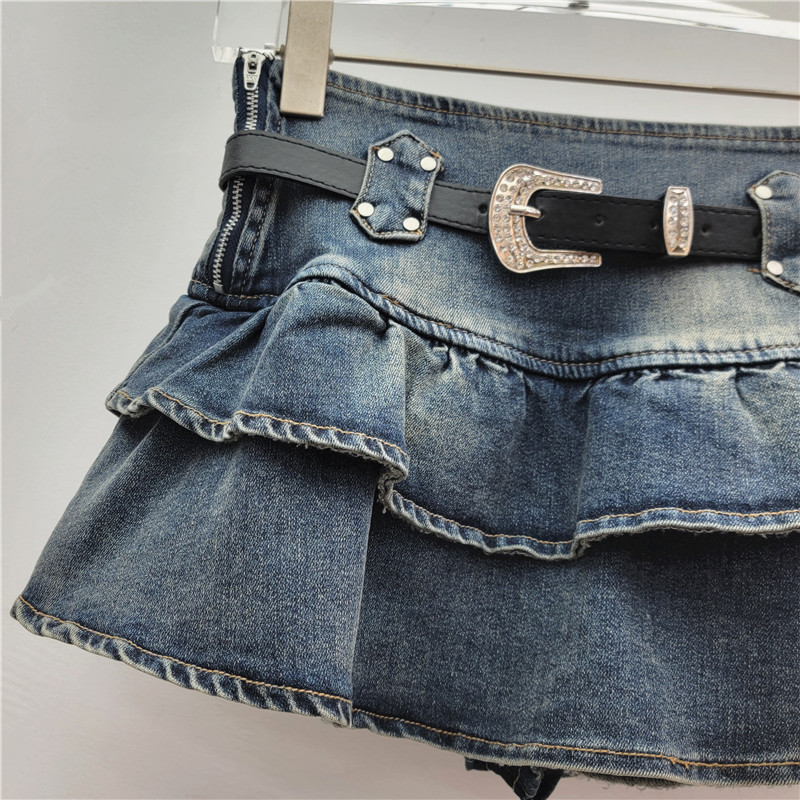 여성을위한 레트로 프릴 데님 미니 스커트 2025 여름 새로운 슬림 핫 소녀 A 라인 푹신한 케이크 스커트