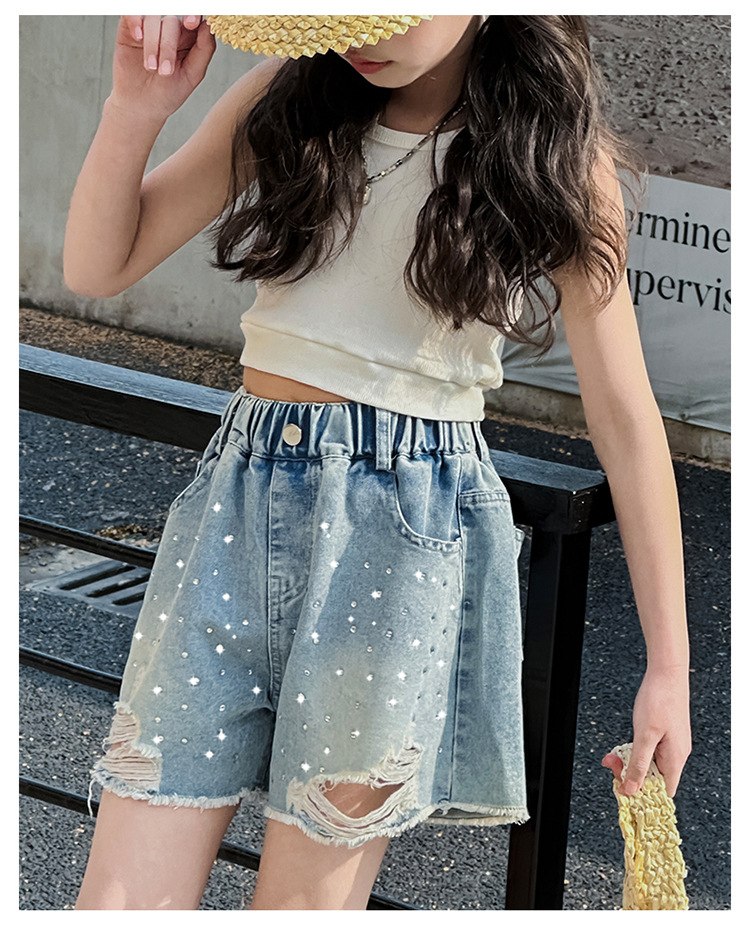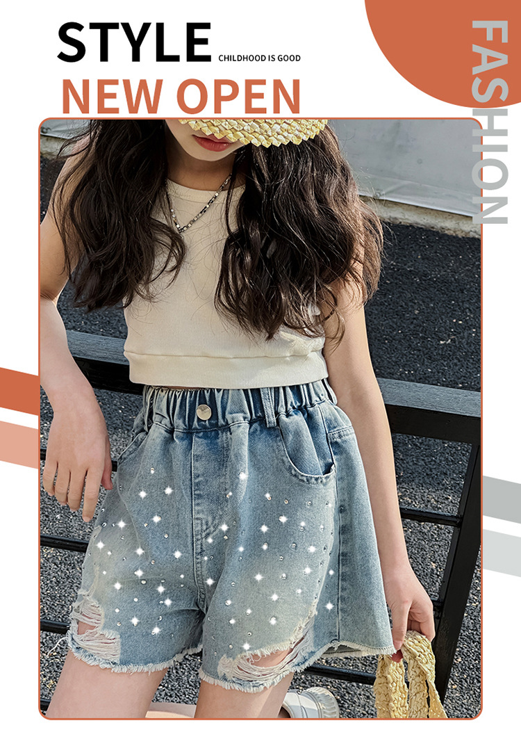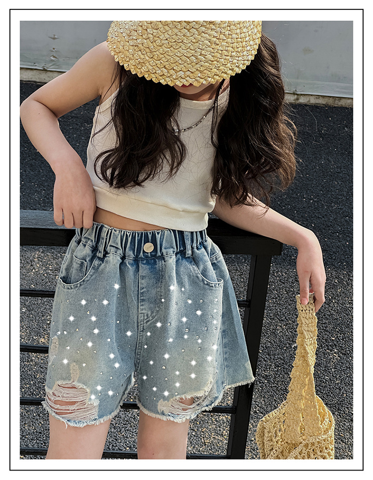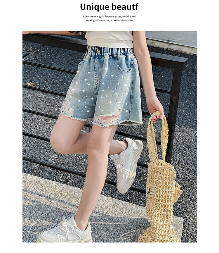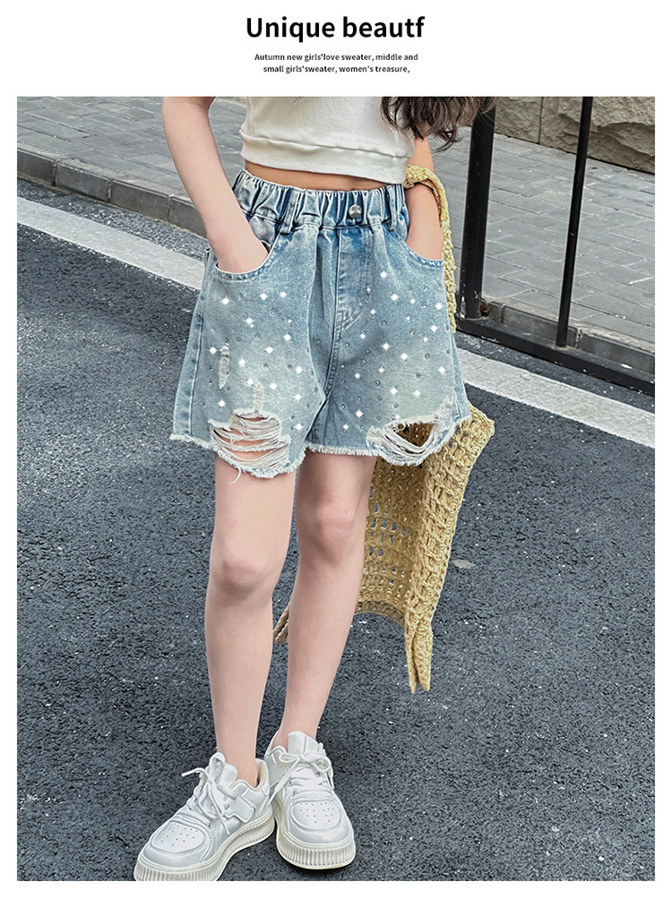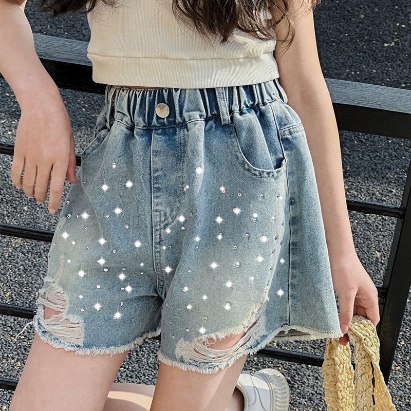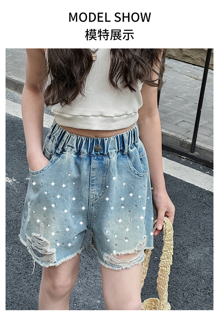 여아 반바지, 큰 아동용 아우터, 2025년 여름 신상 데님 반바지, 패셔너블한 아동 패션 핫 다이아몬드 찢어진 바지스토어 가기