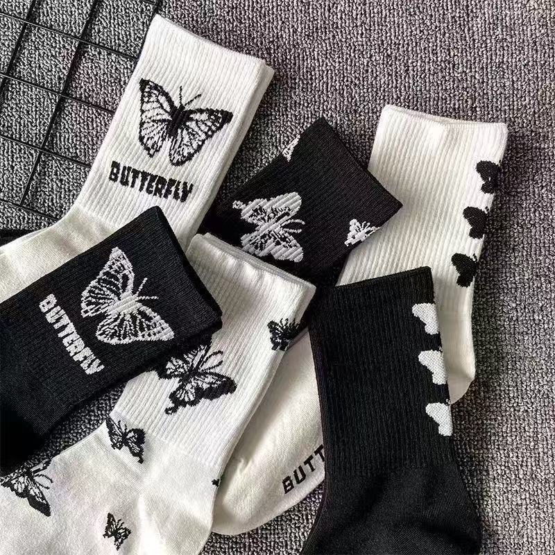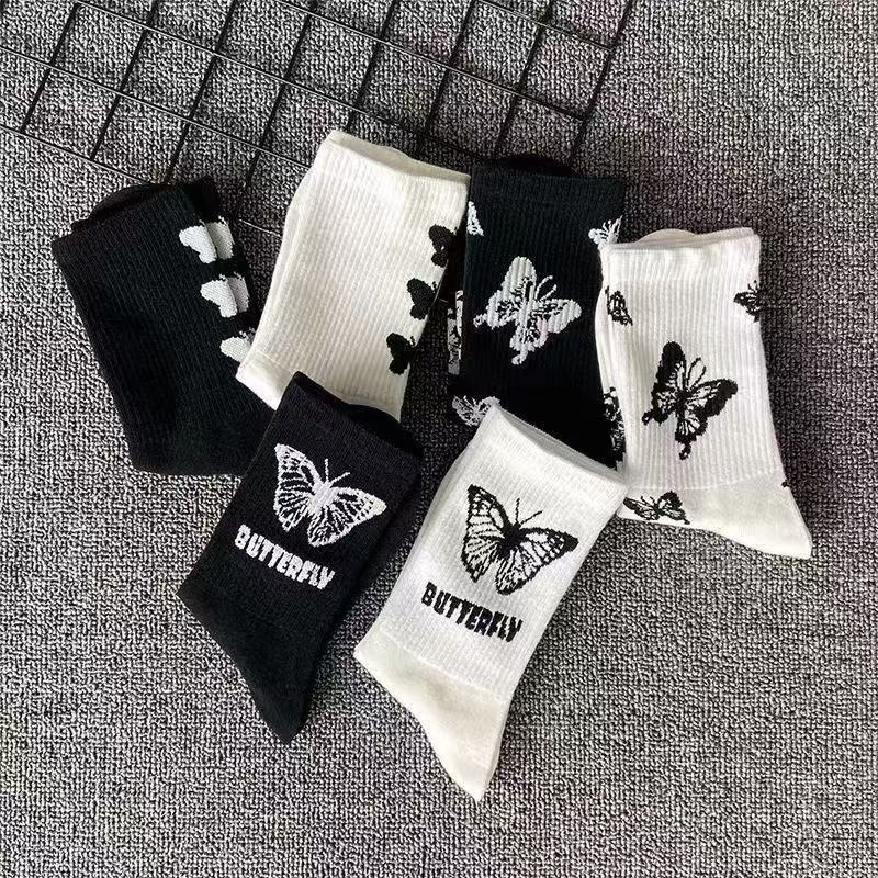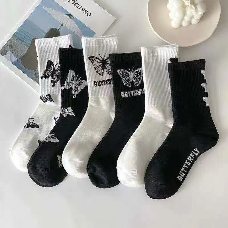 여성용 양말 한국식 종아리 중간 트렌디 다용도 탈취제 여성용 가을 겨울 여성용 만화 흑백 나비 스타킹