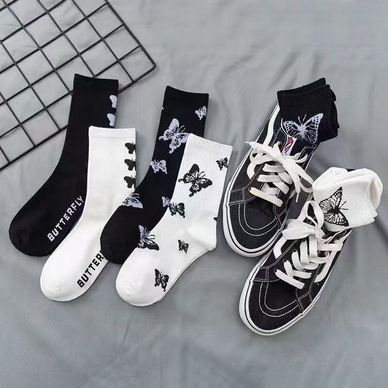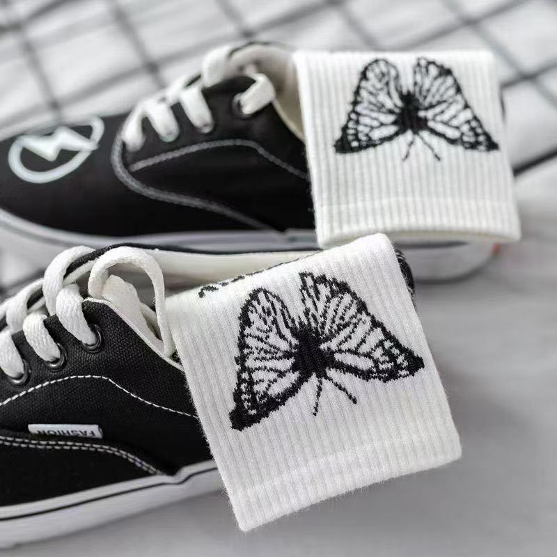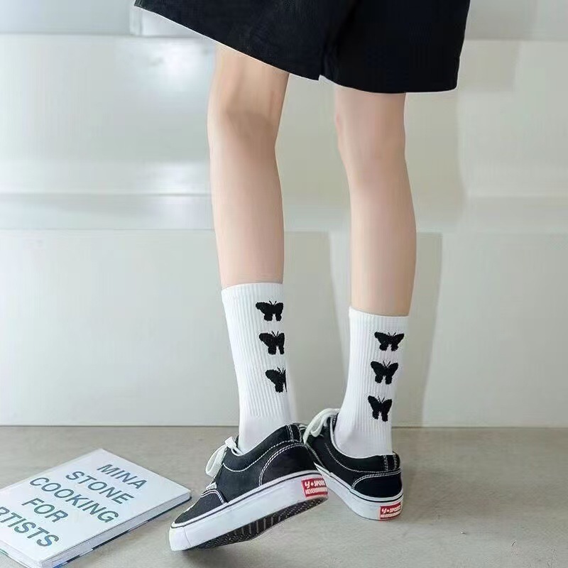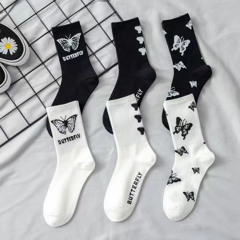 여성용 양말 한국식 종아리 중간 트렌디 다용도 탈취제 여성용 가을 겨울 여성용 만화 흑백 나비 스타킹스토어 가기