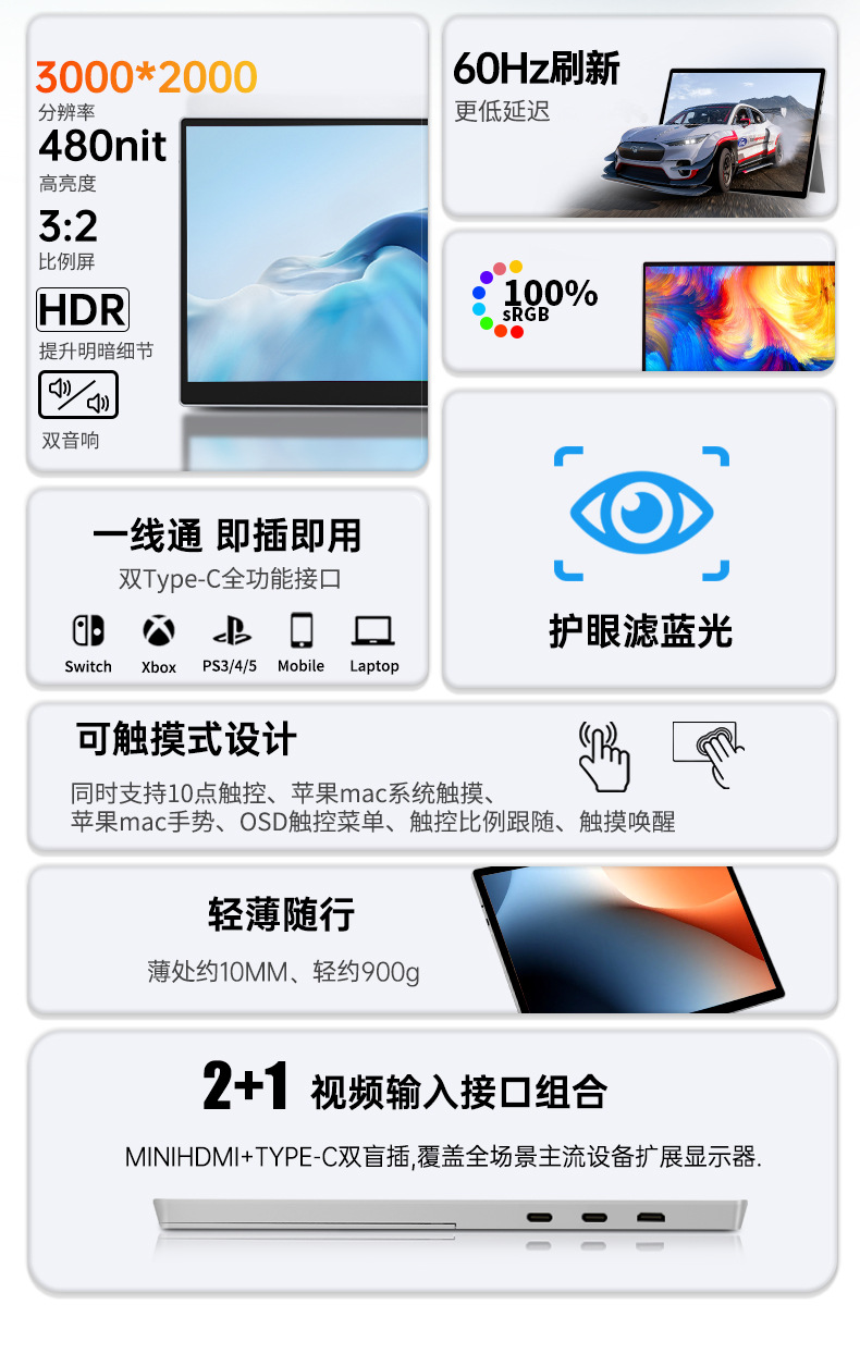 스트리트 라이트 13.5인치 3K 터치 휴대용 모니터 노트북 태블릿 휴대폰 터치 PS5 외부 화면스토어 가기