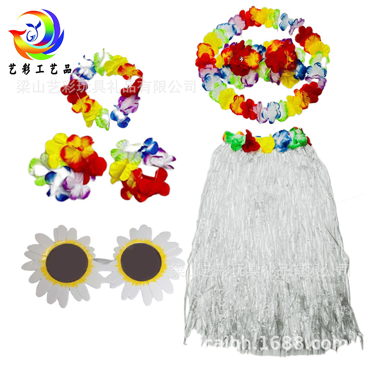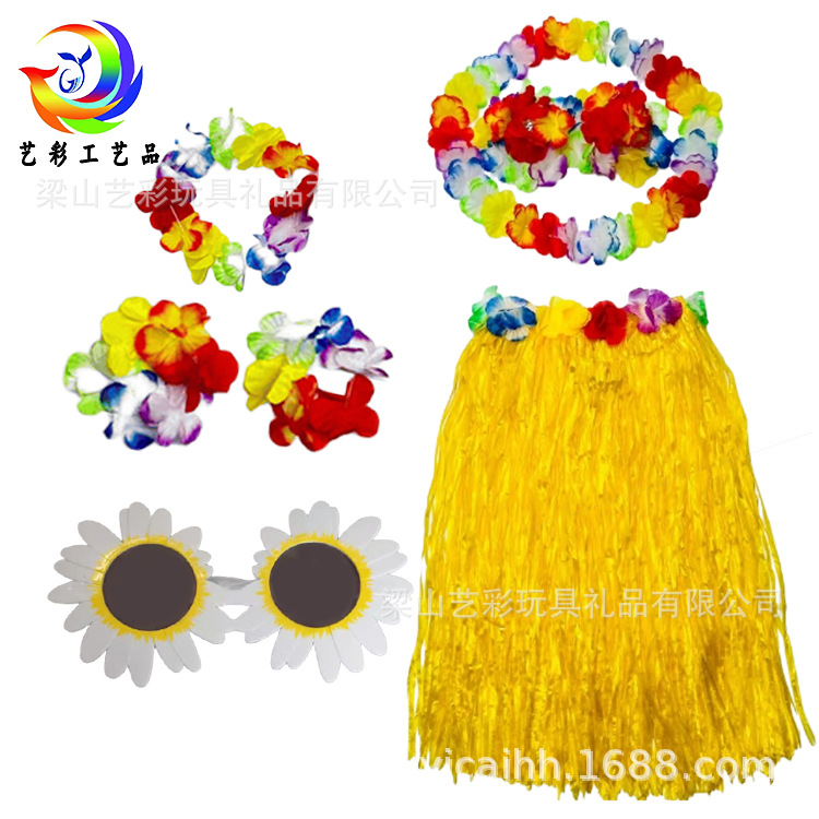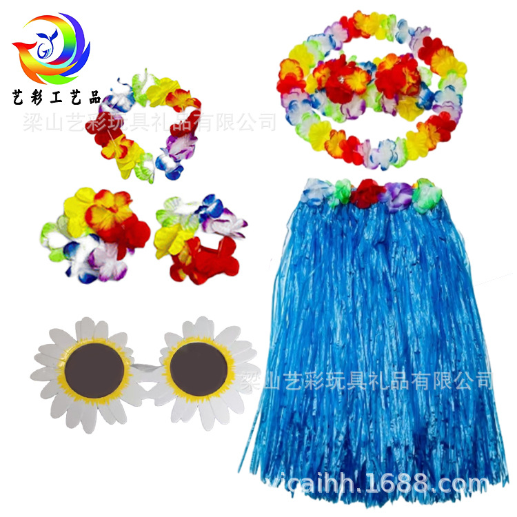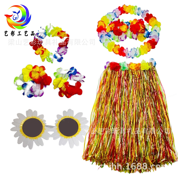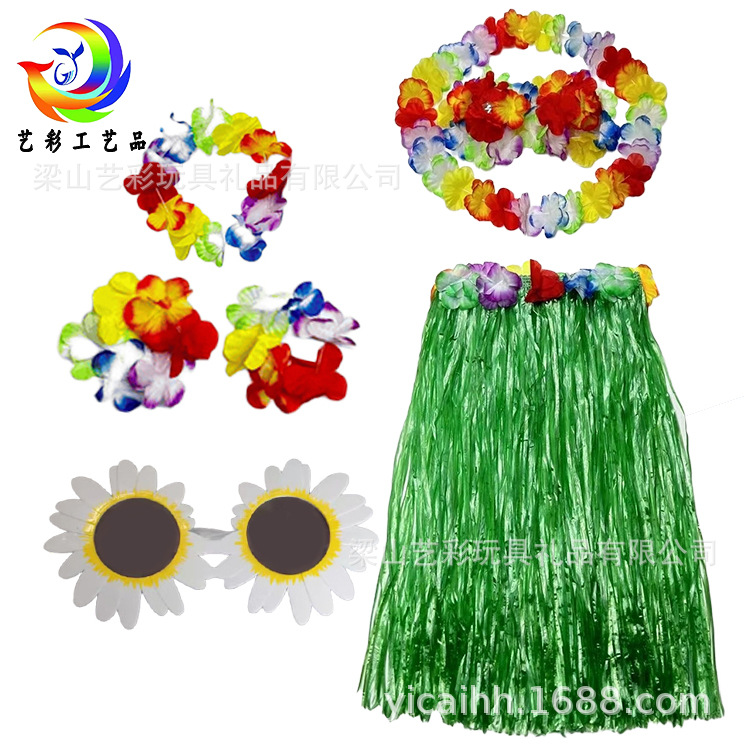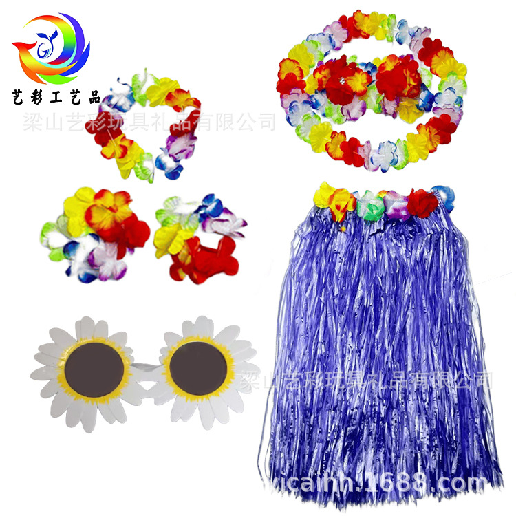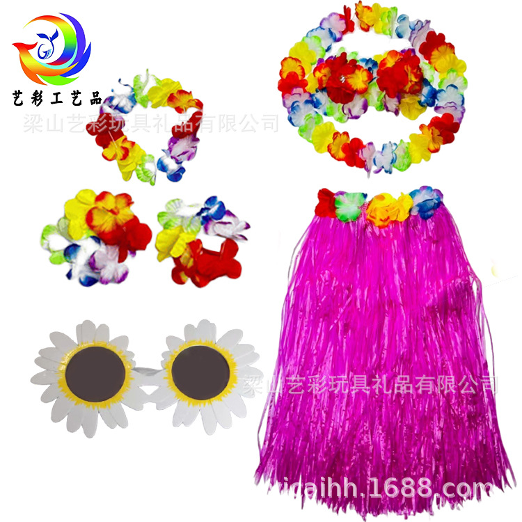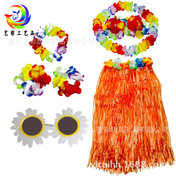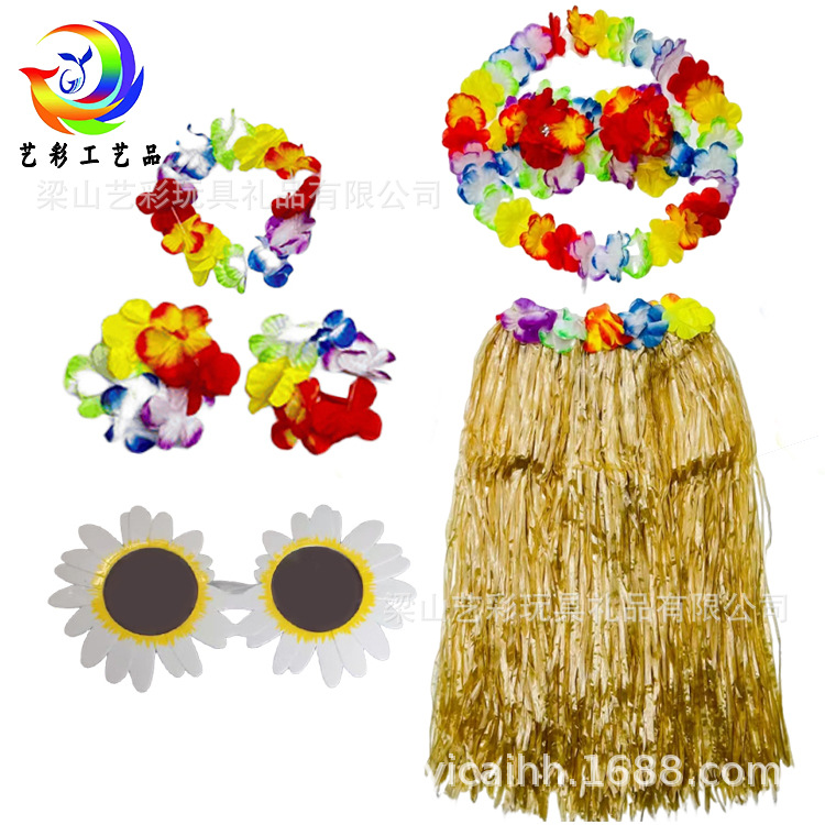 뜨거운 판매 하와이 잔디 스커트 화환 안경 세트 비치 파티 성인 잔디 스커트 폴리 에스터 천 화환 브라 세트