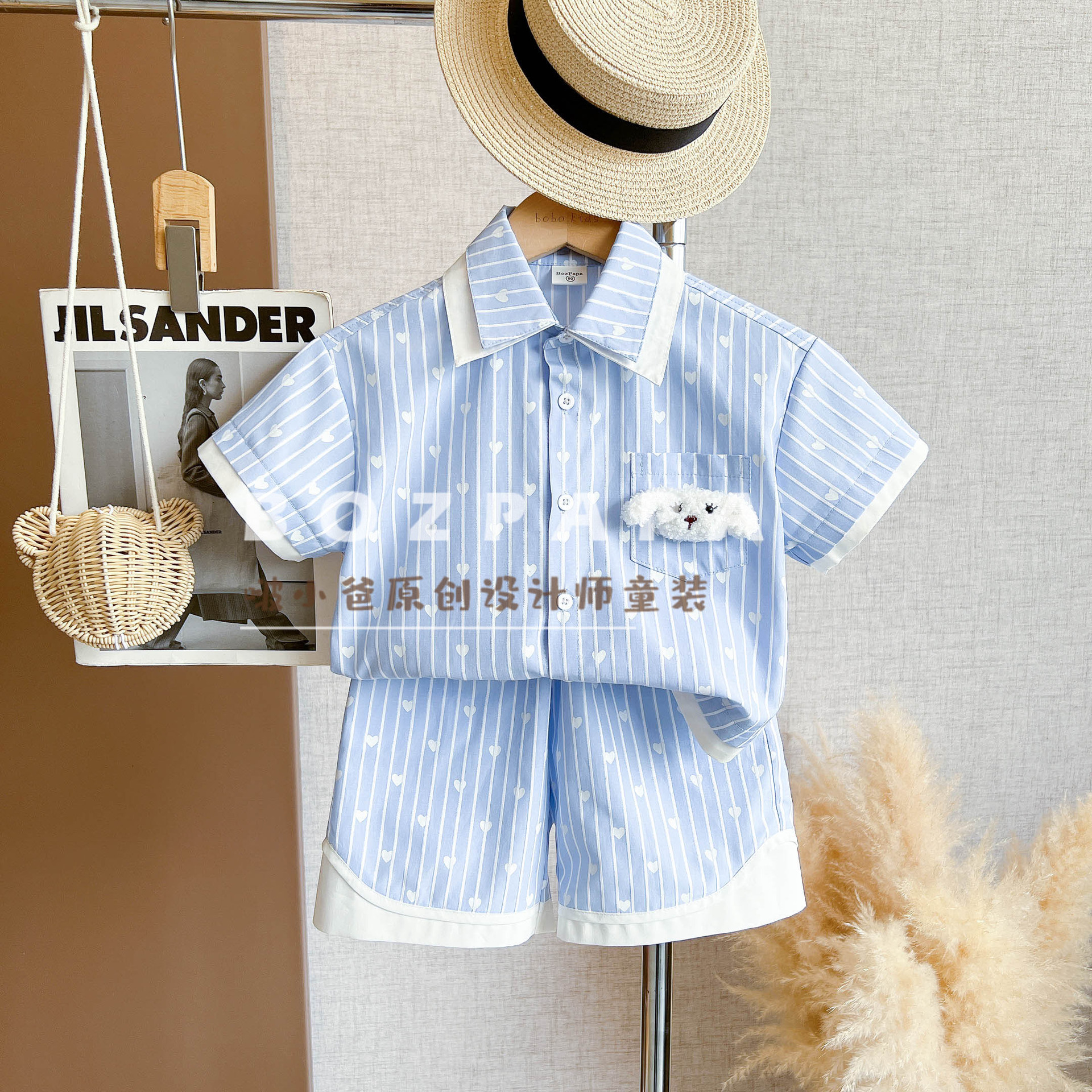 2025 새로운 여름 소년 한국 캐주얼 반팔 투피스 세트 어린이 베이비 스트라이프 러브 셔츠 세트