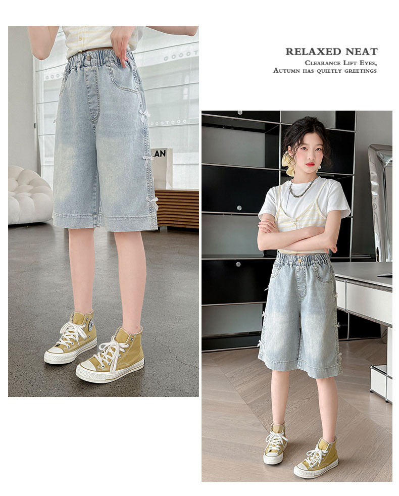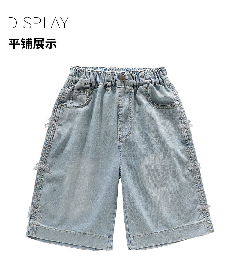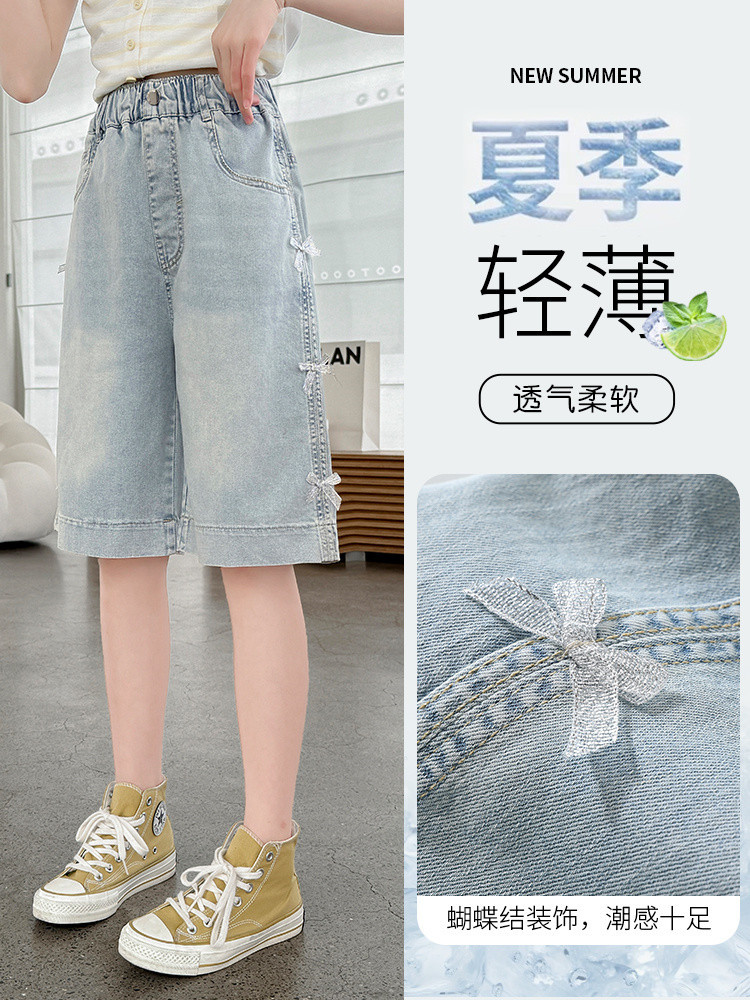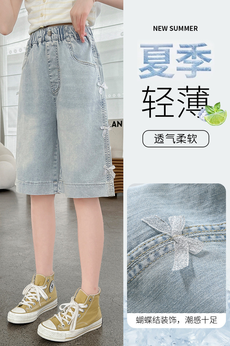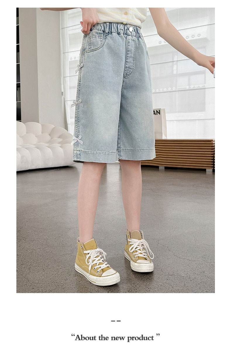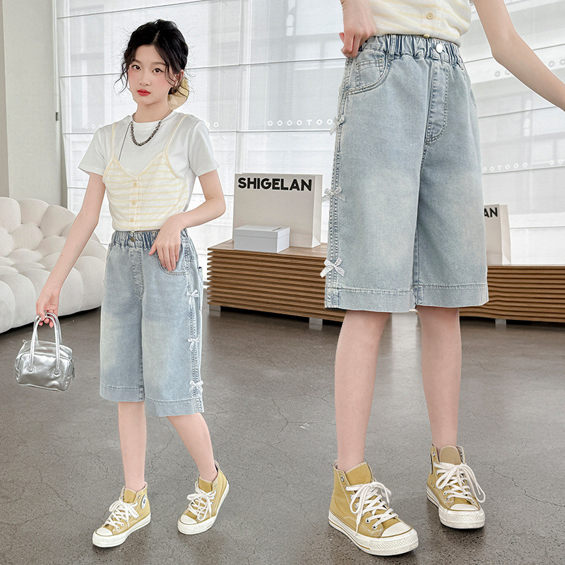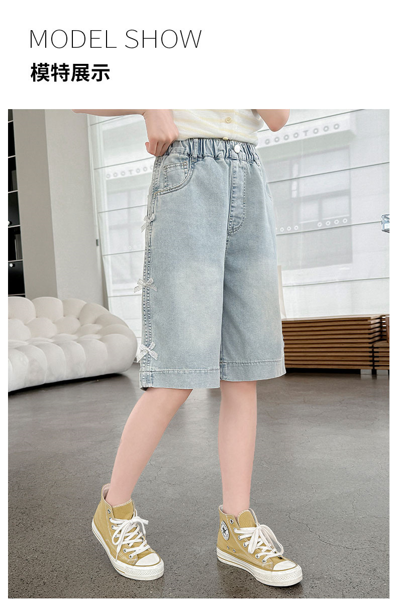 소녀의 여름 데님 중간 길이 바지 2025 새로운 세련된 패셔너블 사이드 활 중간 길이의 어린이 한국 반바지스토어 가기