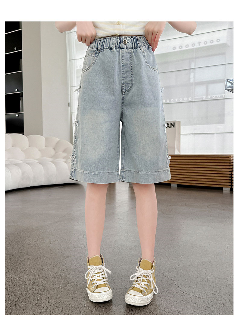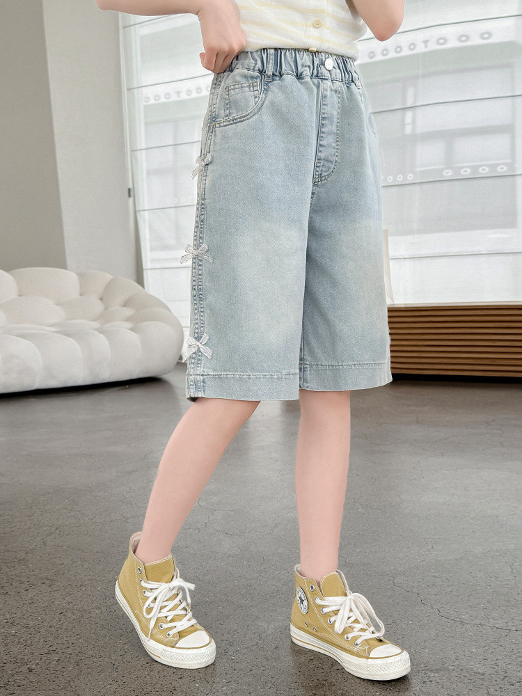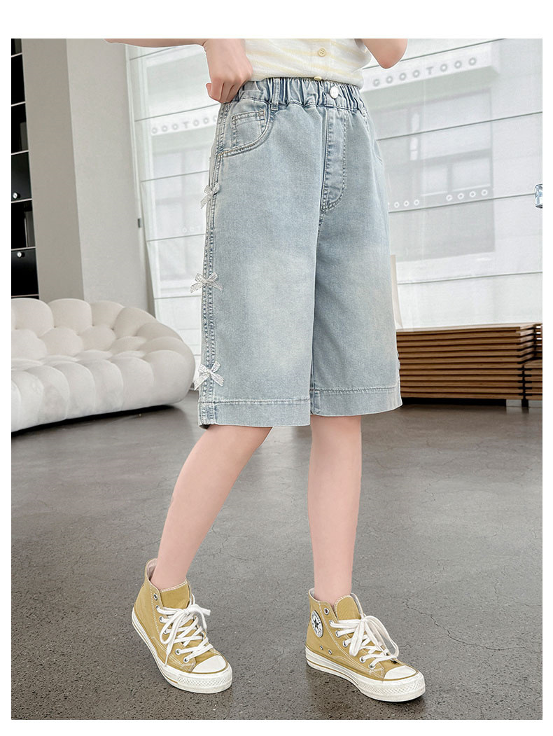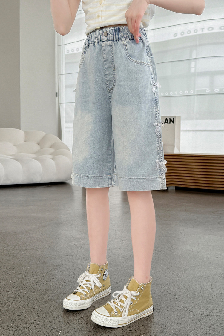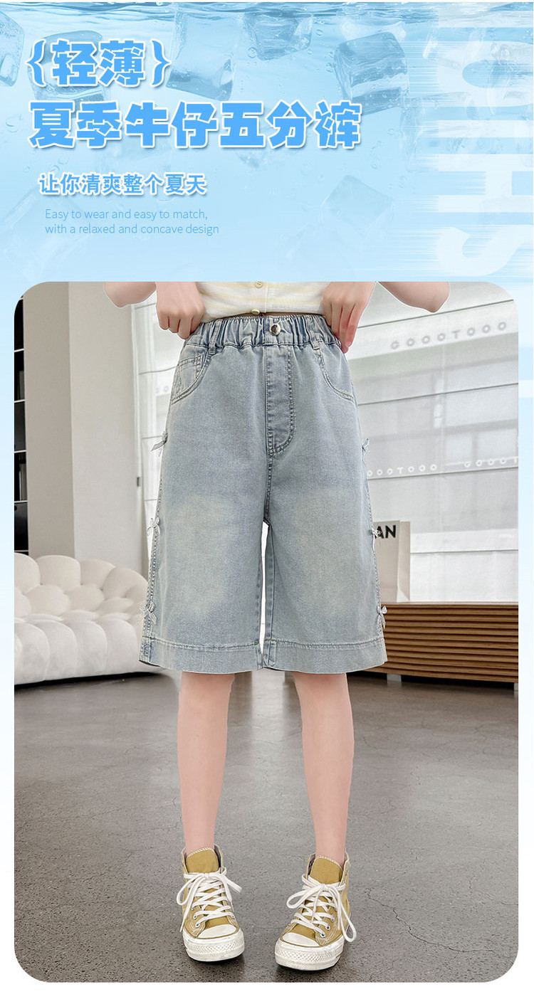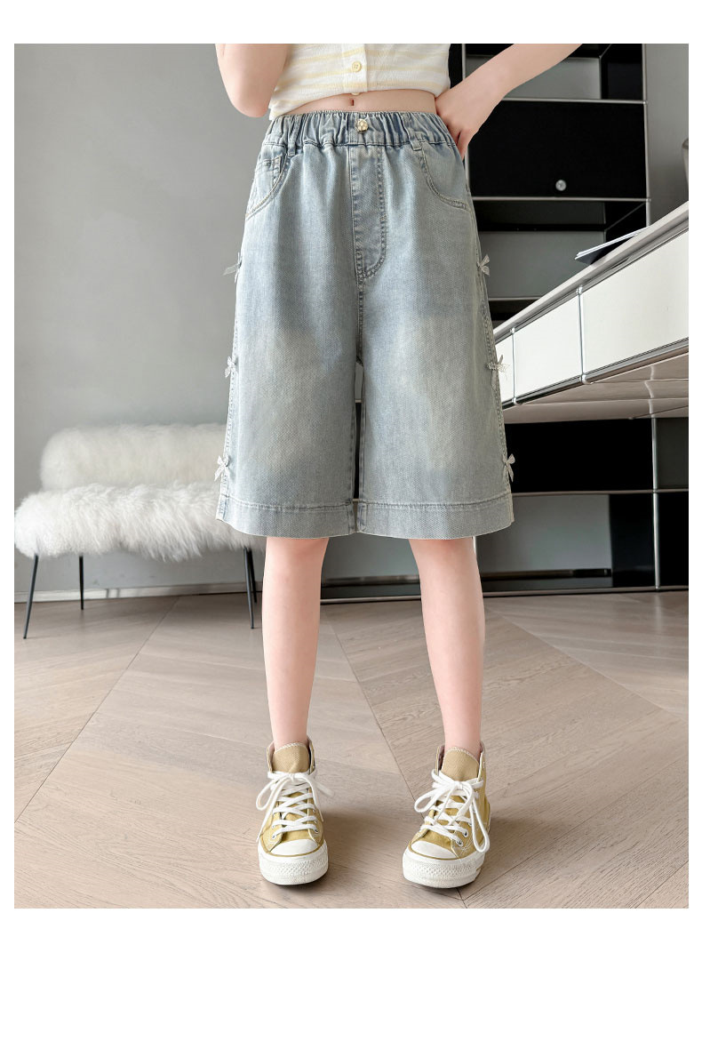 소녀의 여름 데님 중간 길이 바지 2025 새로운 세련된 패셔너블 사이드 활 중간 길이의 어린이 한국 반바지스토어 가기