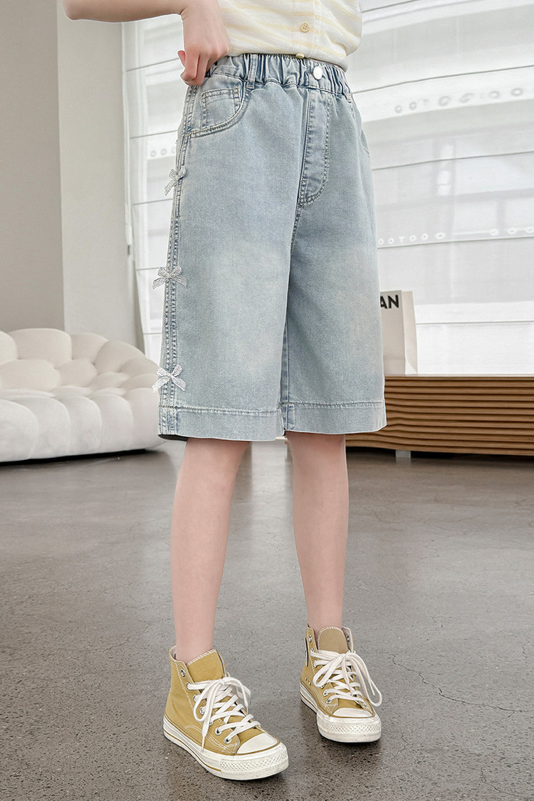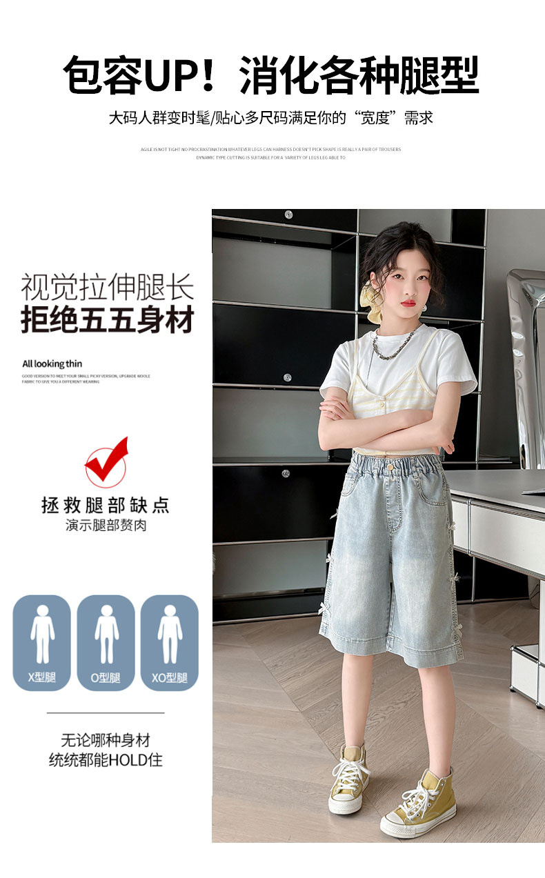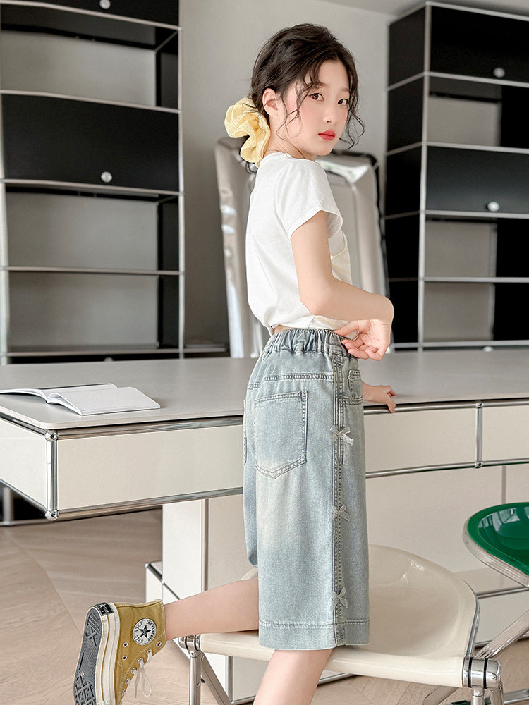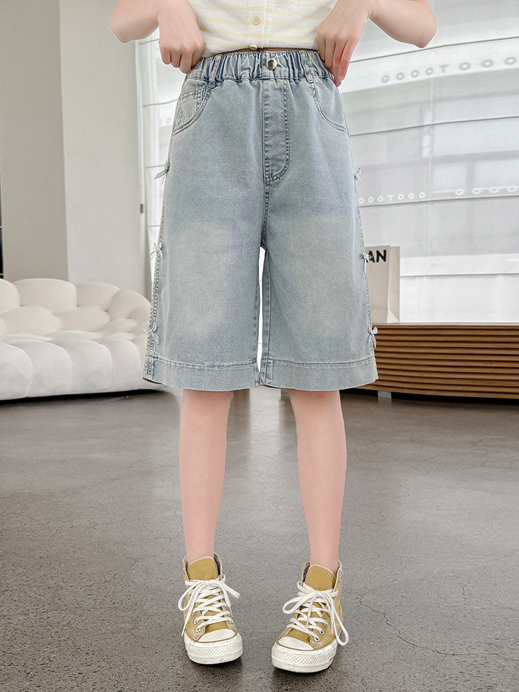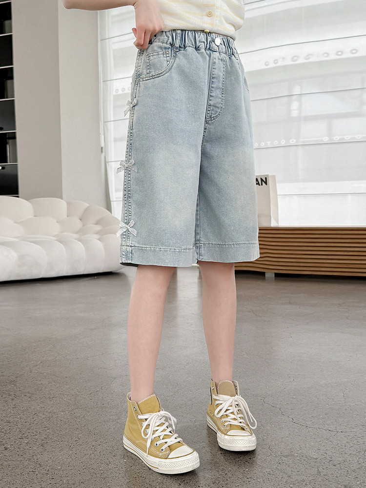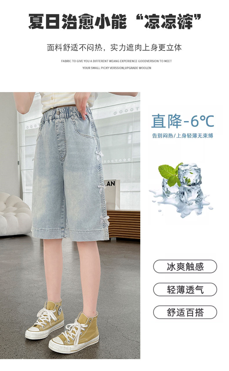 소녀의 여름 데님 중간 길이 바지 2025 새로운 세련된 패셔너블 사이드 활 중간 길이의 어린이 한국 반바지스토어 가기