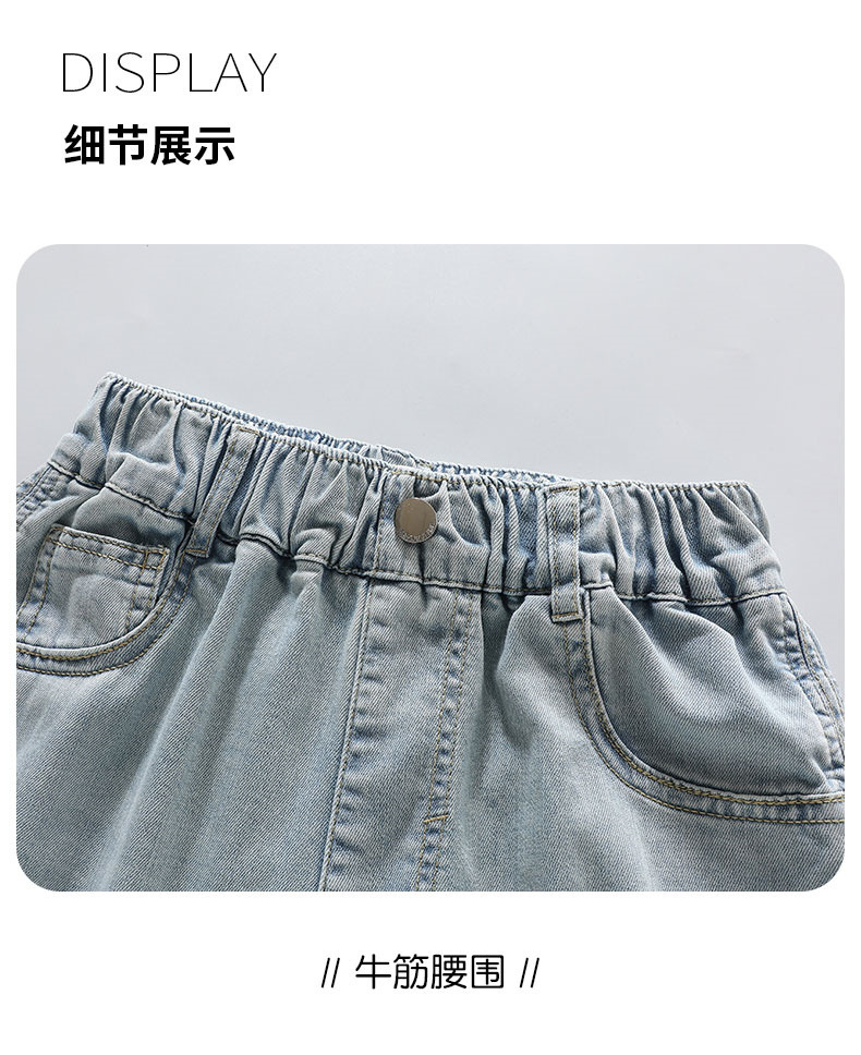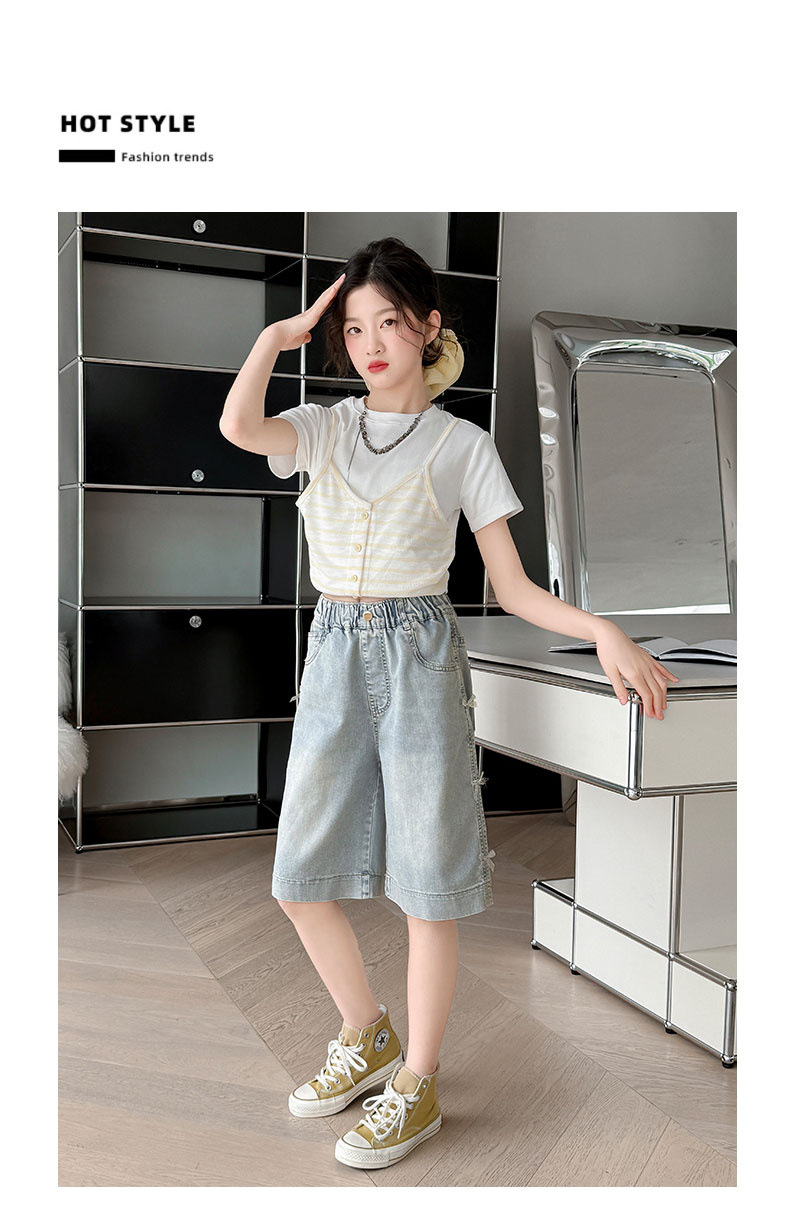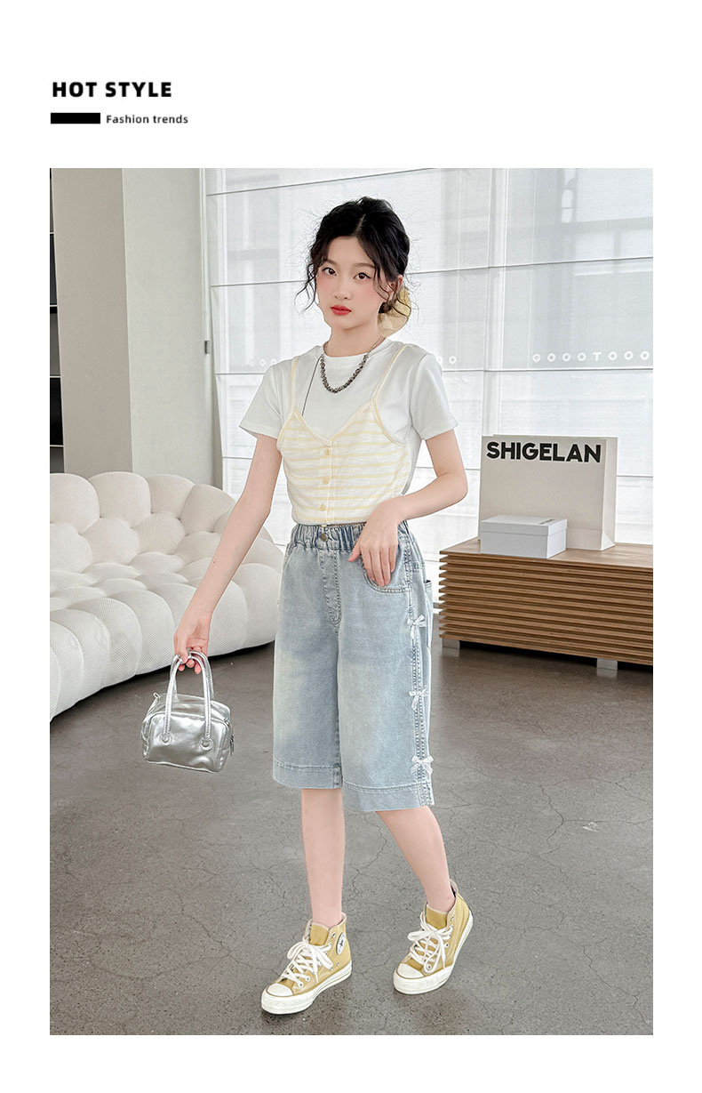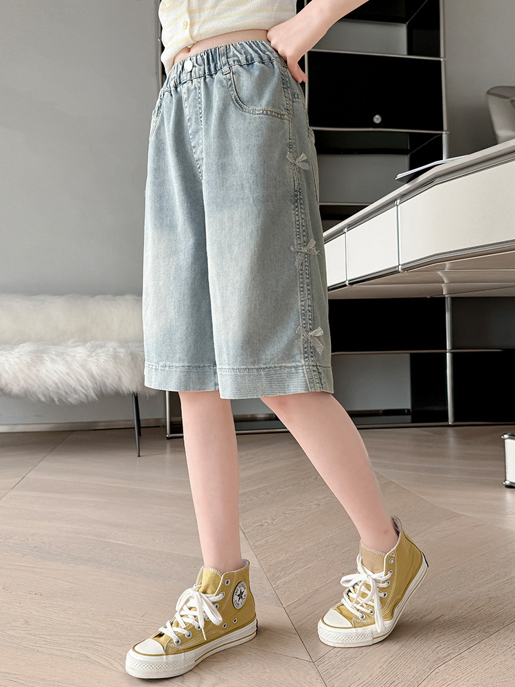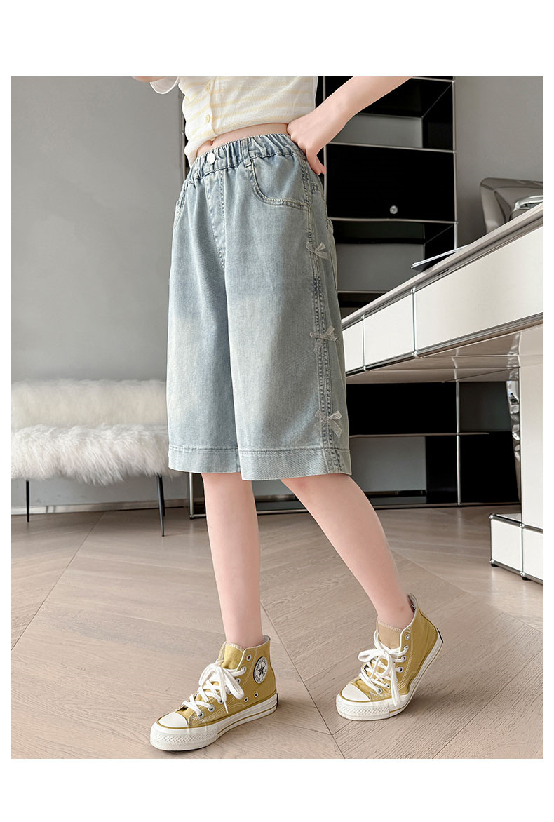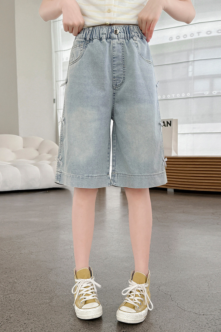 소녀의 여름 데님 중간 길이 바지 2025 새로운 세련된 패셔너블 사이드 활 중간 길이의 어린이 한국 반바지스토어 가기
