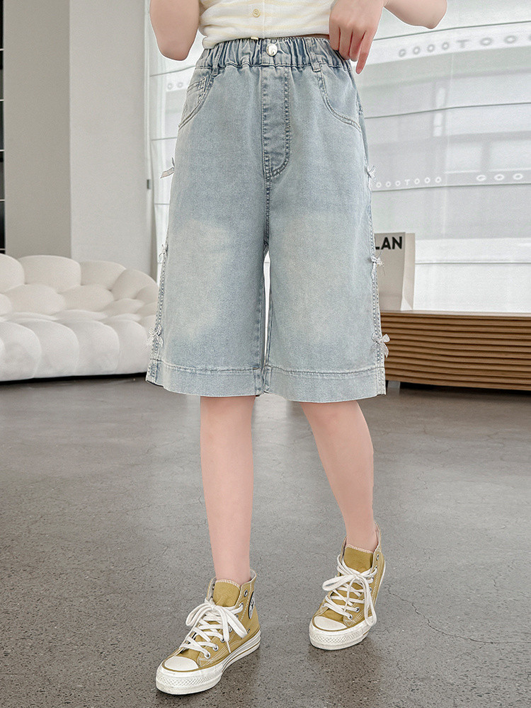 소녀의 여름 데님 중간 길이 바지 2025 새로운 세련된 패셔너블 사이드 활 중간 길이의 어린이 한국 반바지