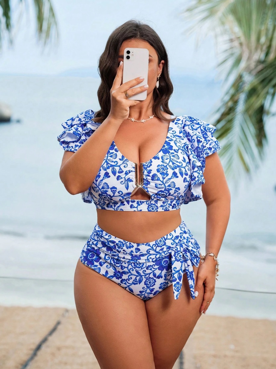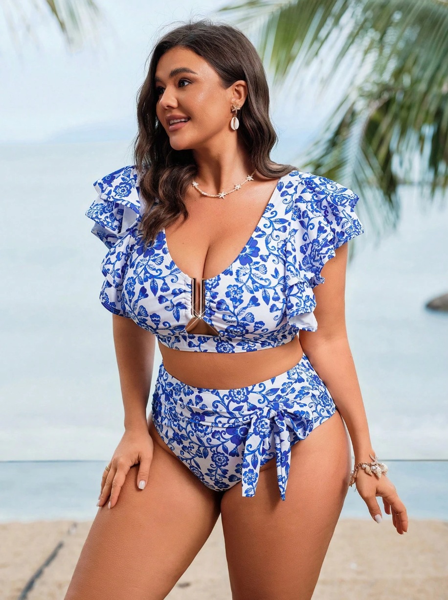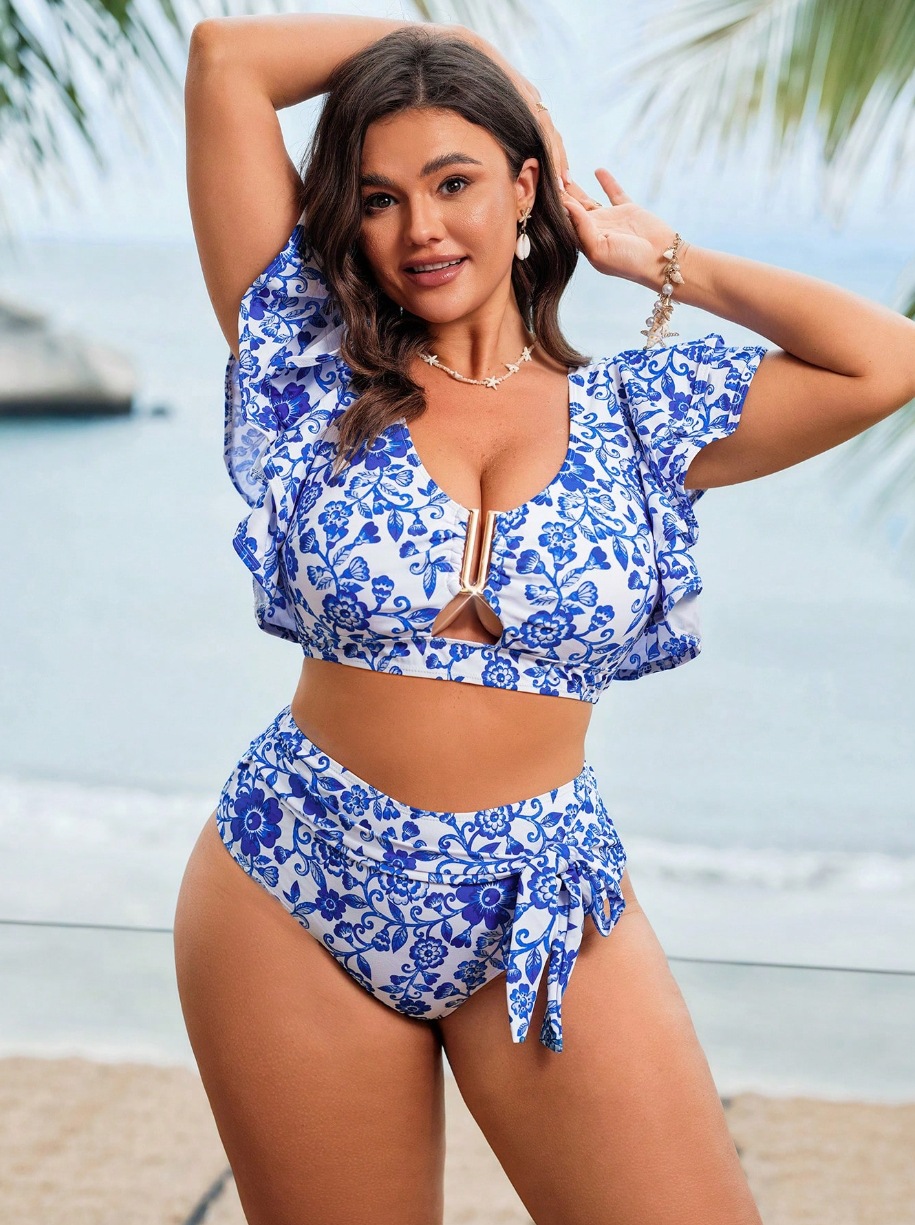 헤비 라인 스트랩 분할 수영복 여성 2025 새로운 유럽과 미국의 빈티지 인쇄 비키니 플러스 사이즈 휴일 세트