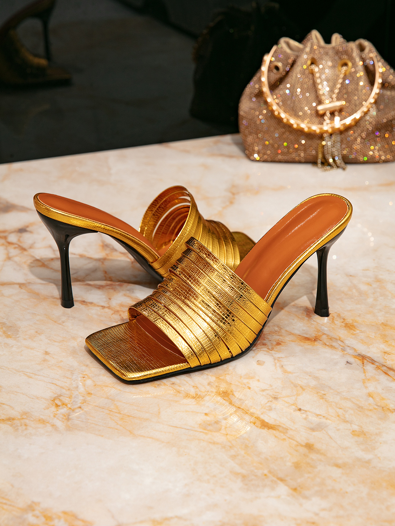 여성 하이힐 샌들 패션 스퀘어 토 골드 하이힐 여성 신발 스틸레토 샌들 슬립 온 간단한 외출 여성 신발스토어 가기