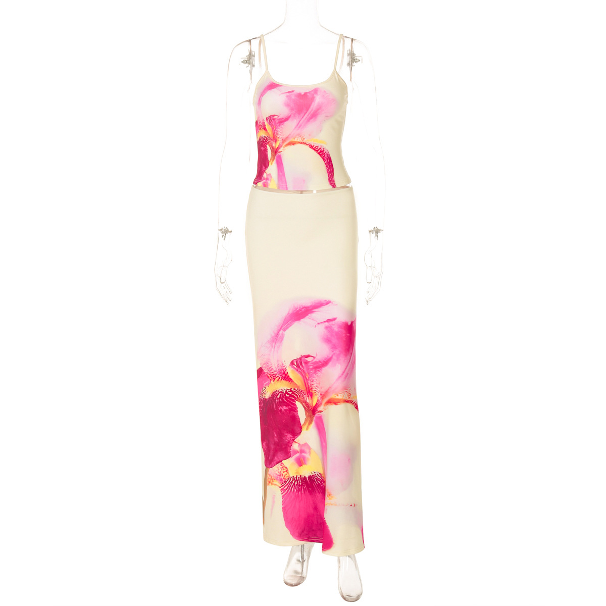 유럽과 미국 스타일의 여성 의류 2025 봄과 여름 새로운 꽃 프린트 민소매 캐미솔 하이 웨이스트 스커트 투피스 세트