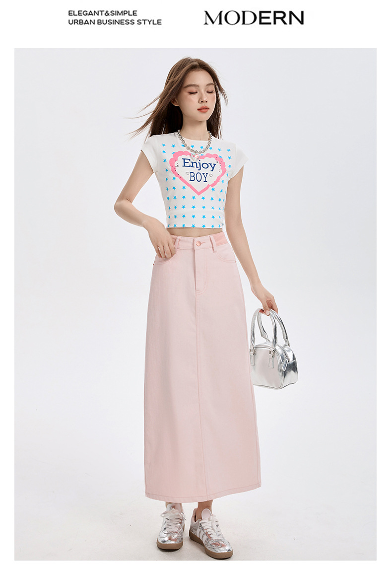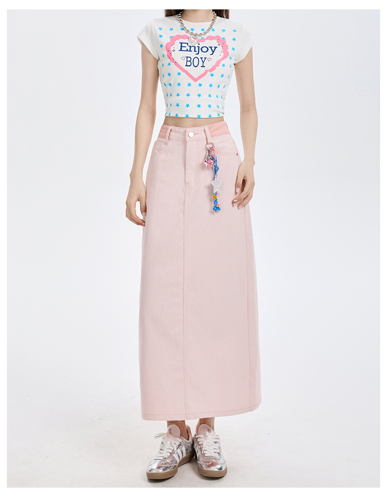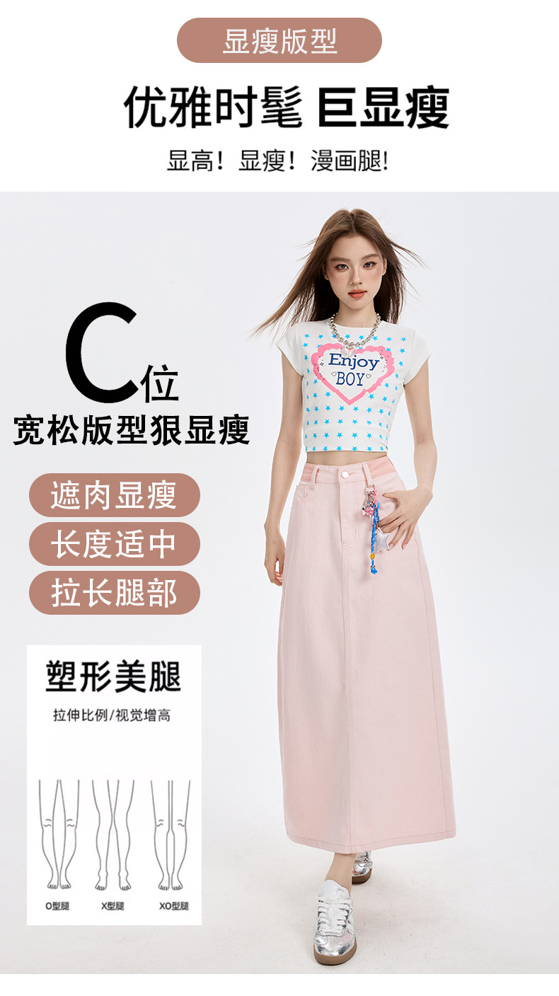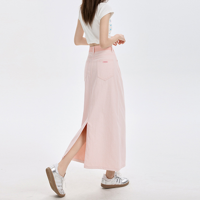 여름 여성을 위한 사쿠라 핑크 하이웨이스트 슬림 데님 스커트 뉴 백 슬릿 중간 길이 다용도 힙 커버 A라인 스커트