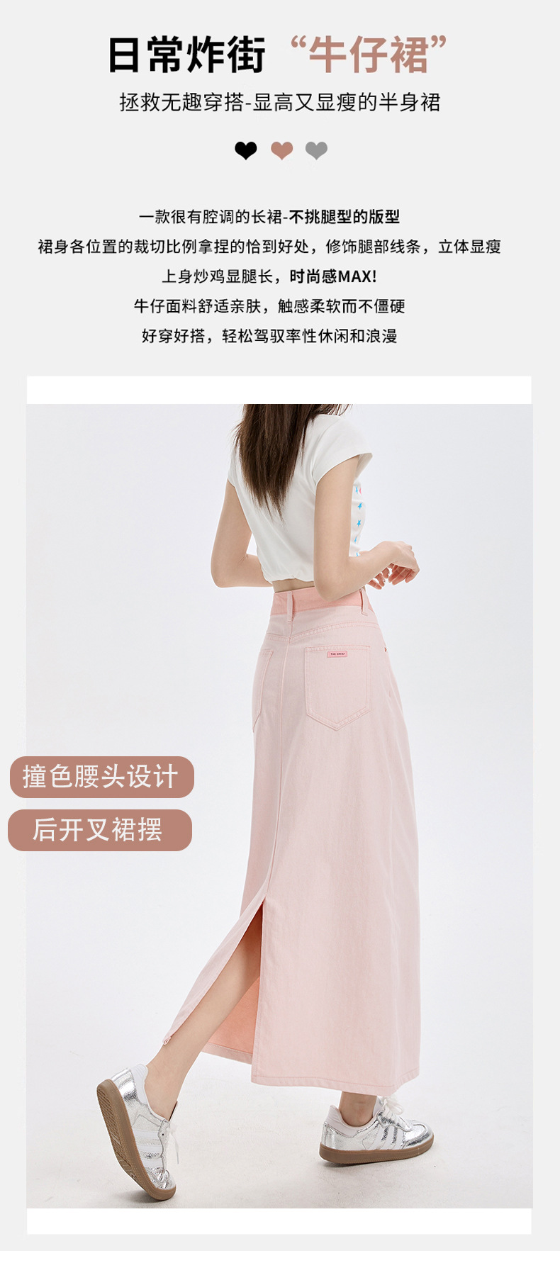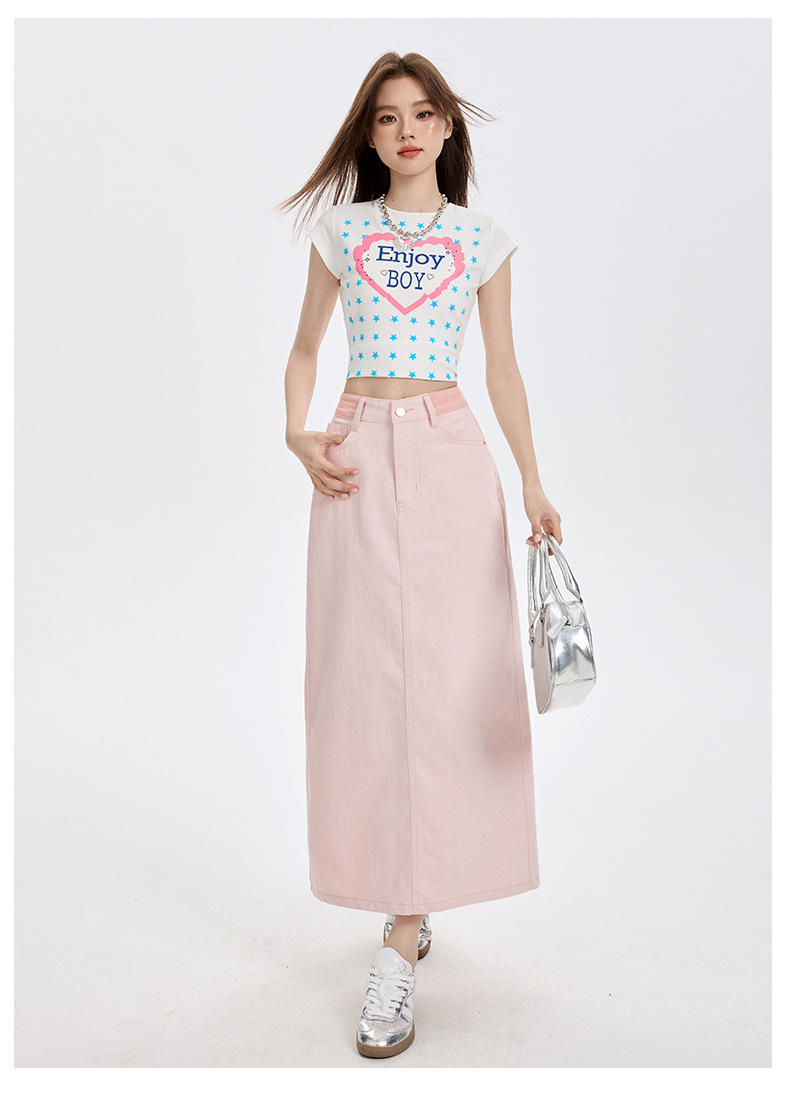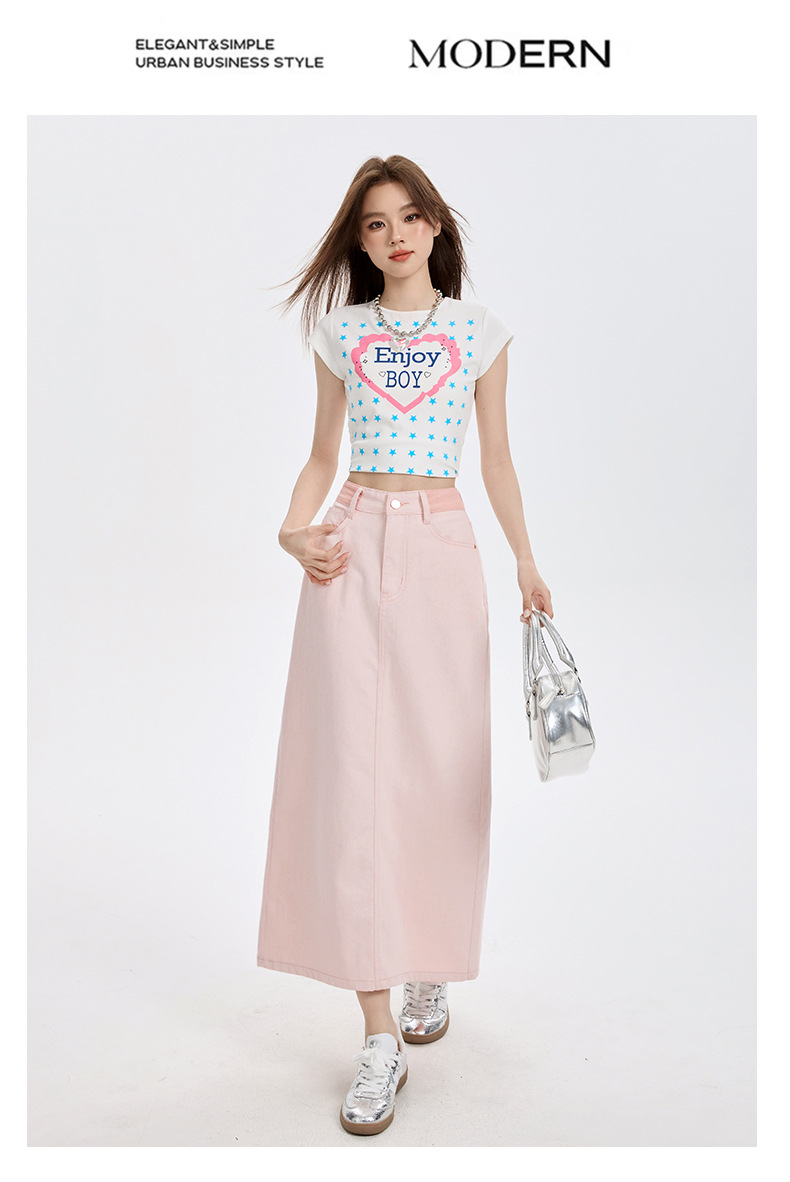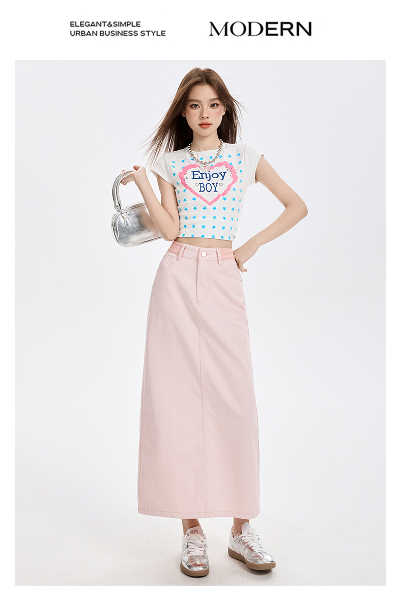여름 여성을 위한 사쿠라 핑크 하이웨이스트 슬림 데님 스커트 뉴 백 슬릿 중간 길이 다용도 힙 커버 A라인 스커트