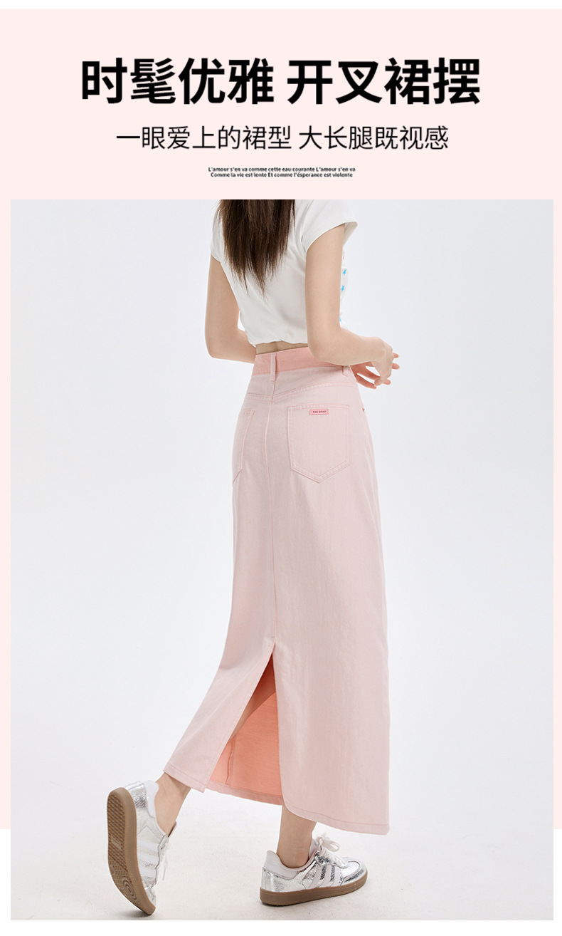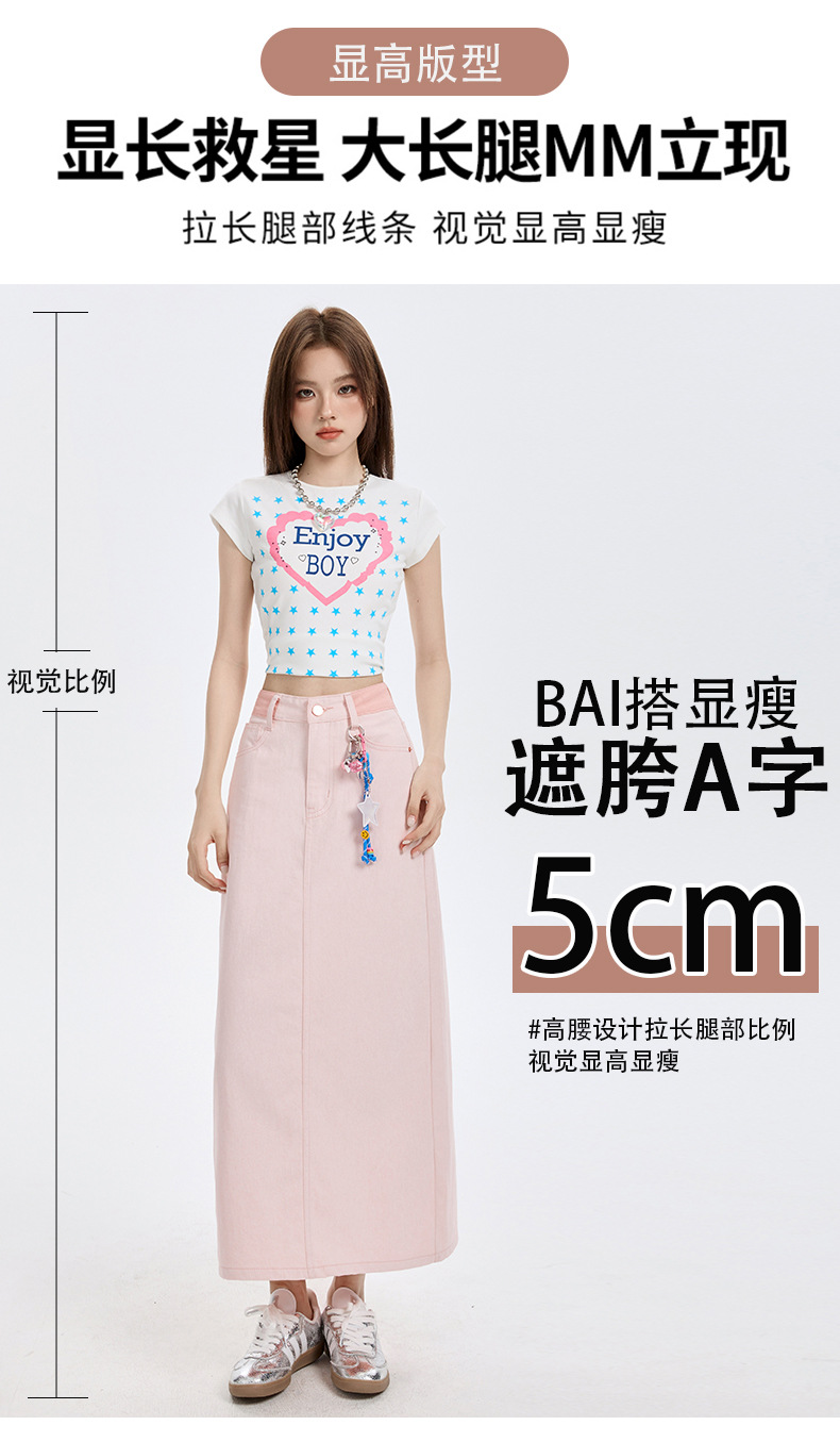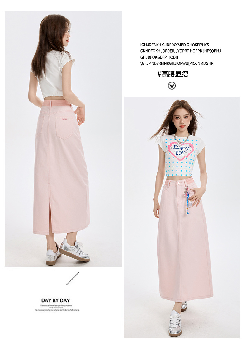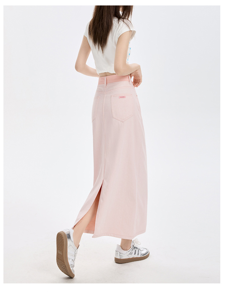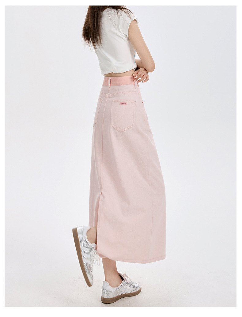 여름 여성을 위한 사쿠라 핑크 하이웨이스트 슬림 데님 스커트 뉴 백 슬릿 중간 길이 다용도 힙 커버 A라인 스커트스토어 가기