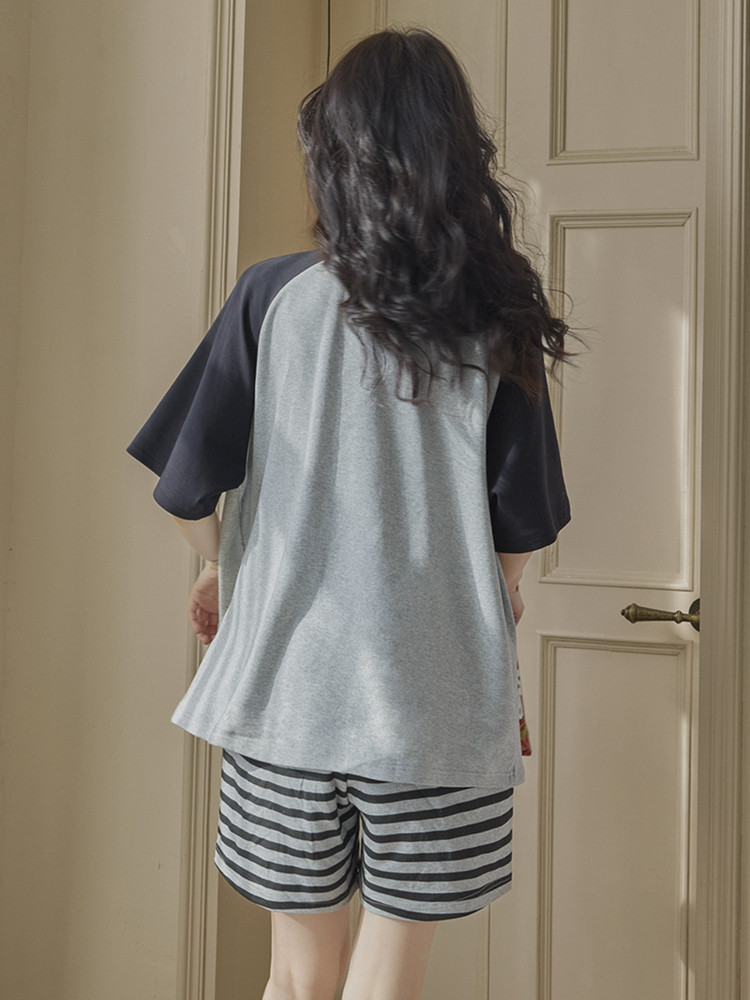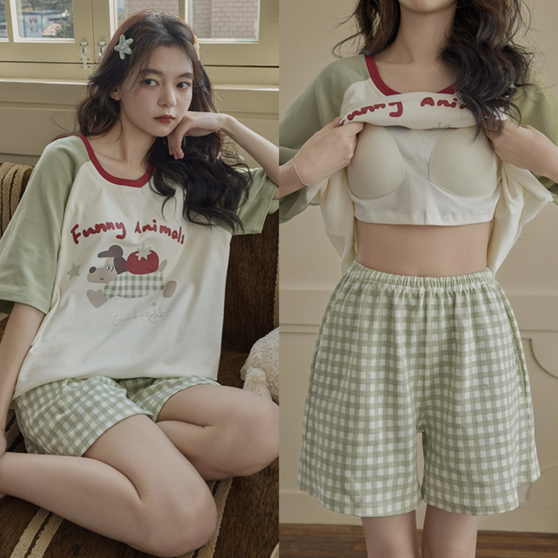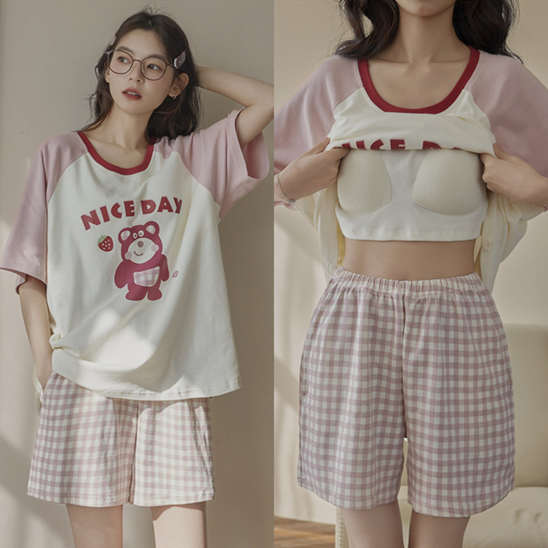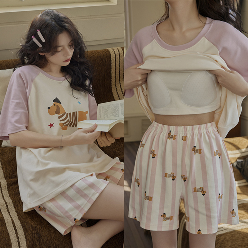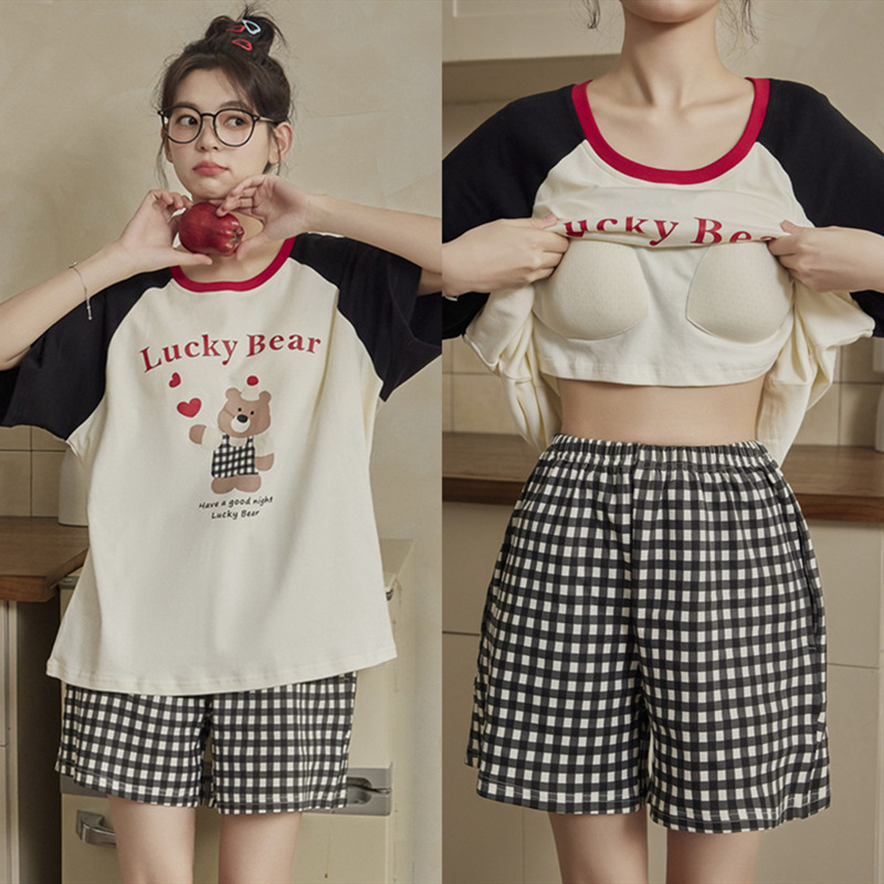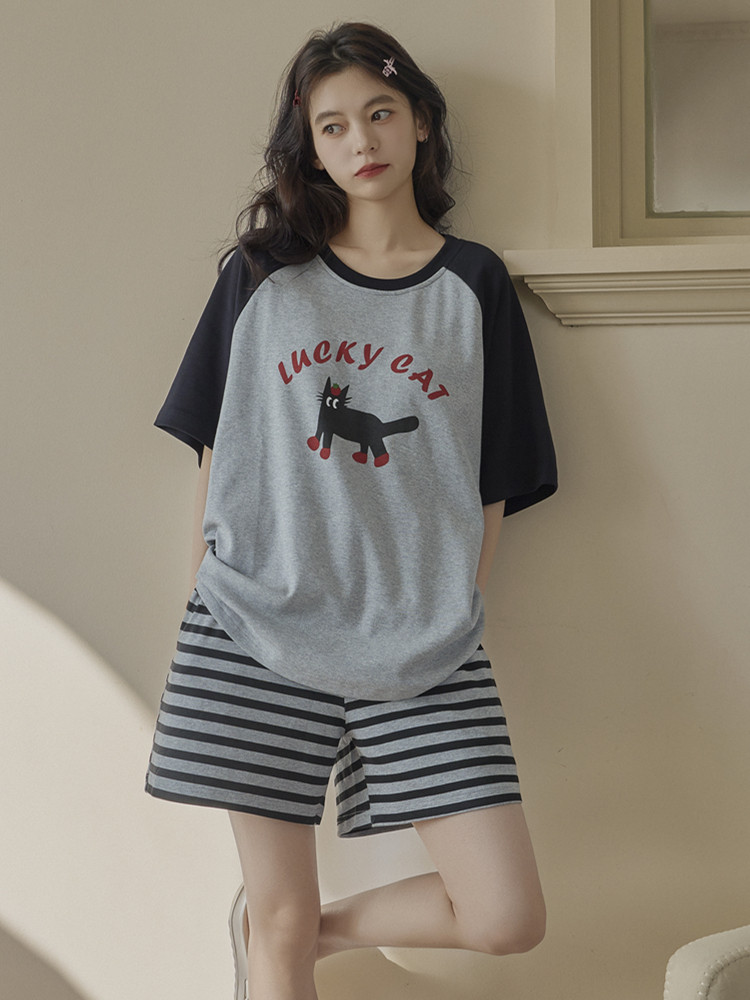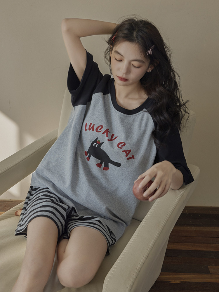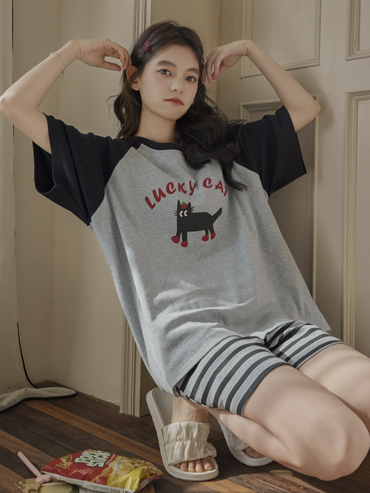 여성용 잠옷 여름 순수 코튼 반팔 가슴 패드 일체형 2025 새로운 여름 만화 검은 고양이 홈웨어 세트
