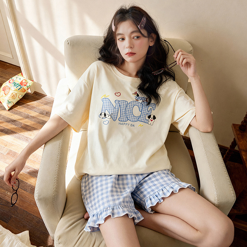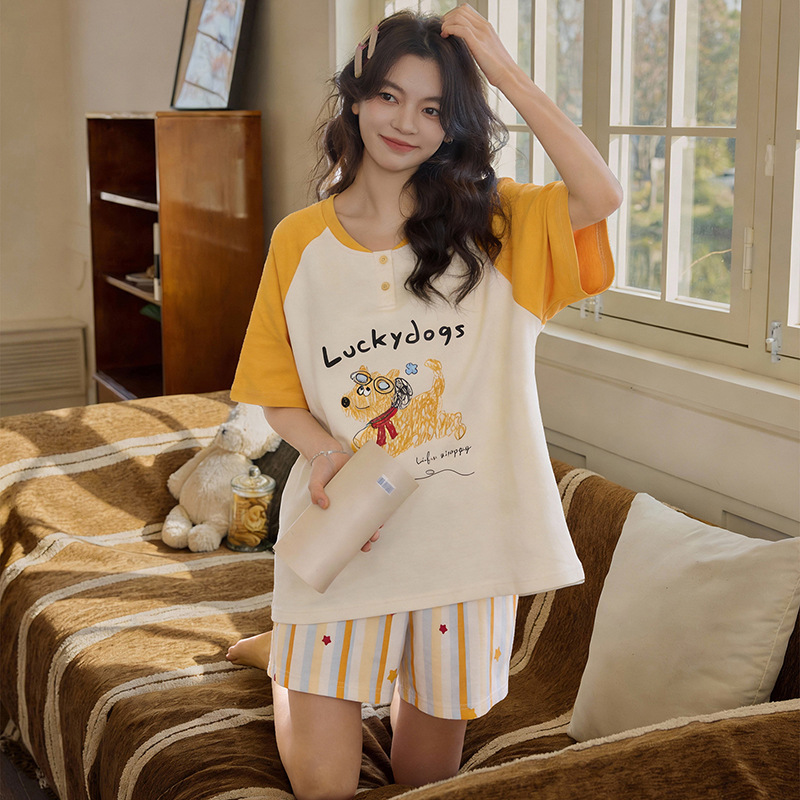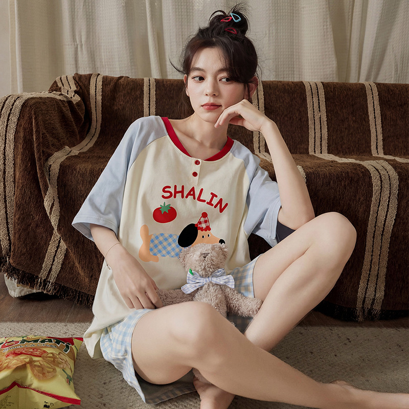 여성용 잠옷 여름 순수 코튼 반팔 가슴 패드 일체형 2025 새로운 여름 만화 검은 고양이 홈웨어 세트스토어 가기