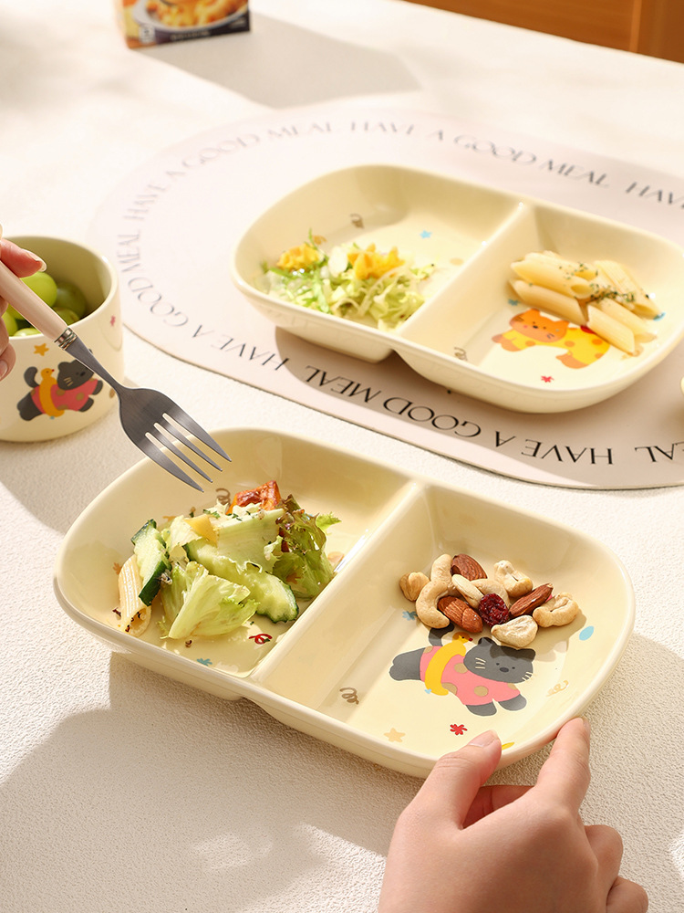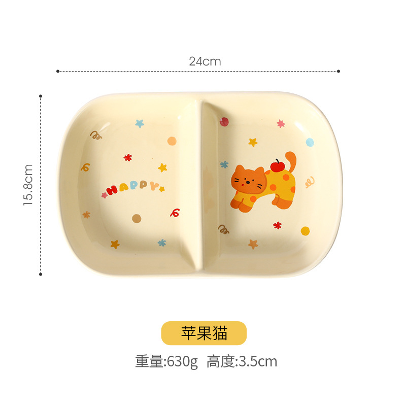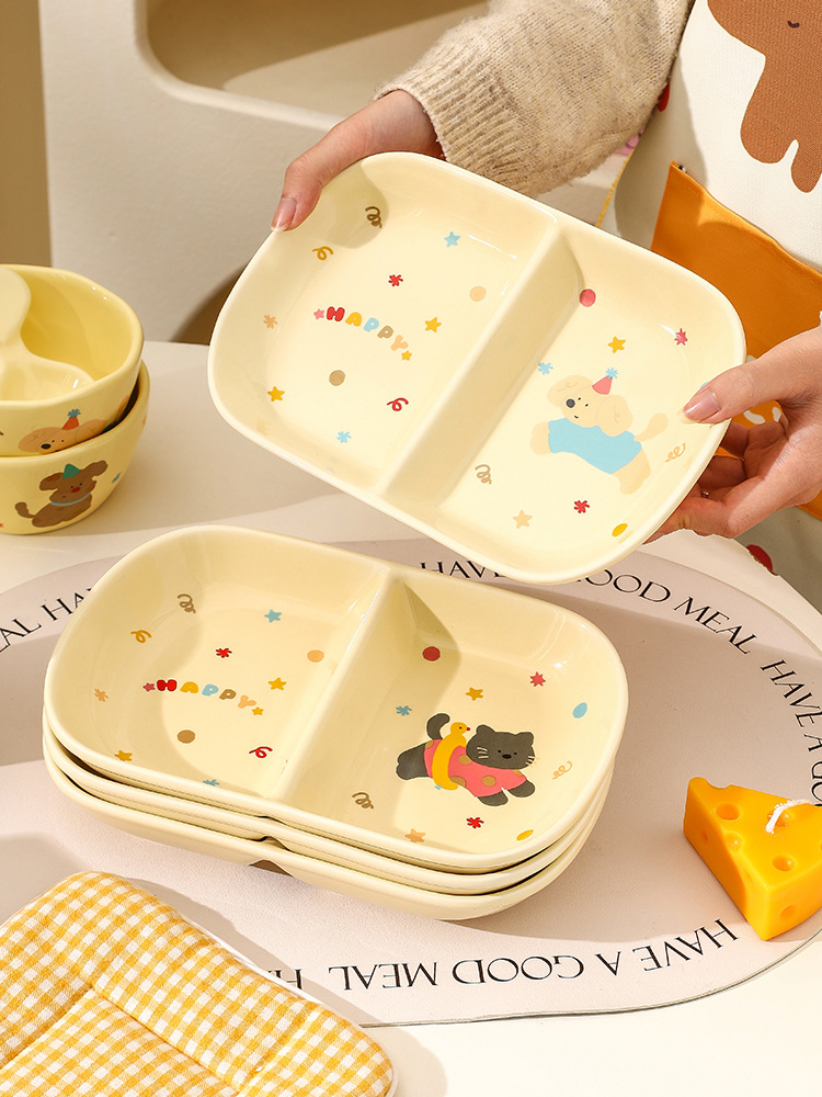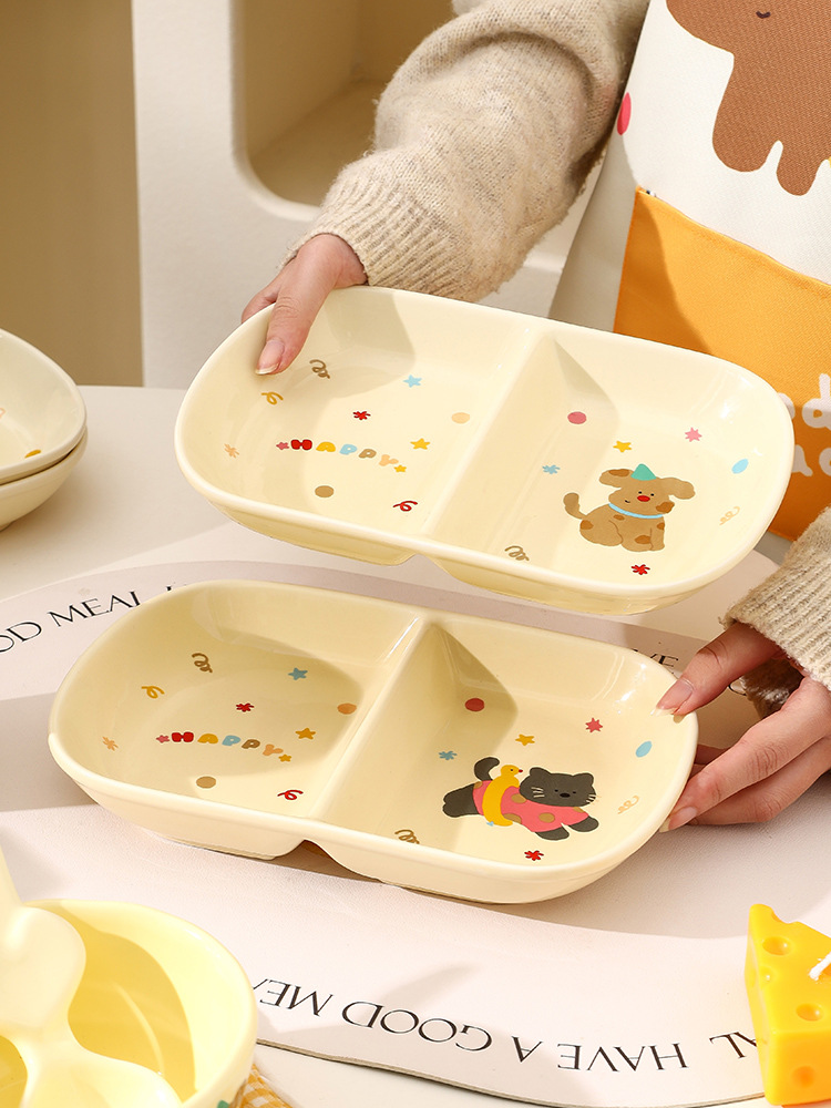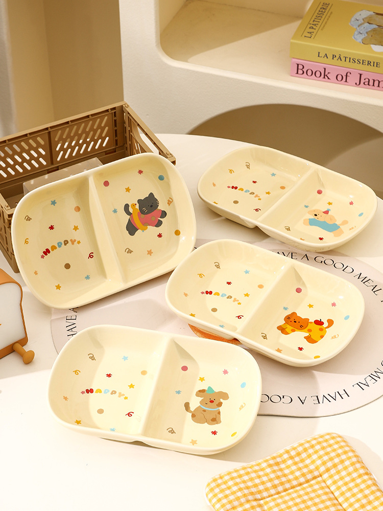 귀여운 고양이와 강아지 1인용 분할 접시, 어린이 접시, 가정용 분할 접시, 성인용 지방 감량 세라믹 아침 식사 접시스토어 가기