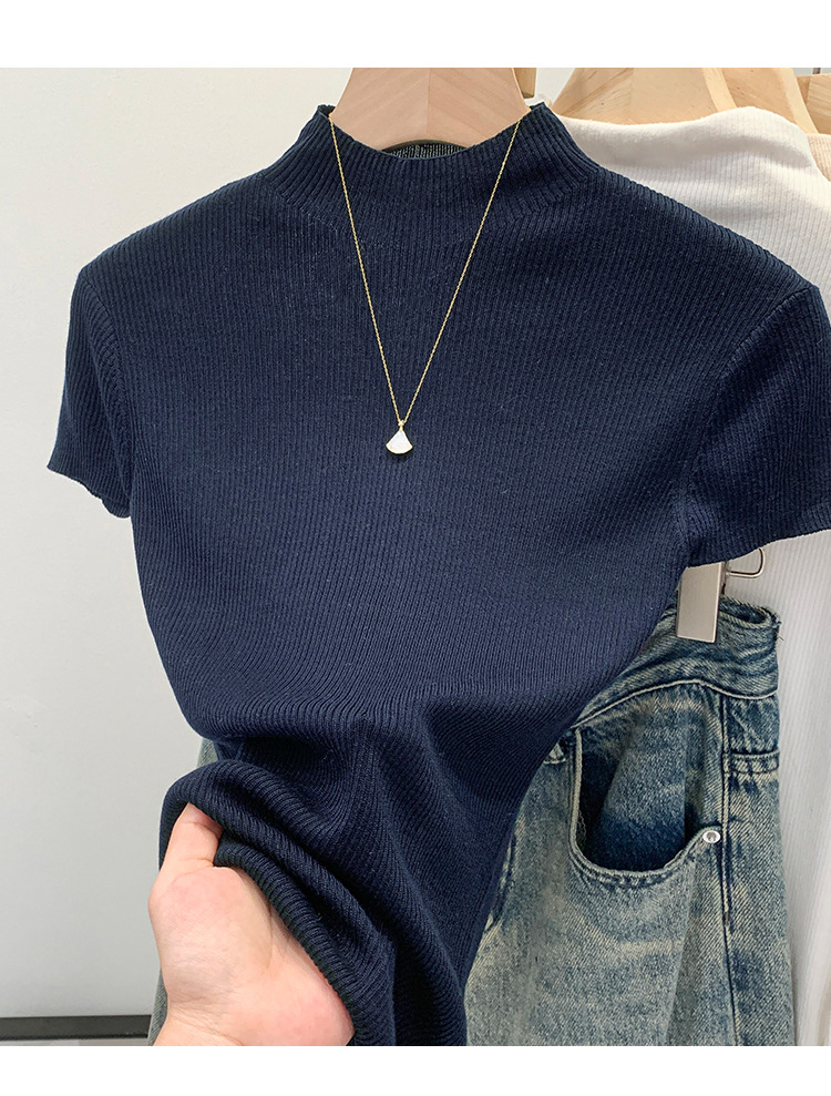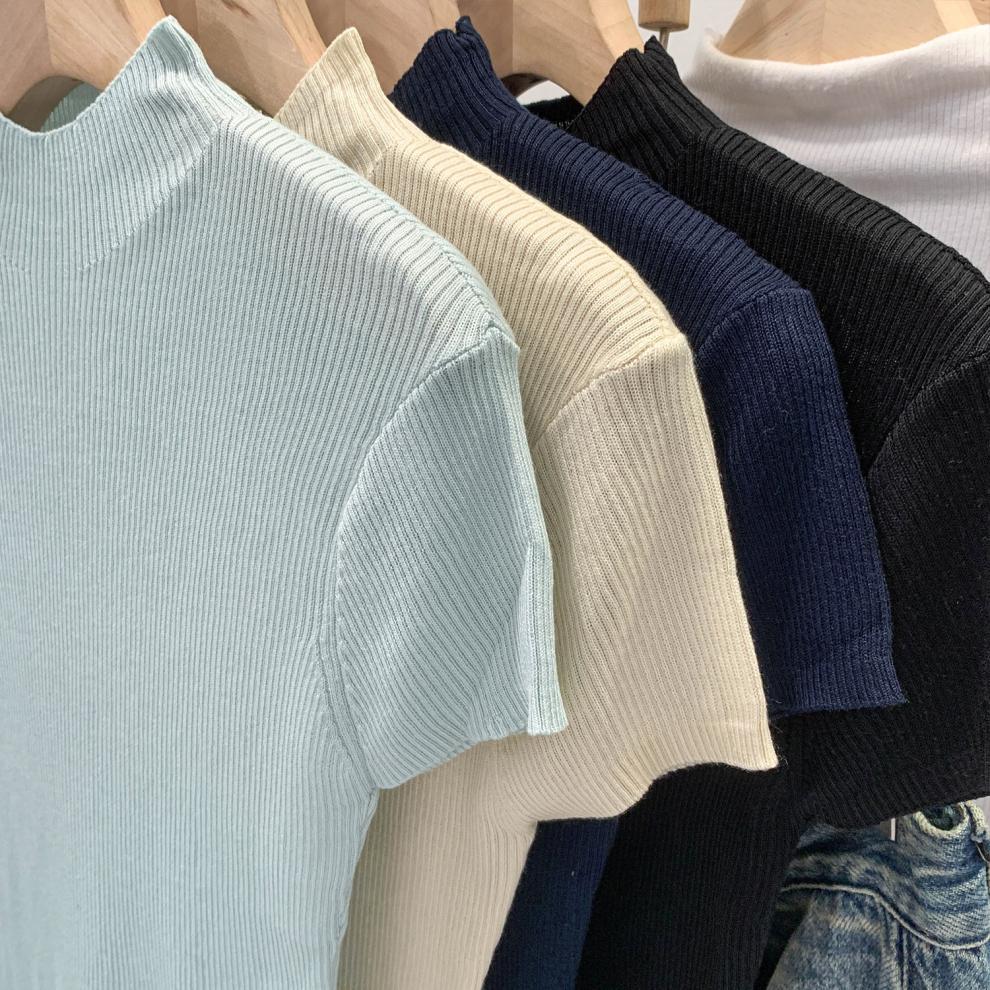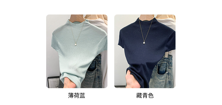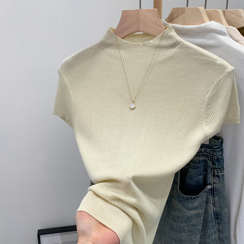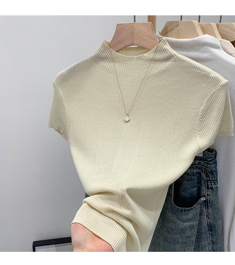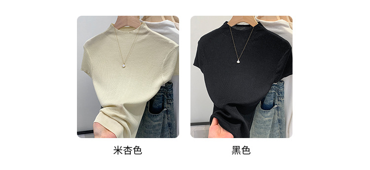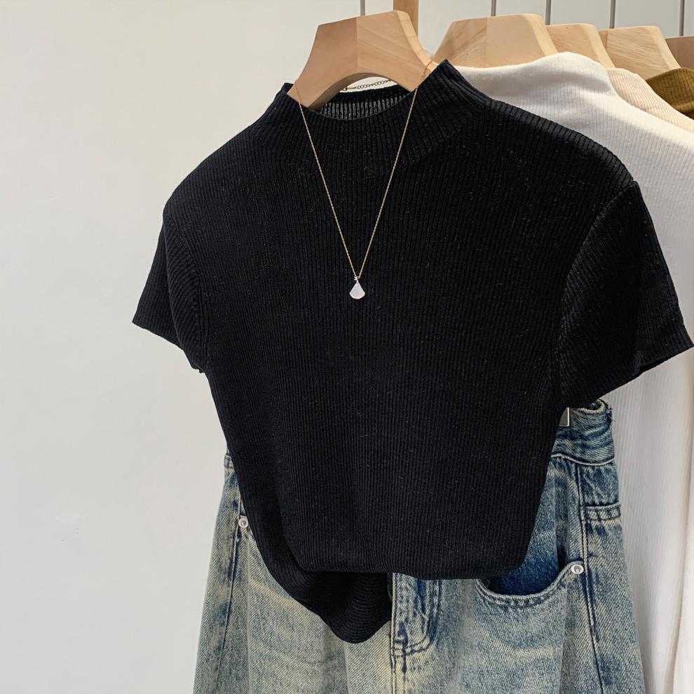 공장 직접 판매 Lyocell Tencel 프렌치 하프 터틀넥 오른쪽 어깨 반팔 스웨터 여성 통근 여름 새 스타일 싱글웨어스토어 가기