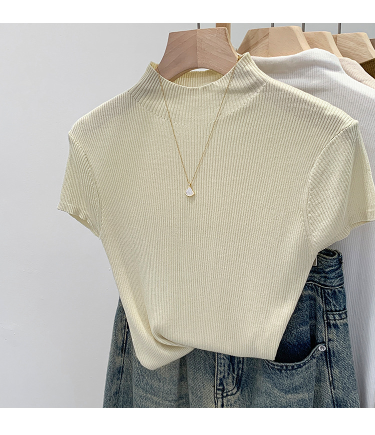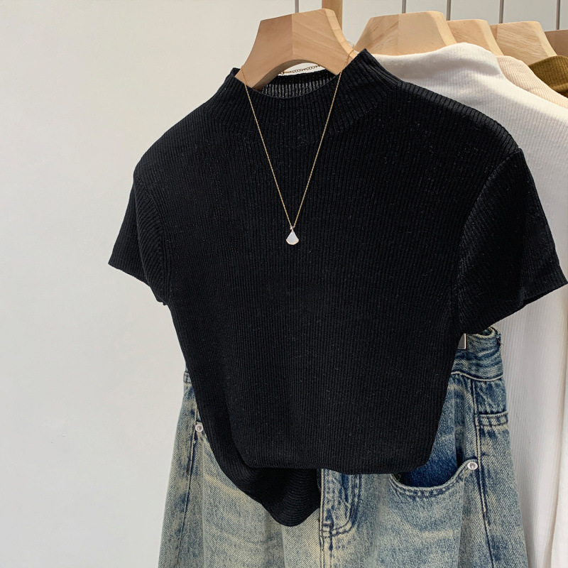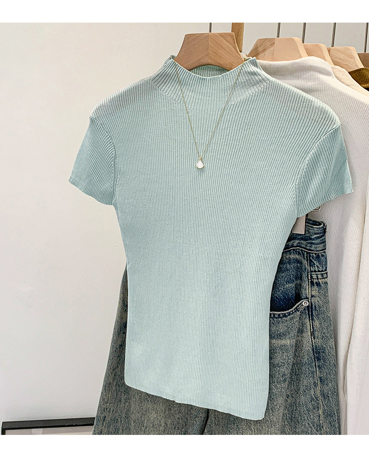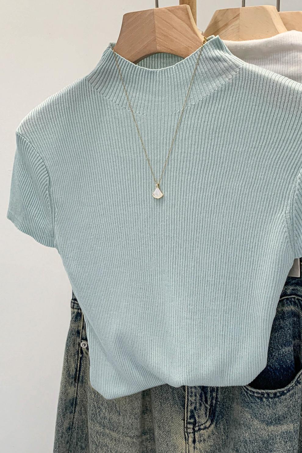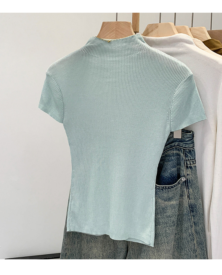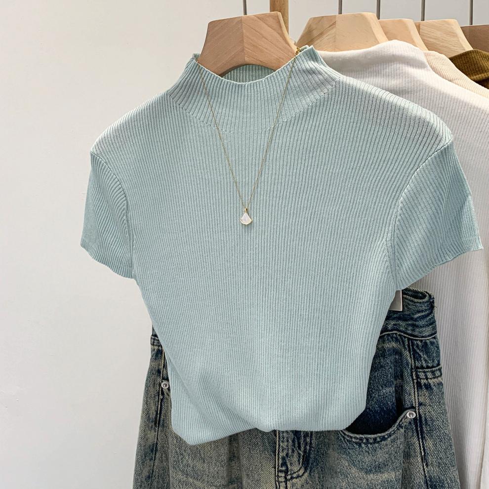 공장 직접 판매 Lyocell Tencel 프렌치 하프 터틀넥 오른쪽 어깨 반팔 스웨터 여성 통근 여름 새 스타일 싱글웨어
