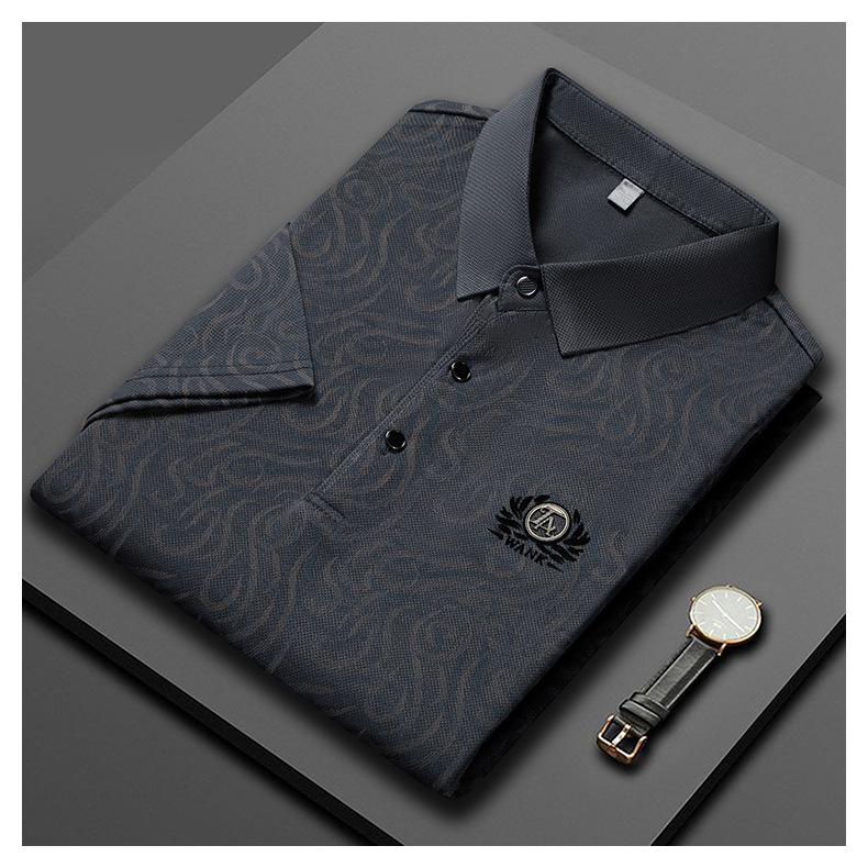 여름 신작 남성 반팔 폴로 셔츠 라펠 비즈니스 캐주얼 얇은 프린트 아이스 실크 반팔 티셔츠 남성 의류