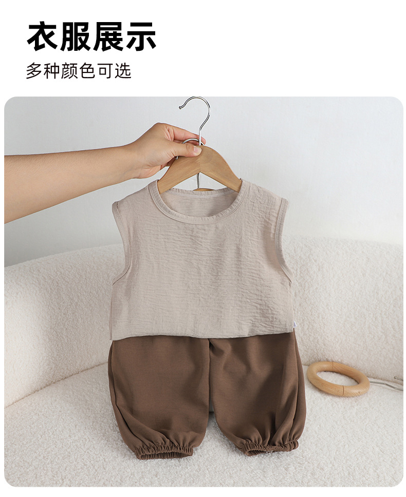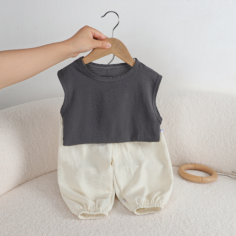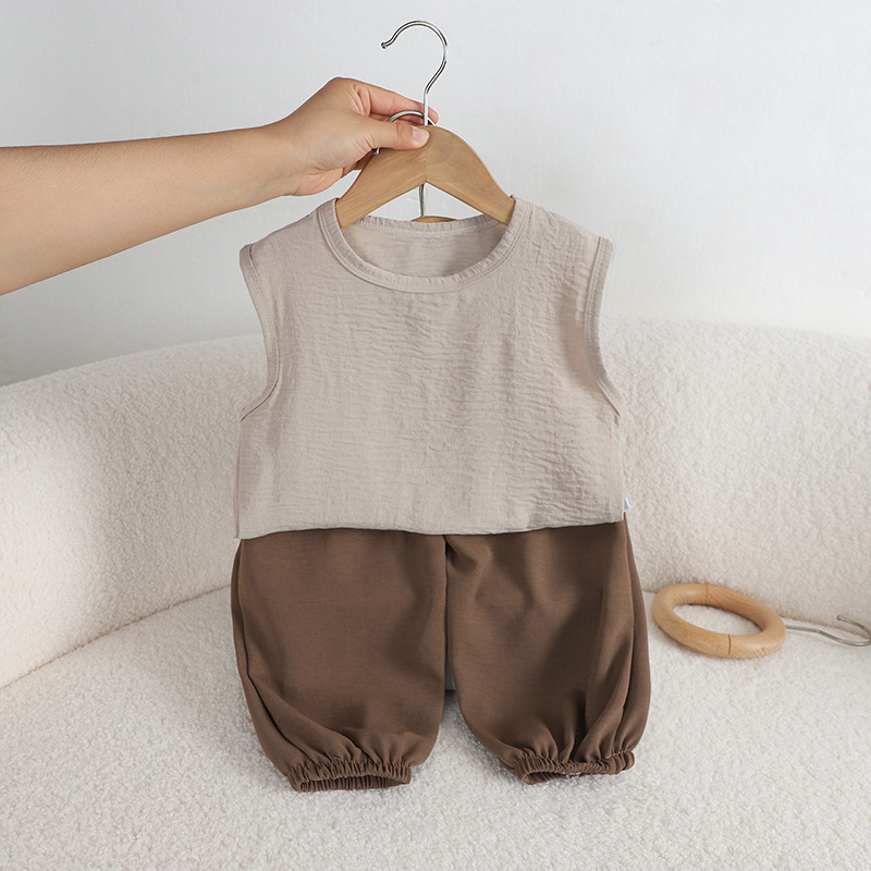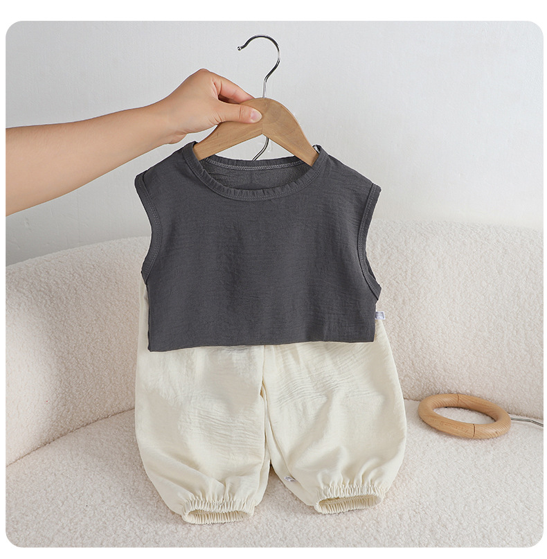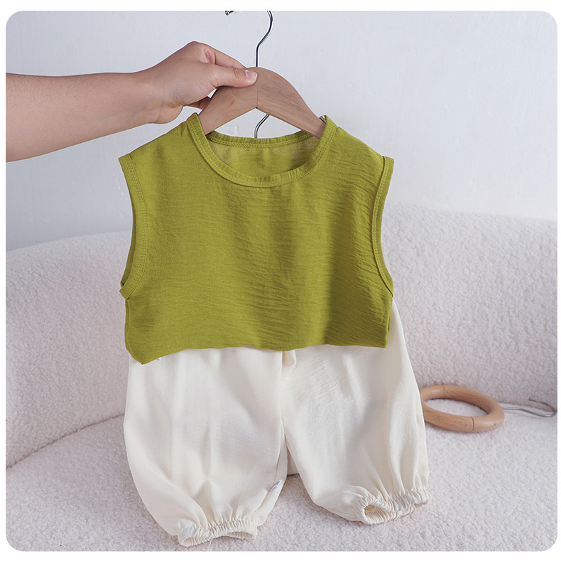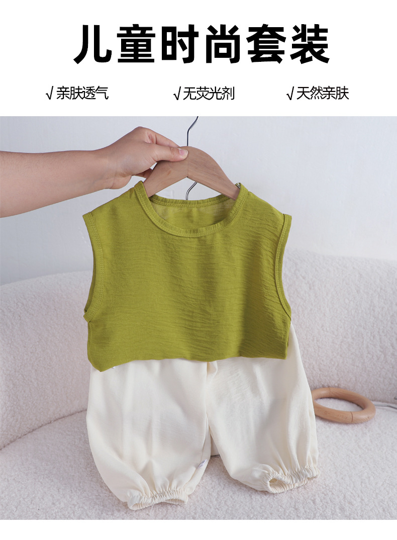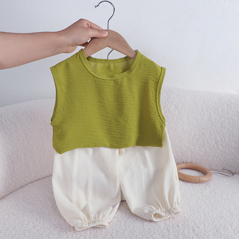 어린이 여름 올 매치 조끼 세트 소년 소녀 아이스 실크 린넨 민소매 T 랜턴 바지 투피스 도매