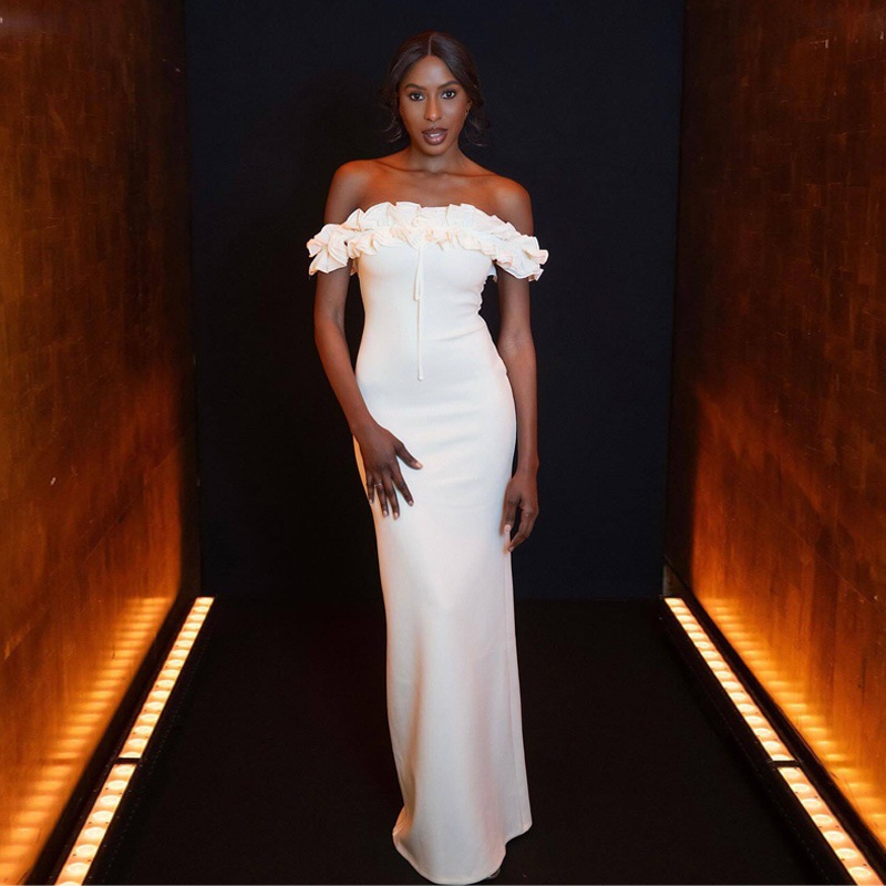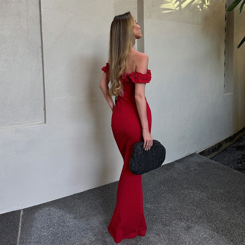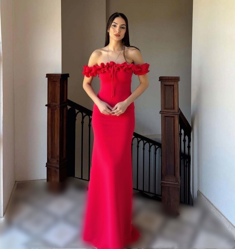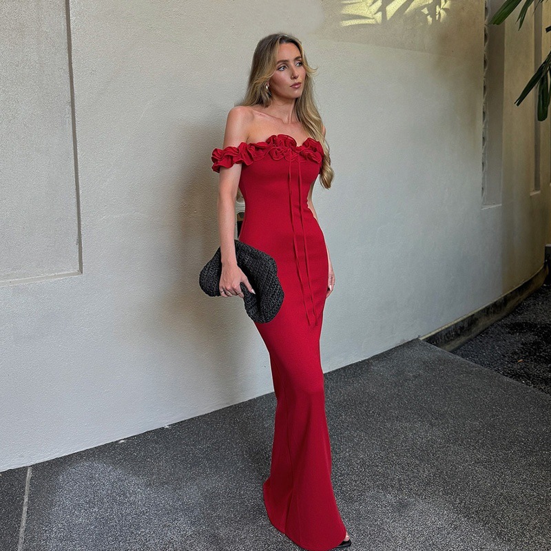 2025년 여름 신상품, 퓨어 러스티 오프숄더 프릴 디자인, 바디라인을 돋보이게 해주는 스트랩 원피스