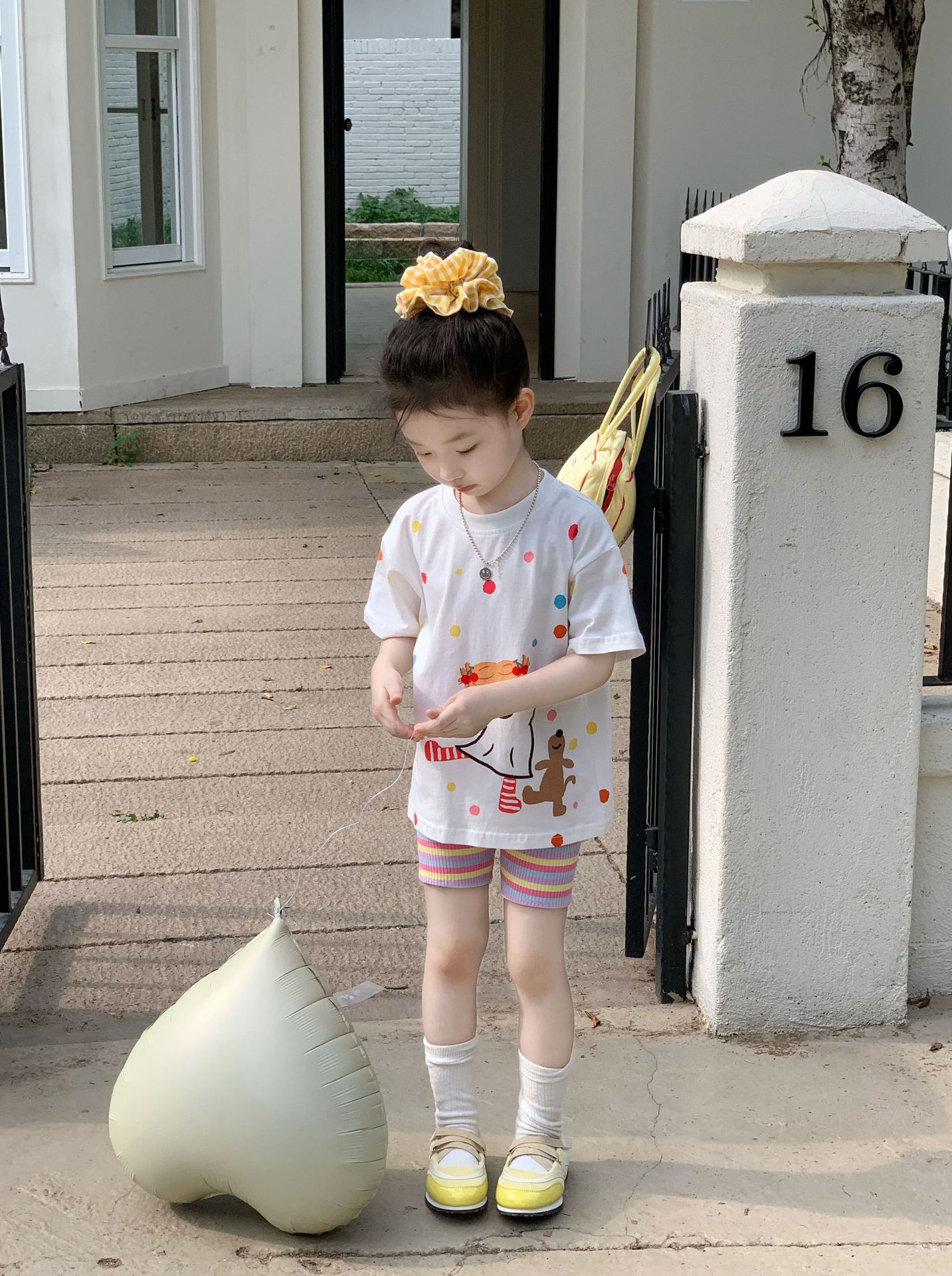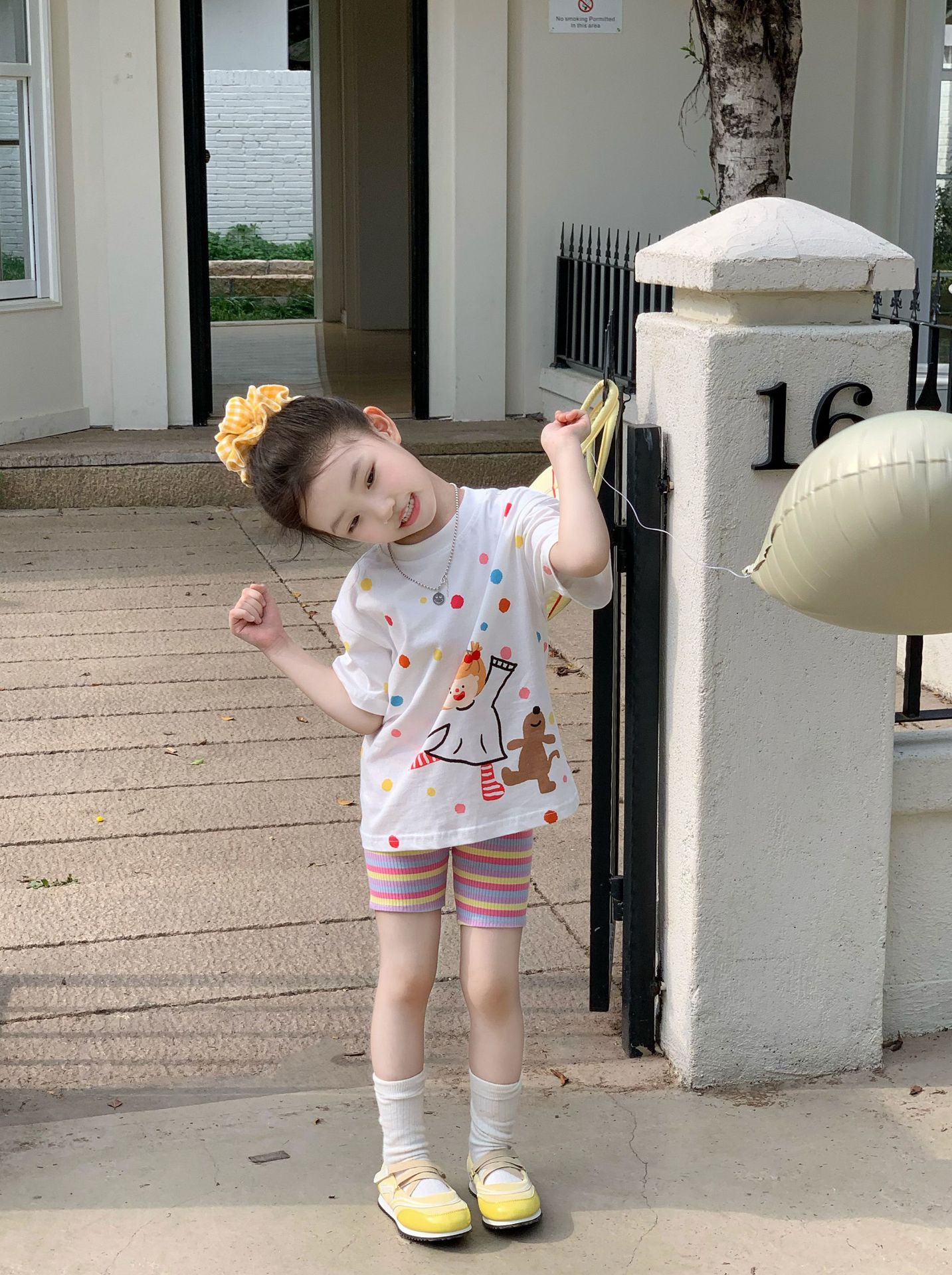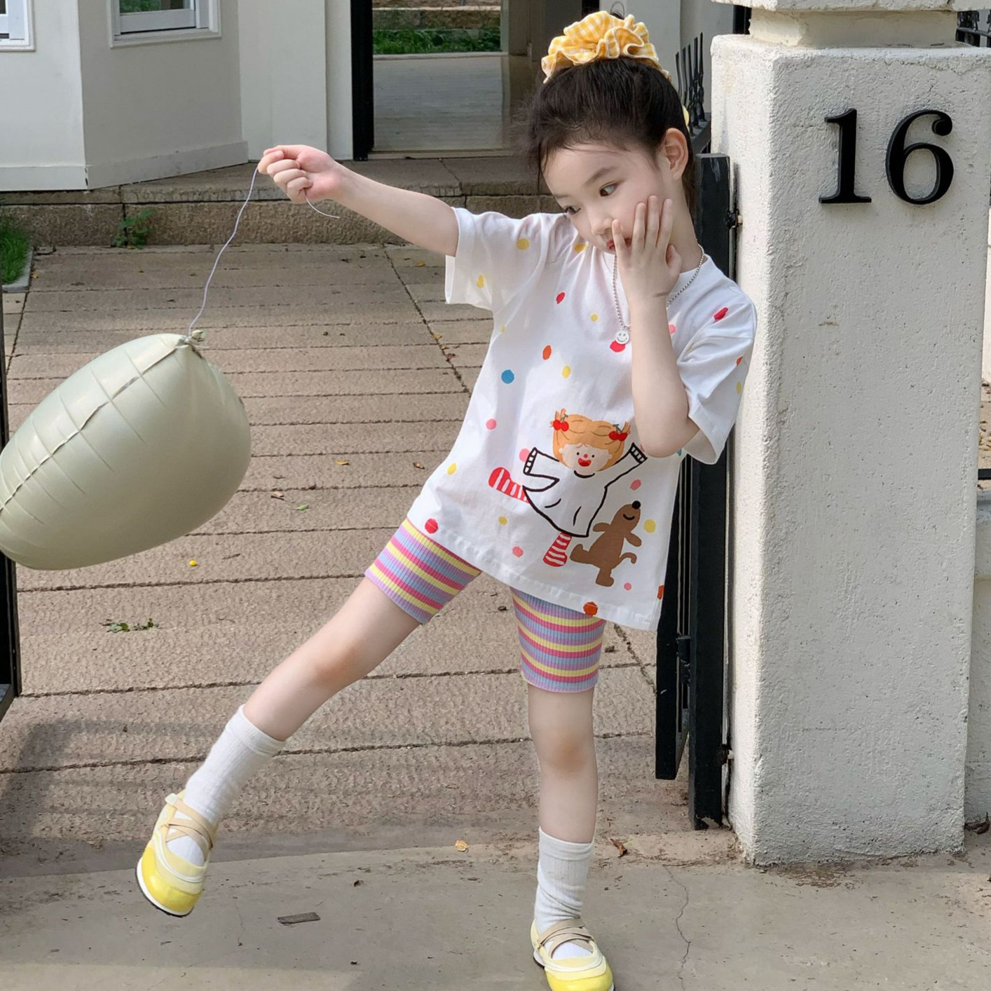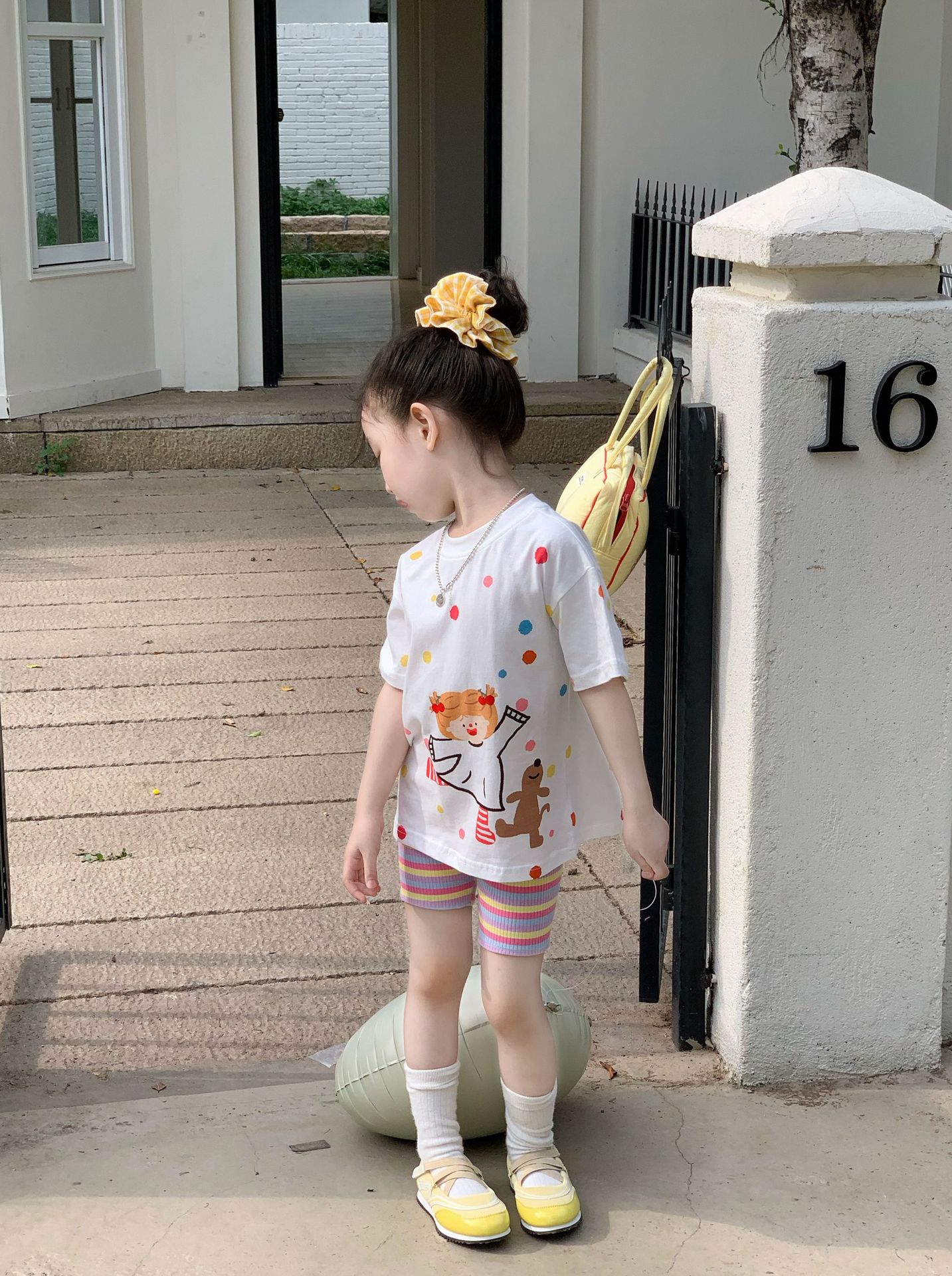 소녀 컬러 폴카 도트 티셔츠 중간 길이 2025 여름 아기 소녀를위한 새로운 한국식 만화 느슨한 스타일 탑스토어 가기