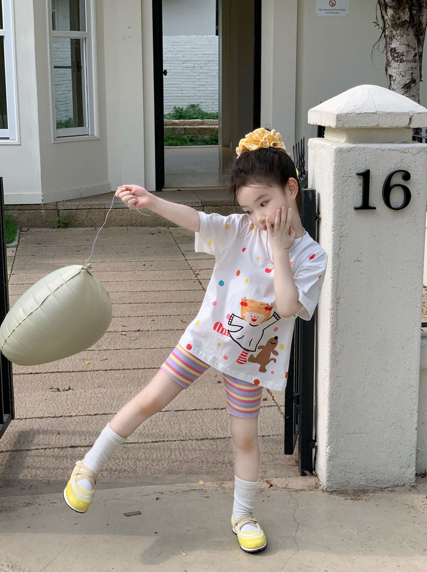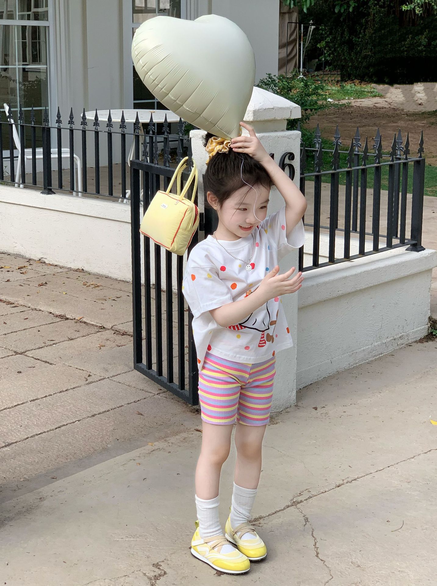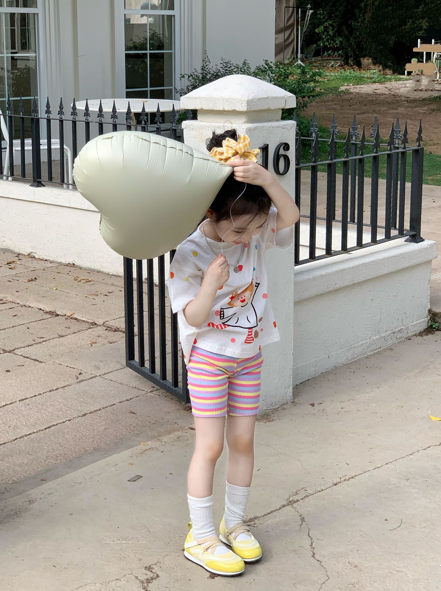 소녀 컬러 폴카 도트 티셔츠 중간 길이 2025 여름 아기 소녀를위한 새로운 한국식 만화 느슨한 스타일 탑스토어 가기